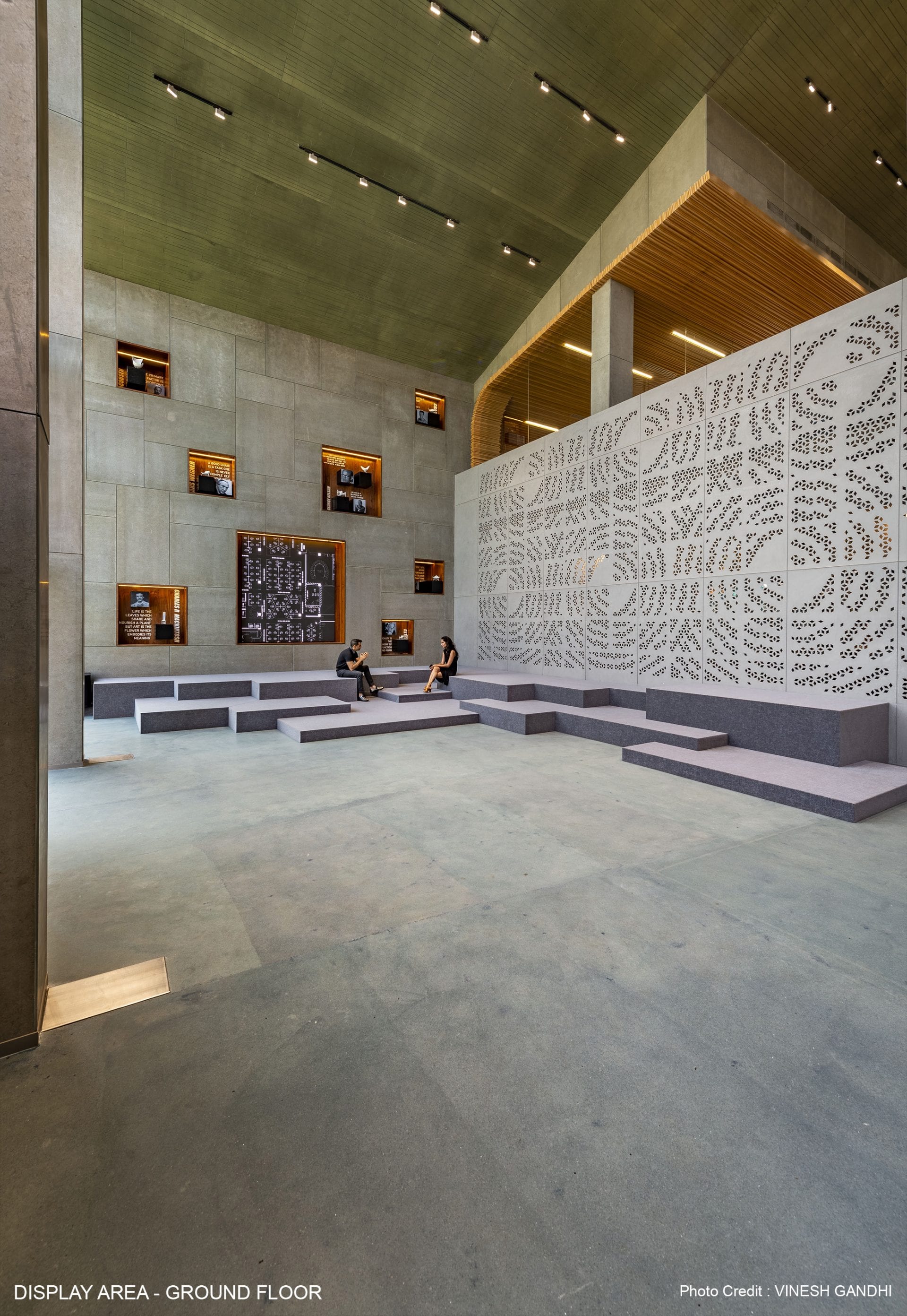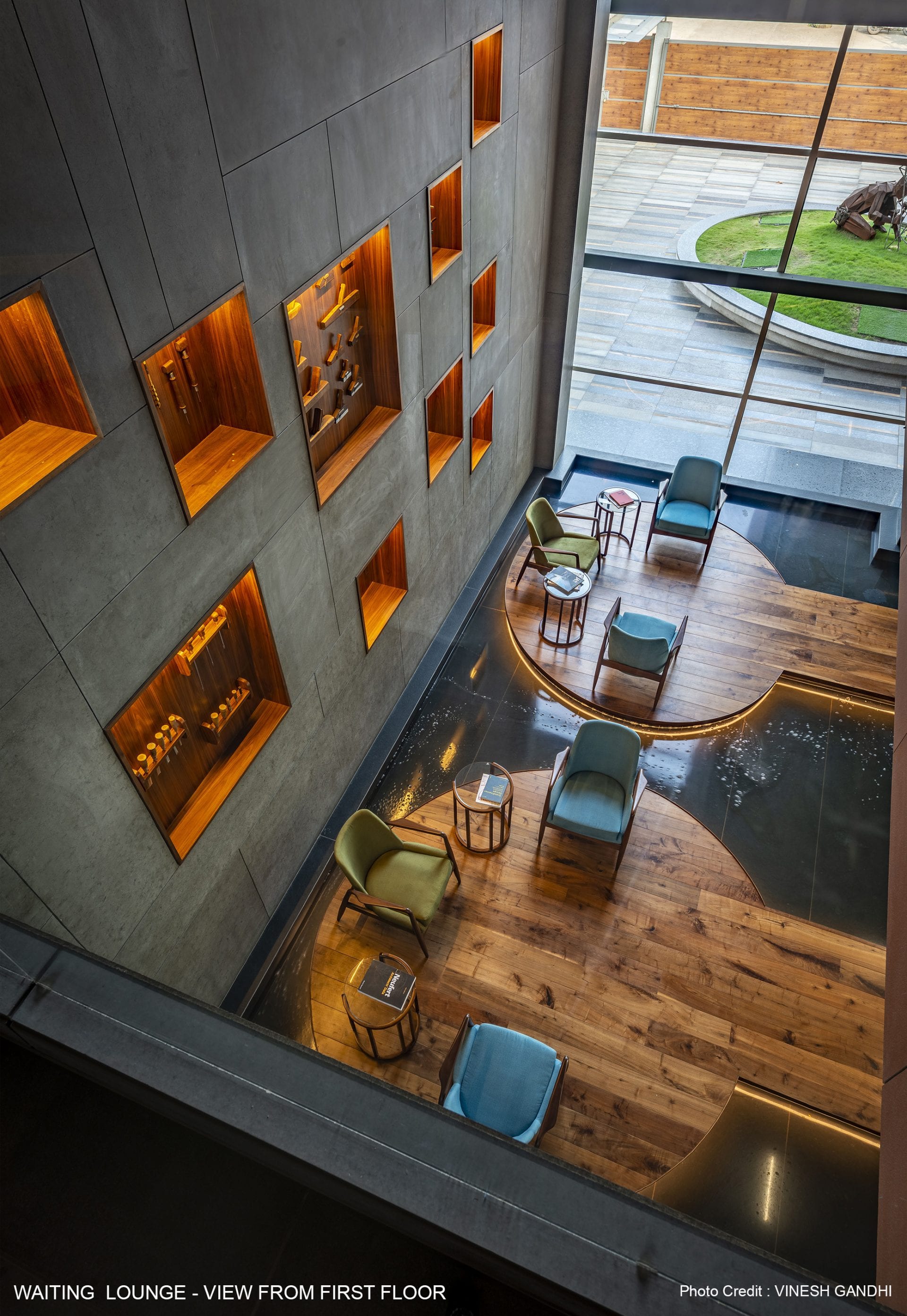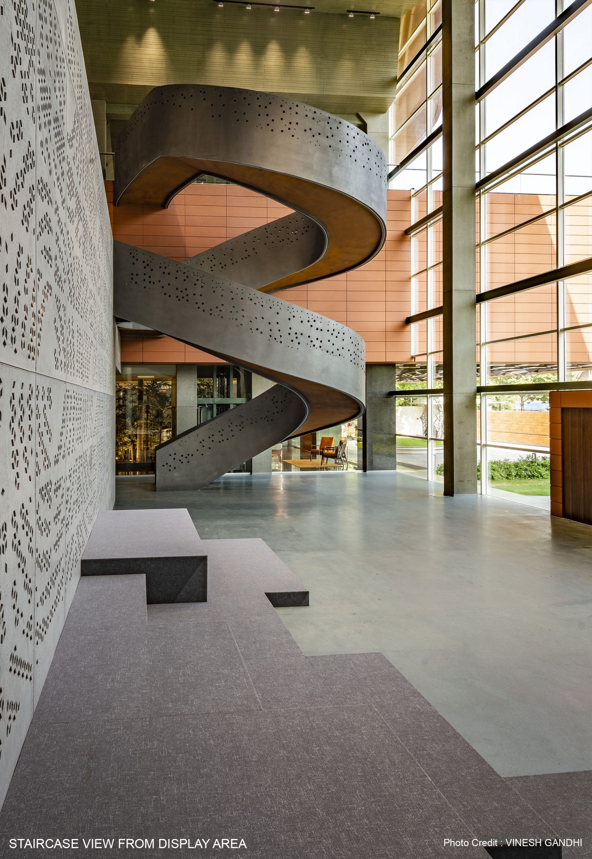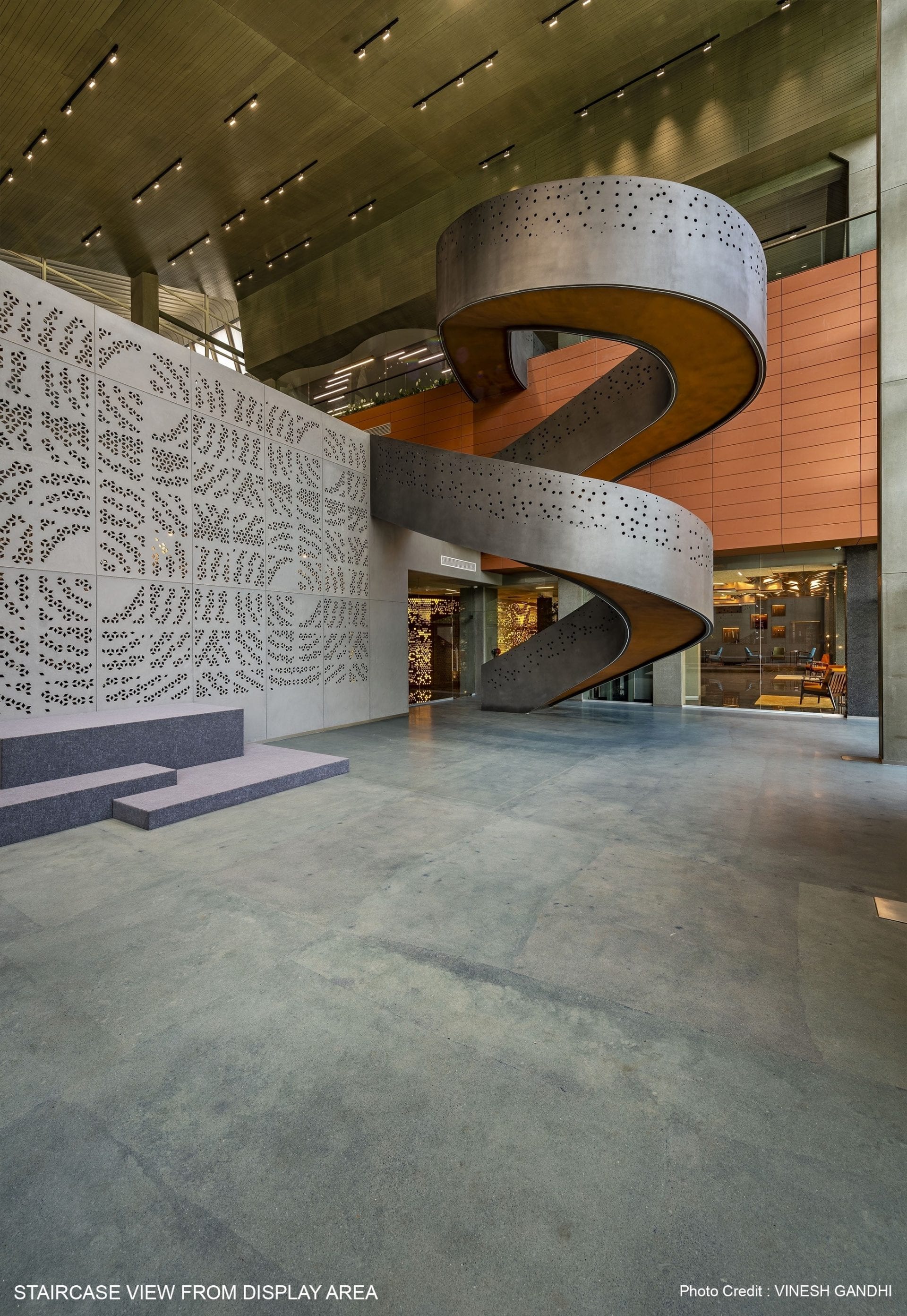 A series of architectural volumes create an office for a furniture contract company within their factory. Volumes within volumes lend each functional part of the office their own identity. A large reception space is punctuated by a 36’ high seating area in the form of elliptical pods floating in a shallow reflecting pool at one end and a landscaped courtyard at the other end. Towards one side, a 36’ high multifunctional space with movable modular platforms is designed to be used as a furniture display space, a seminar hall or a social interaction space. A cantilevered sweeping stairway spirals asymmetrically through this volume connecting the 3 levels of the office. Each of the spaces within the office are formed by elliptical volumes that create organic circulation spaces between them. A material palette of glass, metallic paint walnut and wood, sound insulation boards, cork and concrete accentuate each area differently. Lighting is integrated with the design in multiple ways. Perforated partitions of wood fused with Plexiglas, ceilings of pyramidal modules, a conference room with an installation of aluminium pipes are all infused with lighting. On each level, large openings allow natural light into the internal spaces from the northern side and unobstructed views of the factory on the southern side. Exposed ducting & exposed structural steel supports allude to the industrial space of the factory along with the steel finishes for most of the partitions. Each of the workstation areas, the discussion rooms, the cabins, conference room, multi-functional space & video conferencing room based upon the client’s brief is individual in identity an d arranged organically over 3 levels forming an architectural interior with a composition of varying volumes.