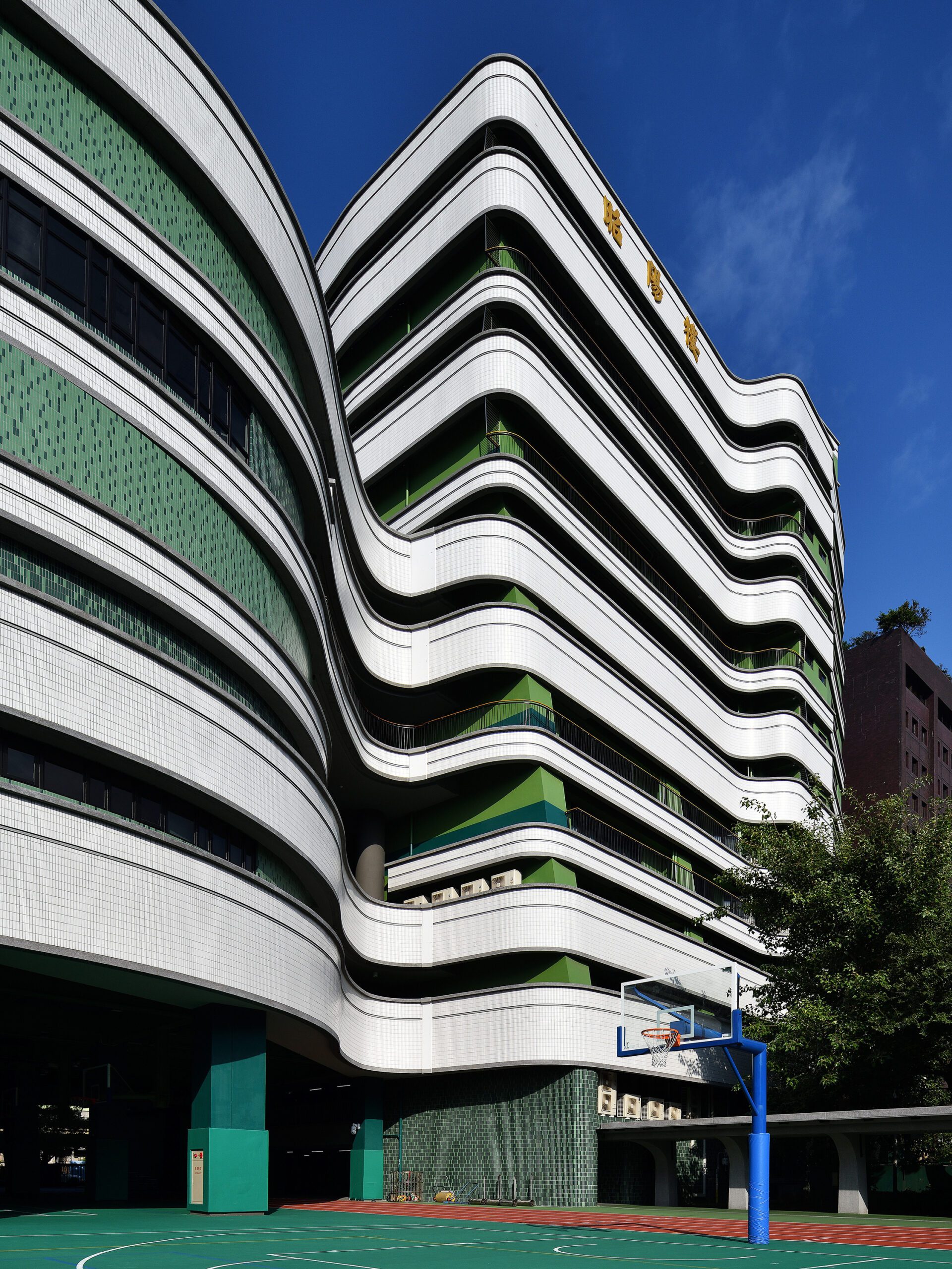 Inheriting the school’s founding values, the school badge consists of a firefly symbolising the enlightened students, six white bands symbolising progressing grades and moral, and two ears of rice against a green background symbolising a piece of fertile land. The architecture’s façades took inspiration from the school badge, which is transformed into whirling green and white horizontal bands that correspond to natural light. Radial corridors turn the campus into an endless cloister, joining the students with their studies. Interlaced horizontal bands (corridors) and a stair plaza connect teachers and students, academic and social events as well as light and shadow. The exterior of the architecture is modest and closed, shielding the campus from the interfering eastern and western glares and blocking the noise and vibration from the nearby viaduct. Through the central atrium, surrounding air vents create a naturally comfortable microclimate. Also, sunlight shines in and creates a sacred atmosphere for learning, whilst the sky brings endless variation to the architecture’s appearance as horizontal bands guide the flow of light with changing times and seasons.
