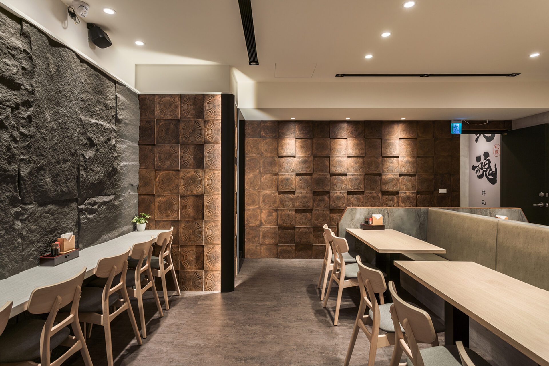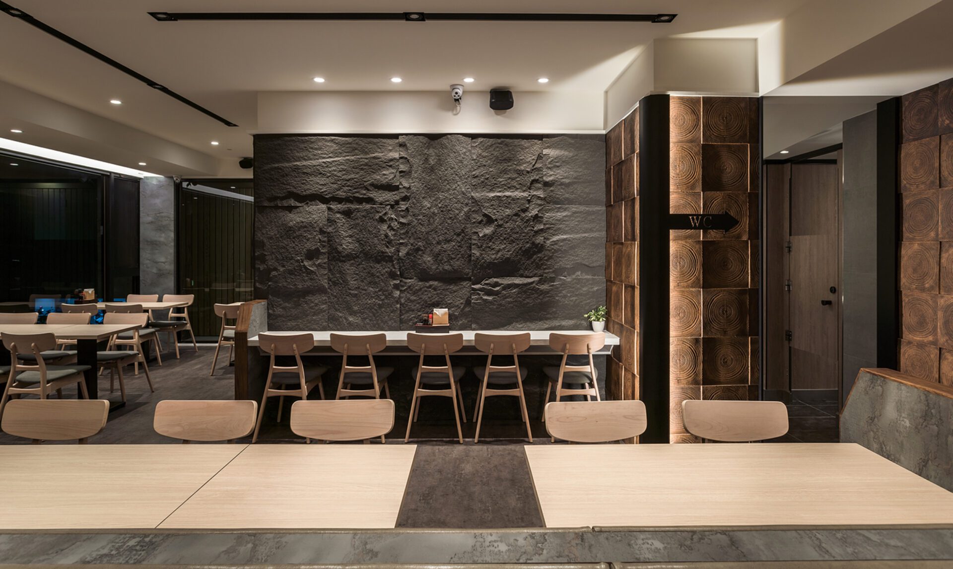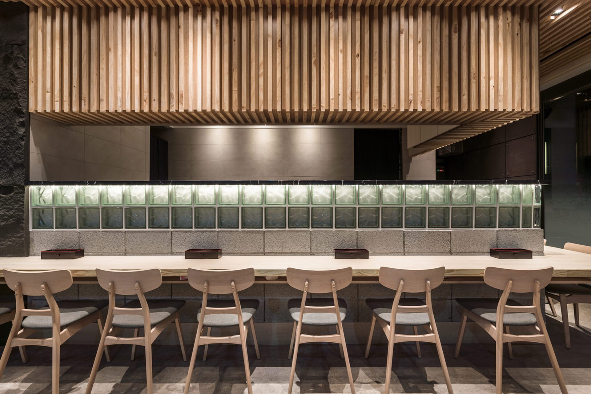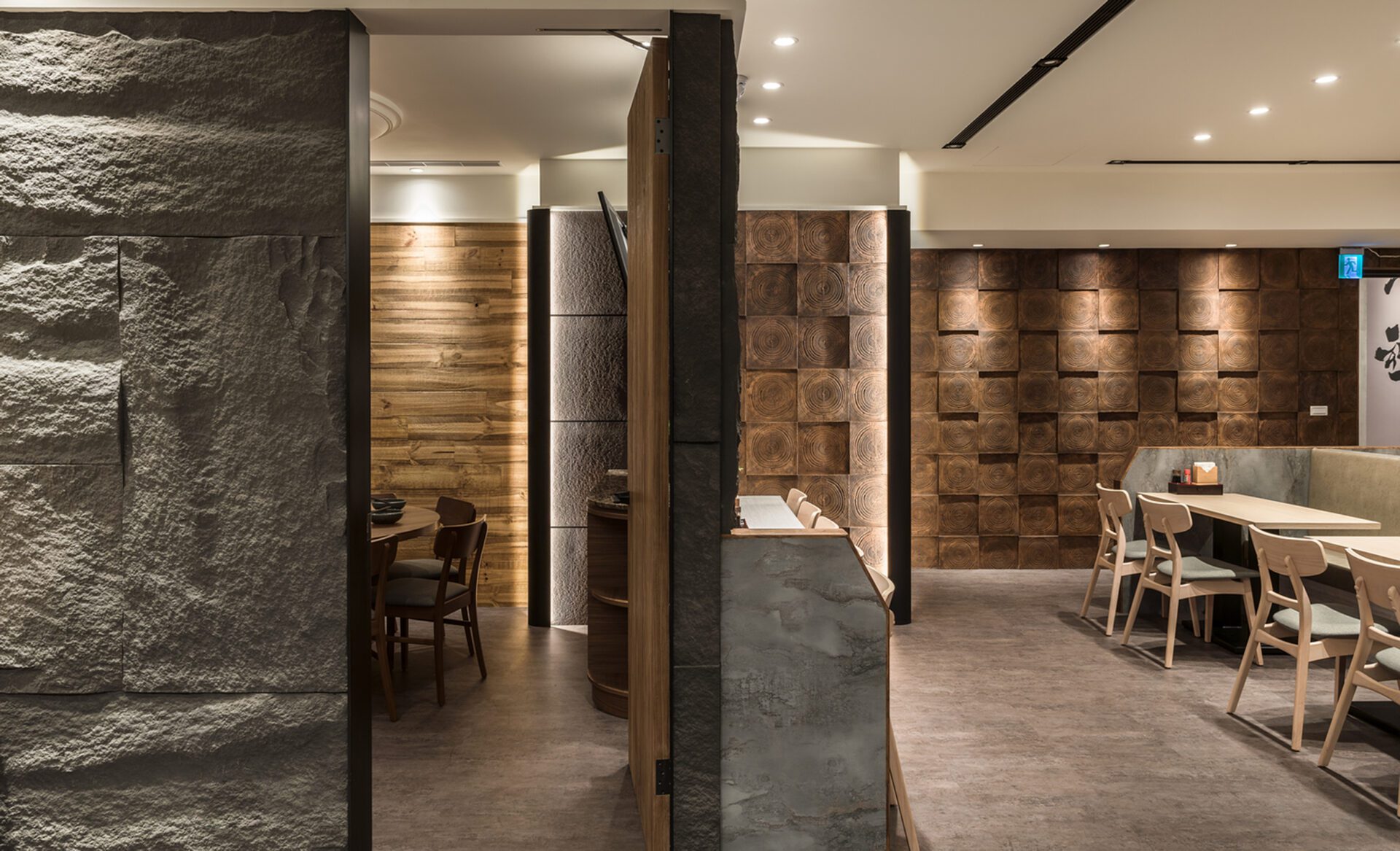 Not only does the design team present the Japanese and modern style in the space, but also hopes to form an interactive space in the use of spatial configuration. Therefore, the design team adopts the cutting of hollow bricks as the dining partition so that the extending space can present a harmonious atmosphere between the customers and the chefs. In addition, the design team adopts the idea of a reunion and gathering in the booth on the second floor. Thus, the design team uses the elements of the circle in many ways so that the space shows a sense of harmony. Moreover, the design team not only presents an interactive atmosphere in the space but also adopts the modern style in the selection of materials to create a modern atmosphere. Thus, the sense of modern atmosphere can be seen in the whole Japanese-style dining venue. With the use of different materials, the space presents a variety of spatial levels.