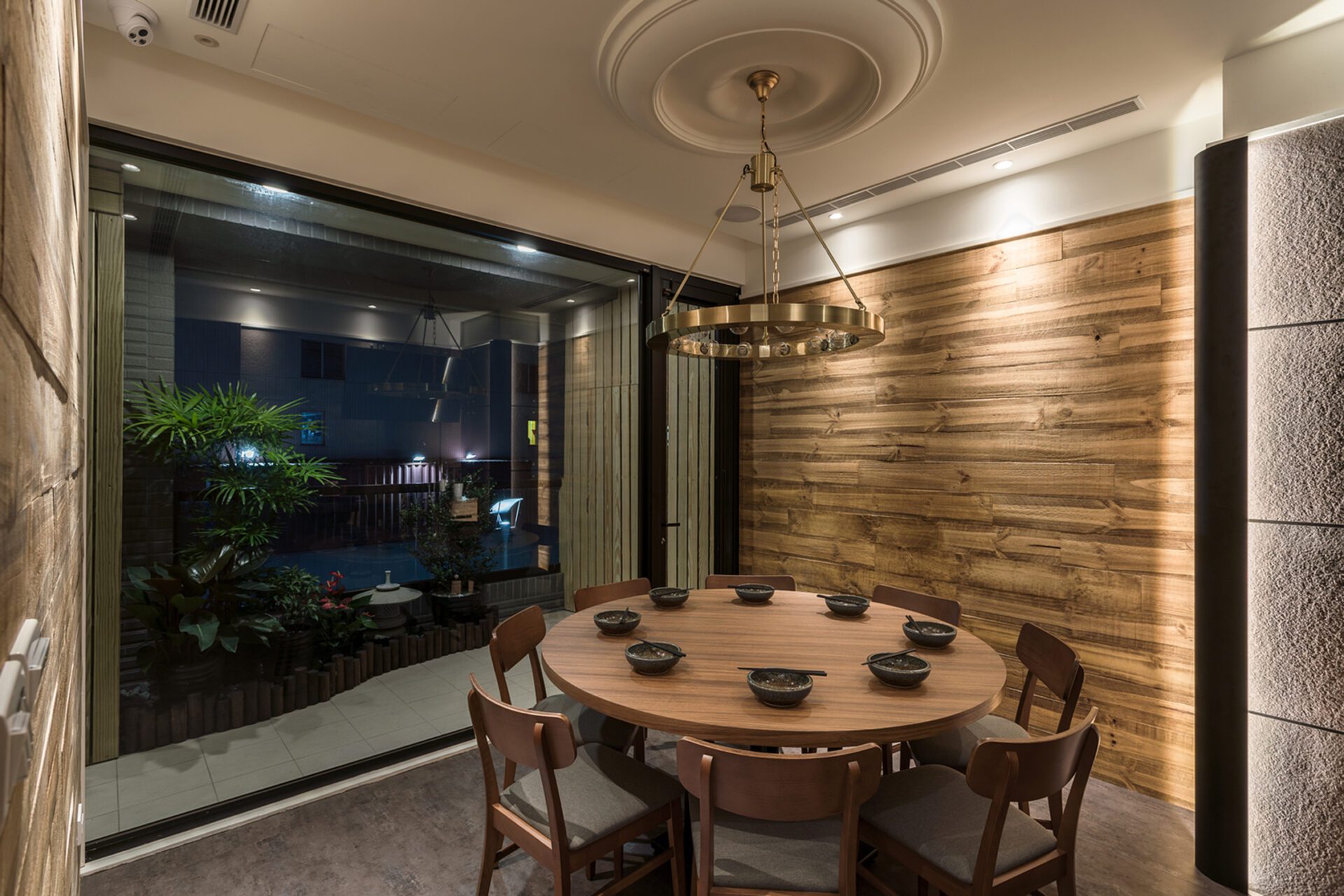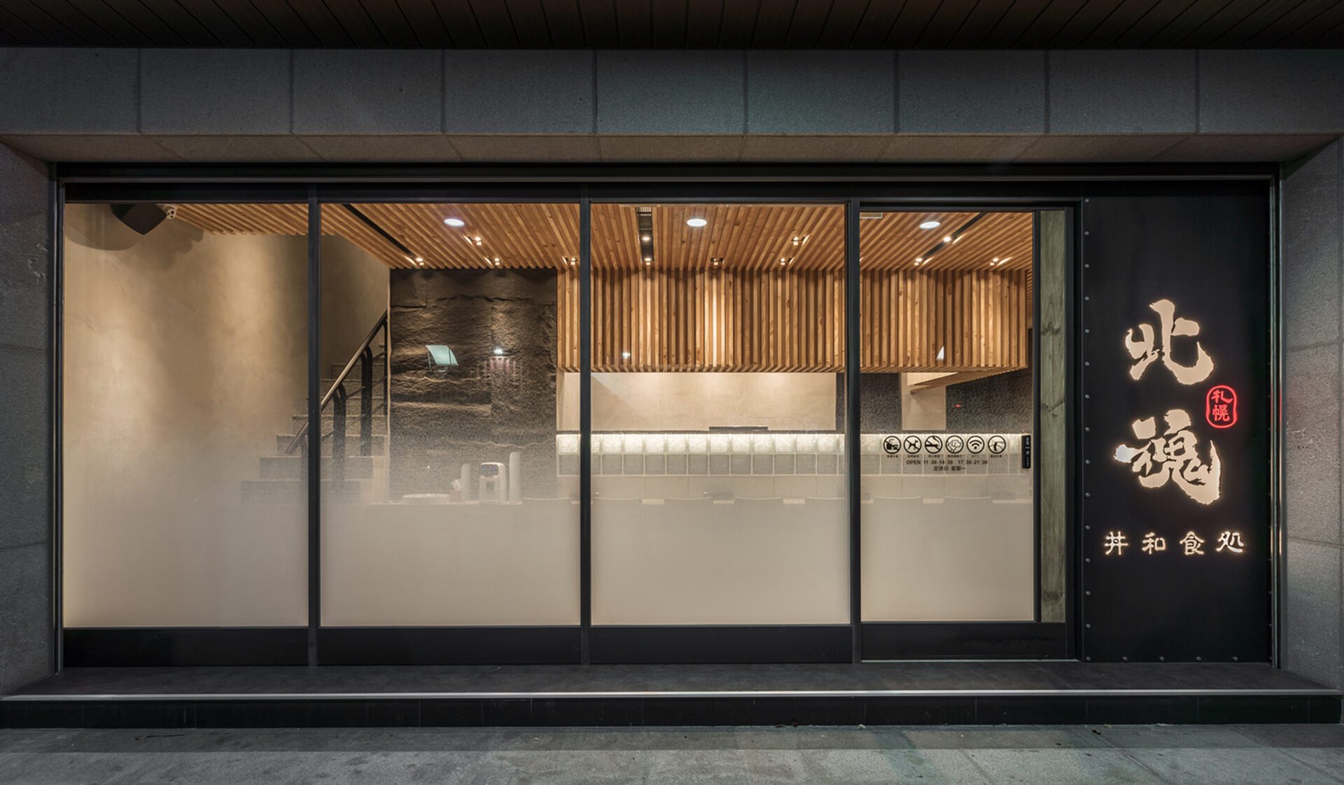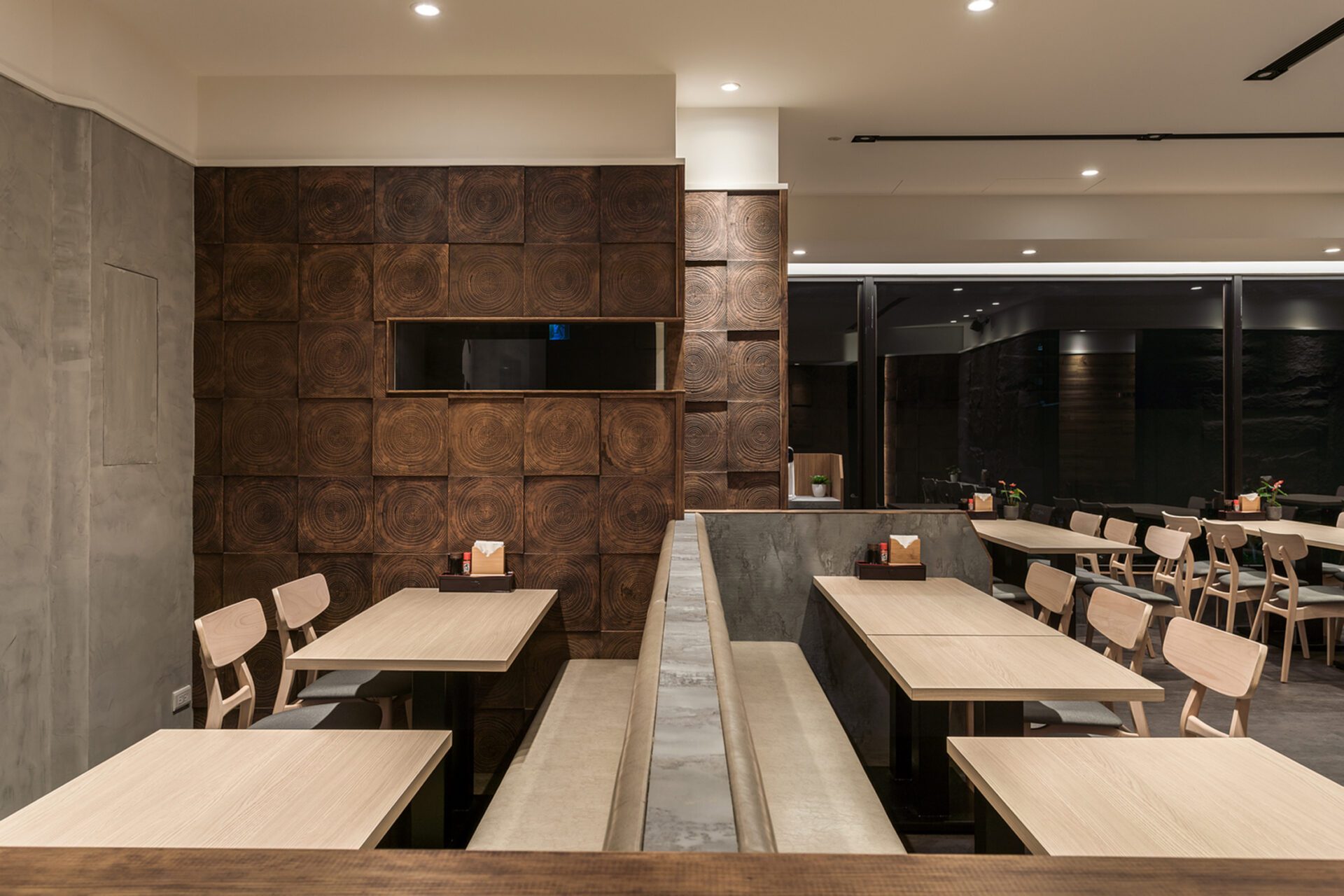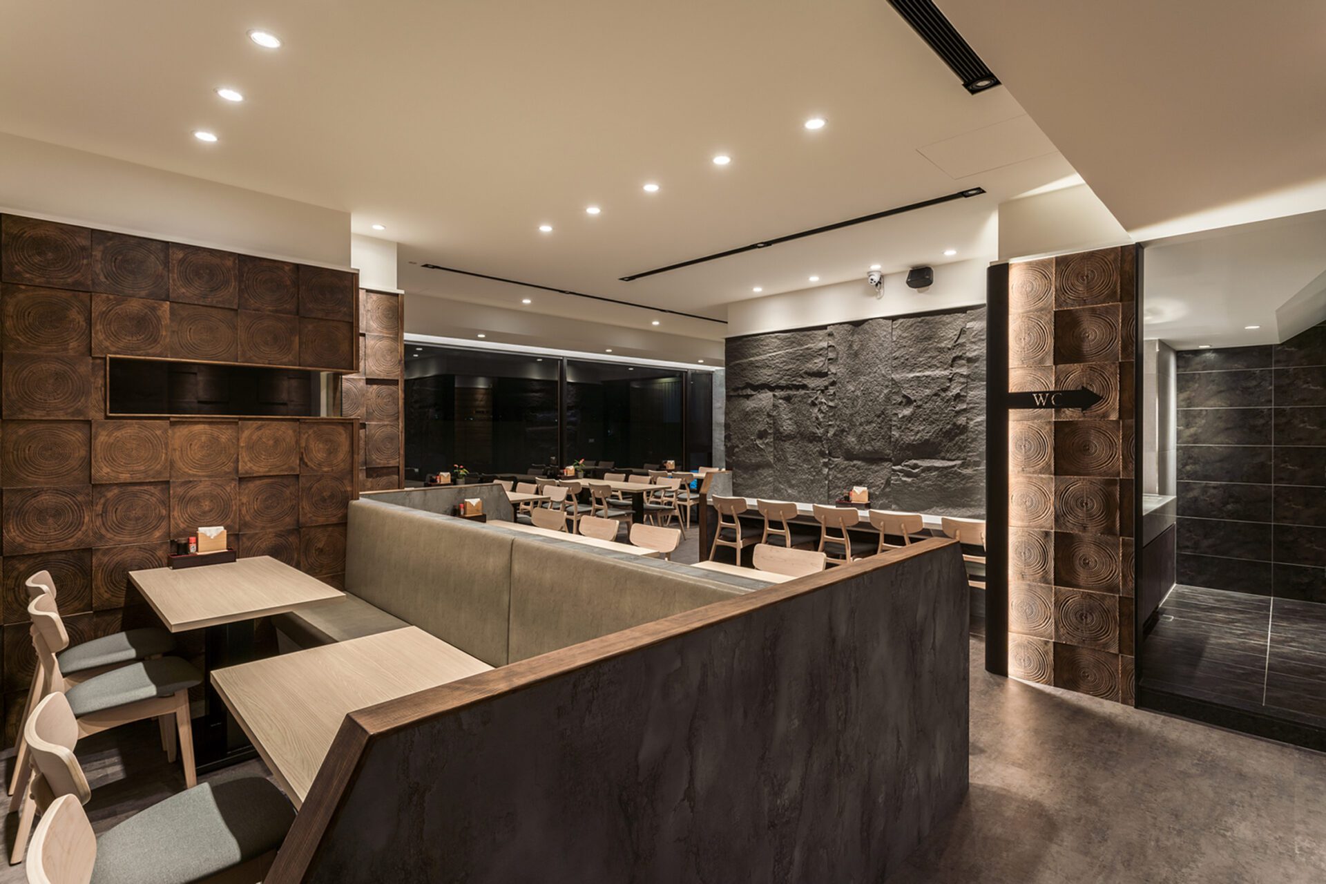 Not only does the design team present the Japanese and modern style in the space, but also hopes to form an interactive space in the use of spatial configuration. Therefore, the design team adopts the cutting of hollow bricks as the dining partition so that the extending space can present a harmonious atmosphere between the customers and the chefs. In addition, the design team adopts the idea of a reunion and gathering in the booth on the second floor. Thus, the design team uses the elements of the circle in many ways so that the space shows a sense of harmony. Moreover, the design team not only presents an interactive atmosphere in the space but also adopts the modern style in the selection of materials to create a modern atmosphere. Thus, the sense of modern atmosphere can be seen in the whole Japanese-style dining venue. With the use of different materials, the space presents a variety of spatial levels.
