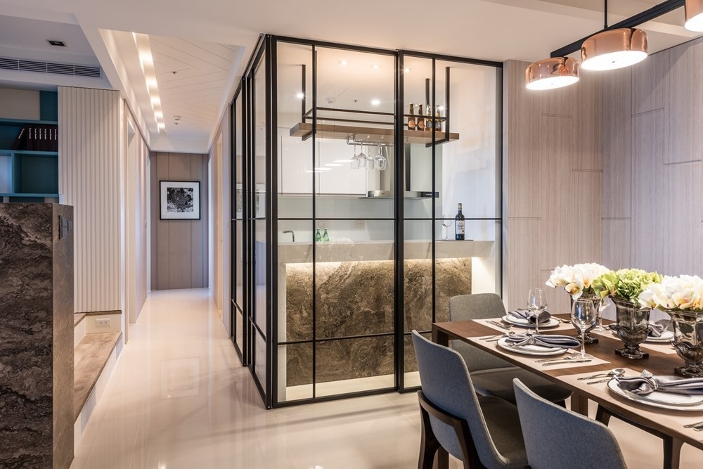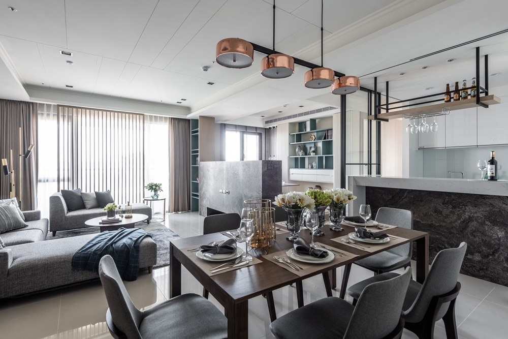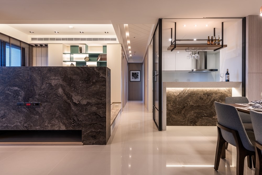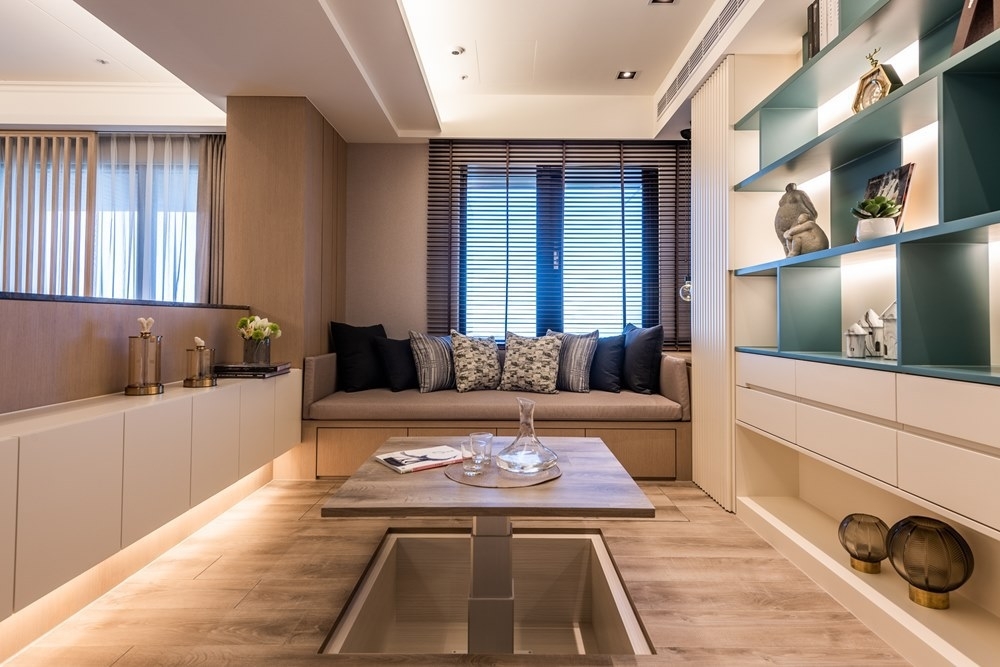 The wide and well-lit leisure home was designed due to the preference of the young husband and wife. Wooden grille design on living room act in concert with the sunlight, together form wonderful changes of light and shadow. The elevated floor is to keep the environment ventilated by exhaust air equipment, at the same time combine with multifunctional design such as lifting table, storage, couch, sliding door of the open kitchen, which had increased flexibility. This had also ingeniously achieved visual space magnification, satisfying the hospitality owner.