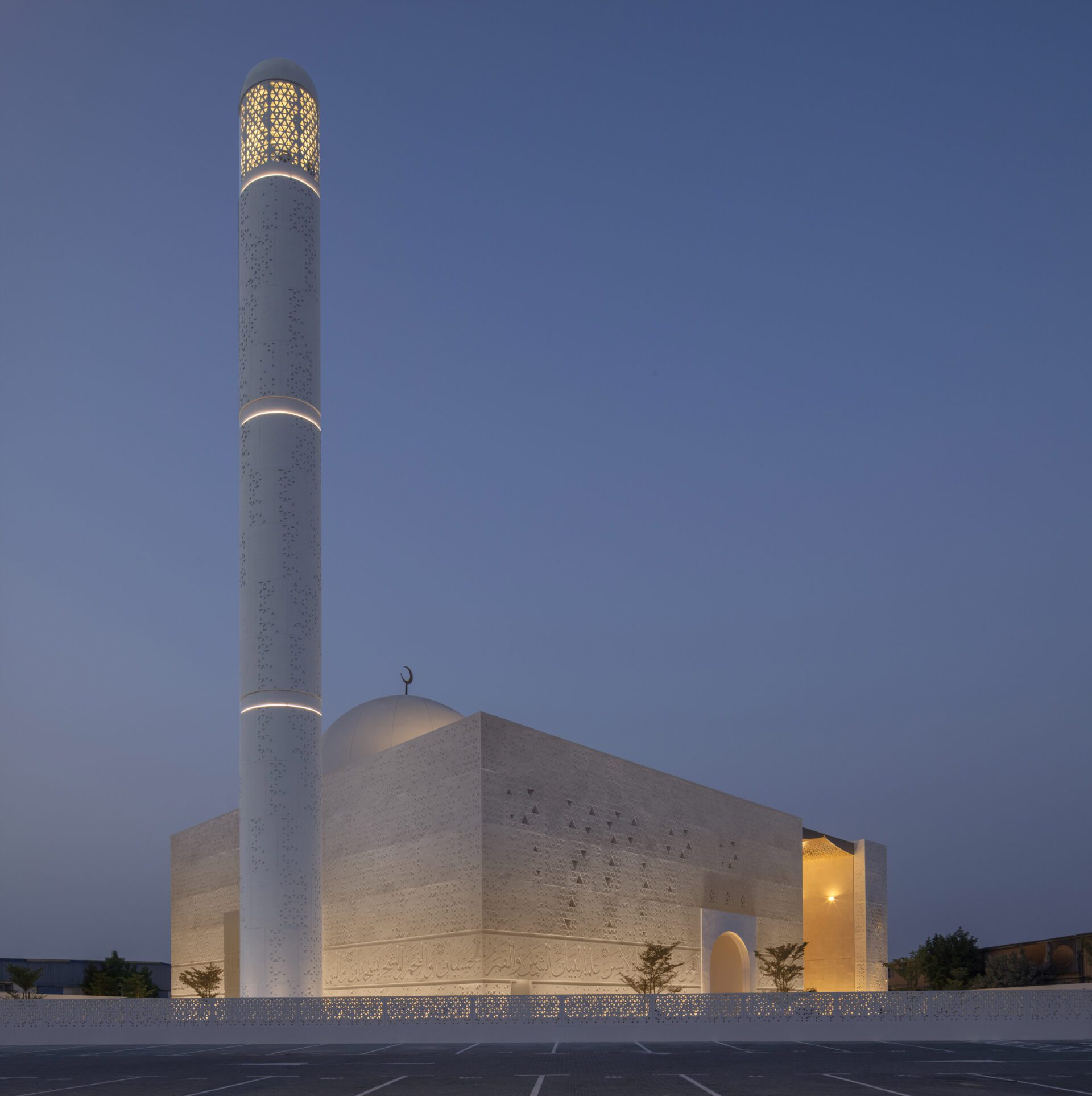 Prayer is a devotional act. It requires us to be totally present. With all the distractions in our modern busy lives, it can be challenging to quieten the mind and find an inner calm to allow for full immersion into prayer. The design incorporates a series of spaces that facilitate a transition from the outer everyday world to an inner spiritual experience. the main building volume is separated into two. Firstly, the Prayer block containing the male and female prayer halls and secondly the Ablution block where the ablution facilities and residence for Imam and Moazen are found. The canopy creates both a link and a separation between the Prayer block and the Ablution & Accommodation block. With its two arms almost touching, the canopy represents the duality of body and spirit: the practicality of the ablution ritual and the spirituality of prayer. The Calligraphy plays an important part in the overall design. The words of God, in the form of Quranic verses form a tangible protective band around the mosque. They create an immediate connection upon arrival between the visitor and divine and instill a sacred energy throughout the building. Once in the prayer hall, the use of natural light helps to enhance a feeling of spirituality and the sacred. The connection between the earthly and the divine. The openings are deliberately placed to amplify this connection: The glowing light behind the Mihrab invites the worshippers attention towards Mecca, the direction of prayer. The ‘double skin’ dome also allows natural light to enter, filtering it through the internal layer, which incorporates the same triangulated pattern as the rest of the building. The light through the perforated dome enhances the vertical connection to the Heavens To allow for privacy, the female prayer area is elevated above the Main hall . An open perforated screen provides this separation, while still allowing a connection to the main prayer hall. The site is in al Quoz, the industrial heart of Dubai, is a functional and practical place. The design seeks to amplify further the distinction between the earthly and the spiritual.