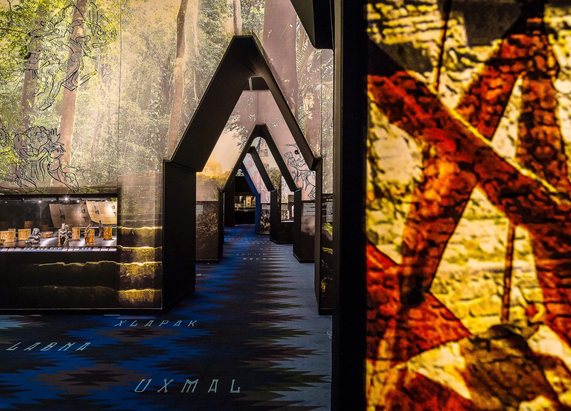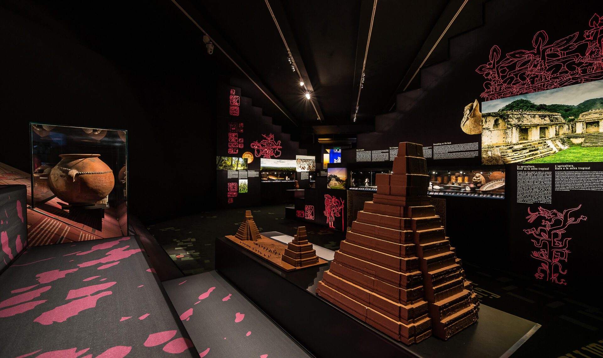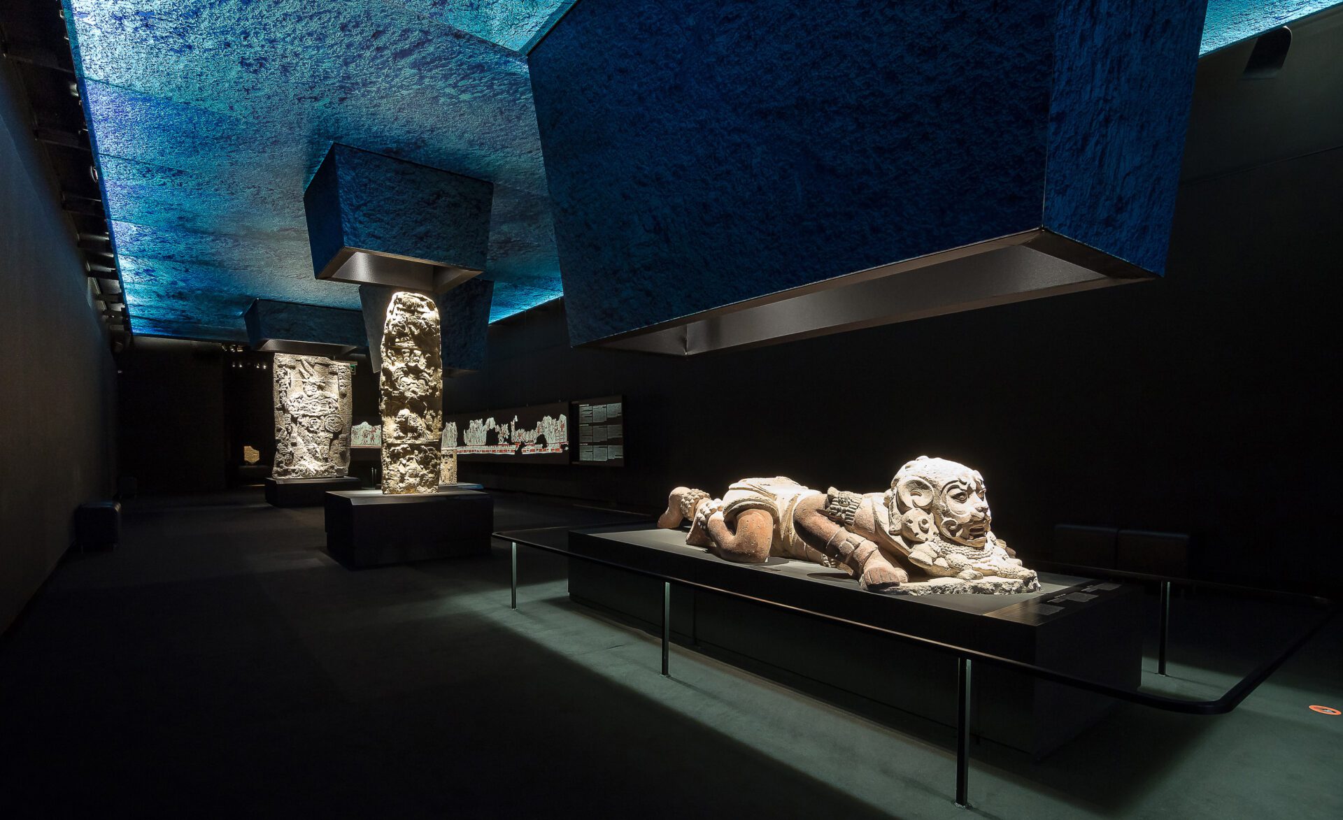 Mayans, the lost cities enigma has a MARQ specific musealization, after going all over the Netherlands and Germany museums, with its almost 200 pieces. Its exhibiting discourse immerses us into the jungle, cradle of the mayan culture, where the enormous temples show up adding highlighting the difference pieces between mayan architecture and symbology. ARCHITECTURE AND GRAPHIC DESING. It develops a musealization labour consisting of the production of museographic architecture and its complete graphic design, graphic applications, scenography architectures concerning exhibited pieces for a better visitor understanding. LIGHTNESS, RECYCLABLE MATERIALS AND HIGH SECURITY REQUIREMENTS. Security requirements are very high. Using materials and finished forms in accordance with the exhibition temporal length, like printed textile walls or recyclable metal structures, and in turn having showcases with a high demanding security and maintenance control, such as the security closure layout, integrated hygrothermal controls or safety glasses. ACCESIBILITY. Printed 3D models are used for replicating archaeological pieces which are placed near the real ones just for the spectators, visual deficiency people, children or that curious person who wishes an experience with the piece volume and texture, being able to touch and perceive it, adding a larger experience and interpretation of what is being enjoyed.