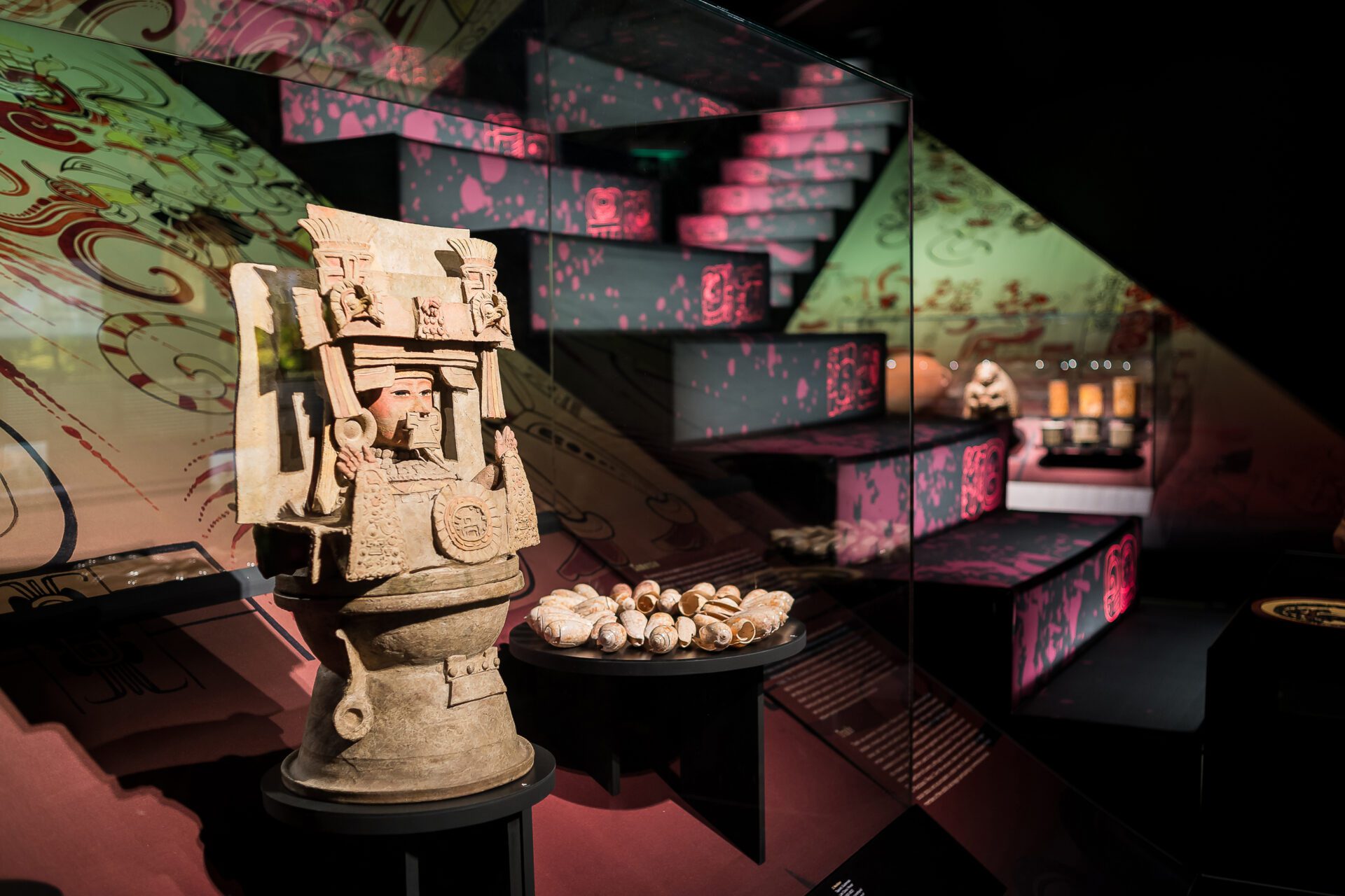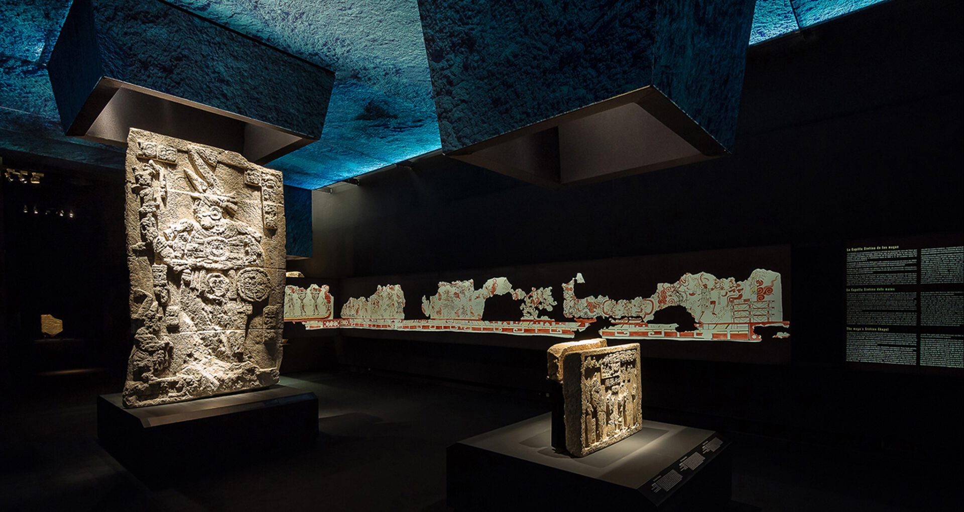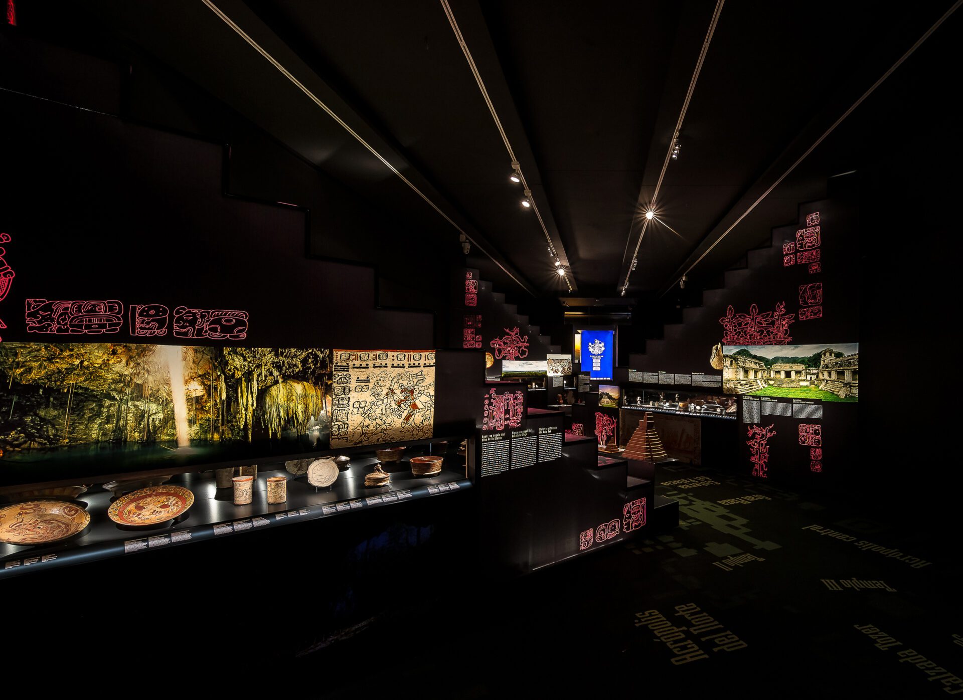 Mayans, the lost cities enigma has a MARQ specific musealization, after going all over the Netherlands and Germany museums, with its almost 200 pieces. Its exhibiting discourse immerses us into the jungle, cradle of the mayan culture, where the enormous temples show up adding highlighting the difference pieces between mayan architecture and symbology. ARCHITECTURE AND GRAPHIC DESING. It develops a musealization labour consisting of the production of museographic architecture and its complete graphic design, graphic applications, scenography architectures concerning exhibited pieces for a better visitor understanding. LIGHTNESS, RECYCLABLE MATERIALS AND HIGH SECURITY REQUIREMENTS. Security requirements are very high. Using materials and finished forms in accordance with the exhibition temporal length, like printed textile walls or recyclable metal structures, and in turn having showcases with a high demanding security and maintenance control, such as the security closure layout, integrated hygrothermal controls or safety glasses. ACCESIBILITY. Printed 3D models are used for replicating archaeological pieces which are placed near the real ones just for the spectators, visual deficiency people, children or that curious person who wishes an experience with the piece volume and texture, being able to touch and perceive it, adding a larger experience and interpretation of what is being enjoyed.