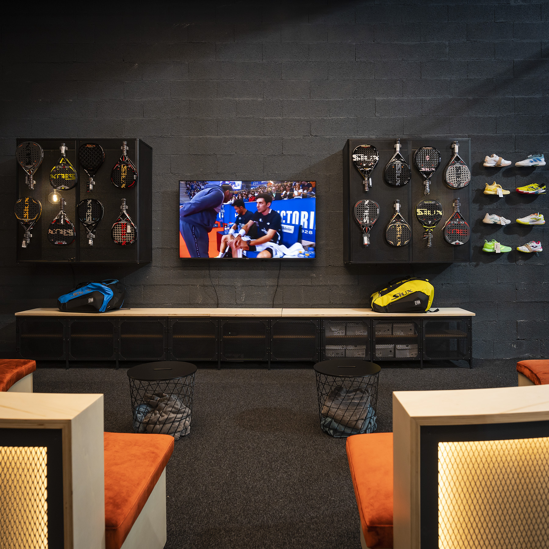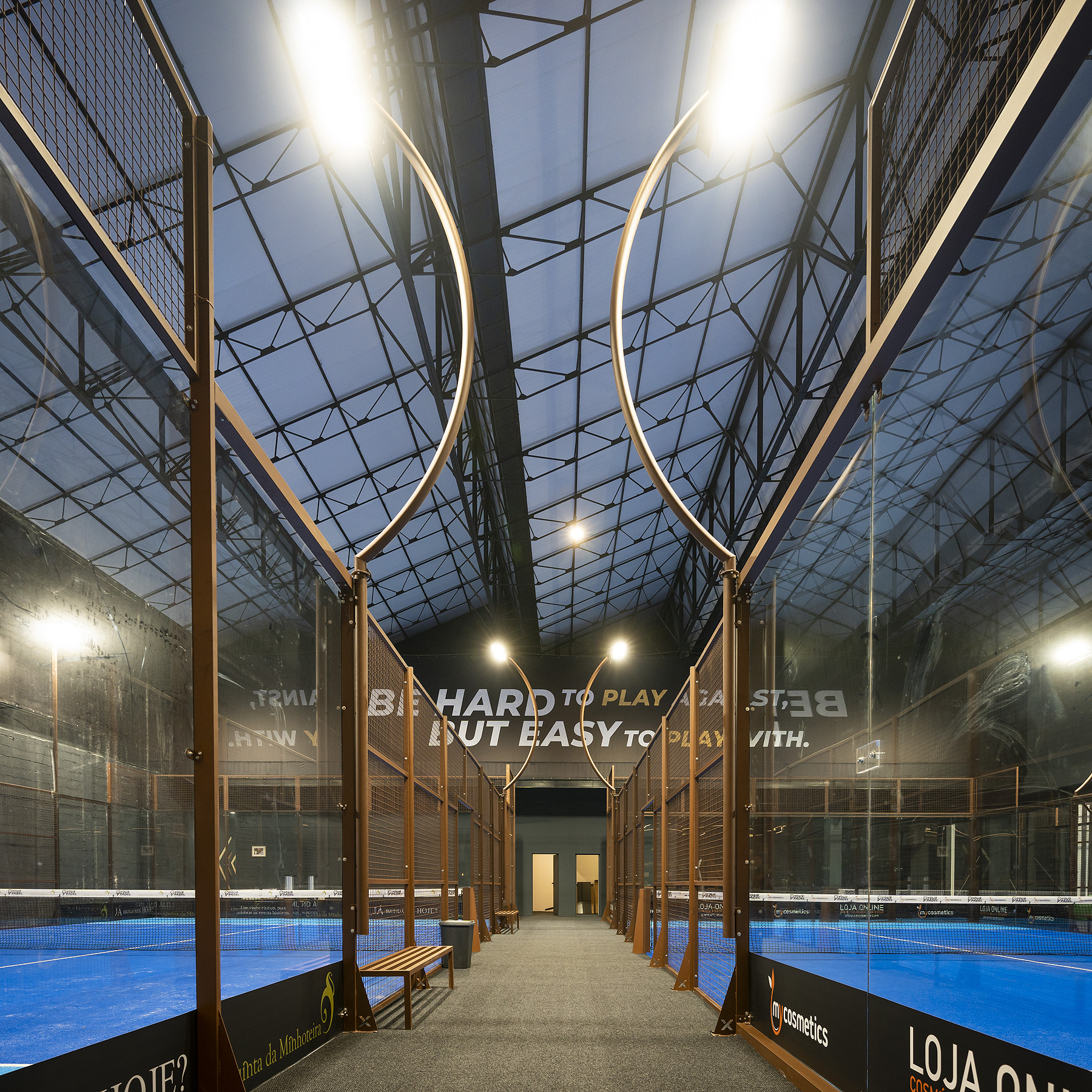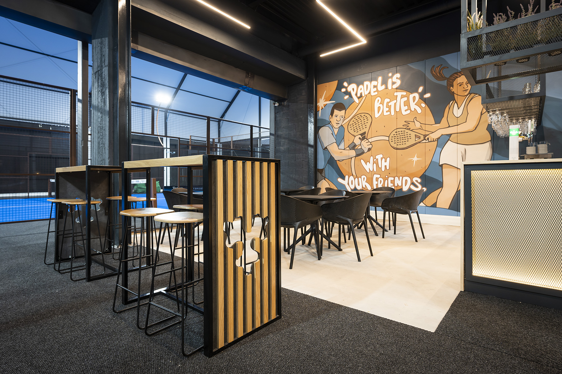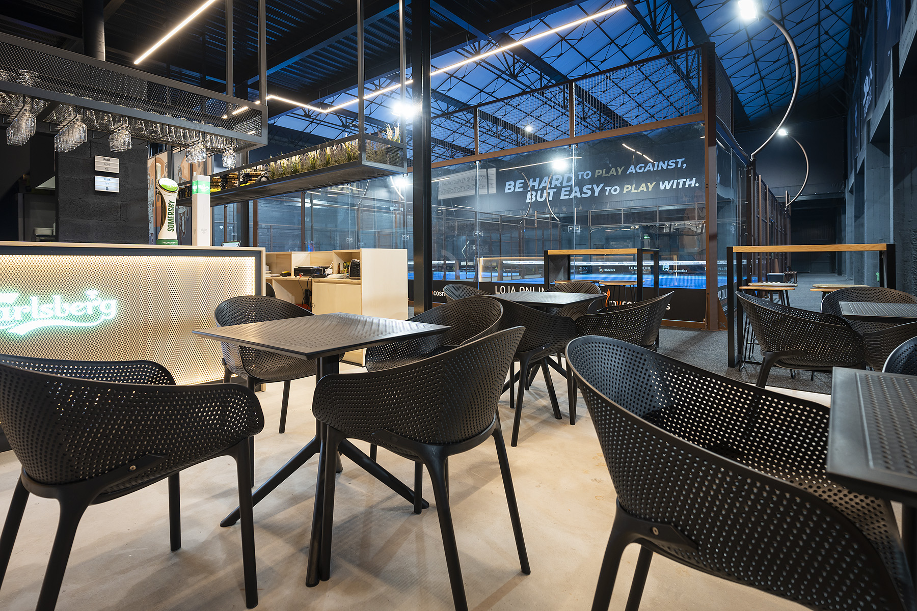 In a markedly neutral background that reveals the raw and bare simplicity of the materials used, hints of color come to us through the urban art of the artists FEDOR and BIGOD. The sofas, upholstered in brick-colored fabric, also provide the space with color and comfort, creating a symbiosis with the blue pavement of the courts, marking the versatility of the space and its authenticity.