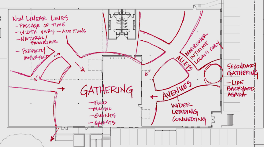 The decision to move away from their first home came with fear that their close-knit feeling would be lost in the move. So we laid out on the table all of the ingredients that make for a rich and vibrant community, including food, a central place to gather, and flexible spaces to connect.