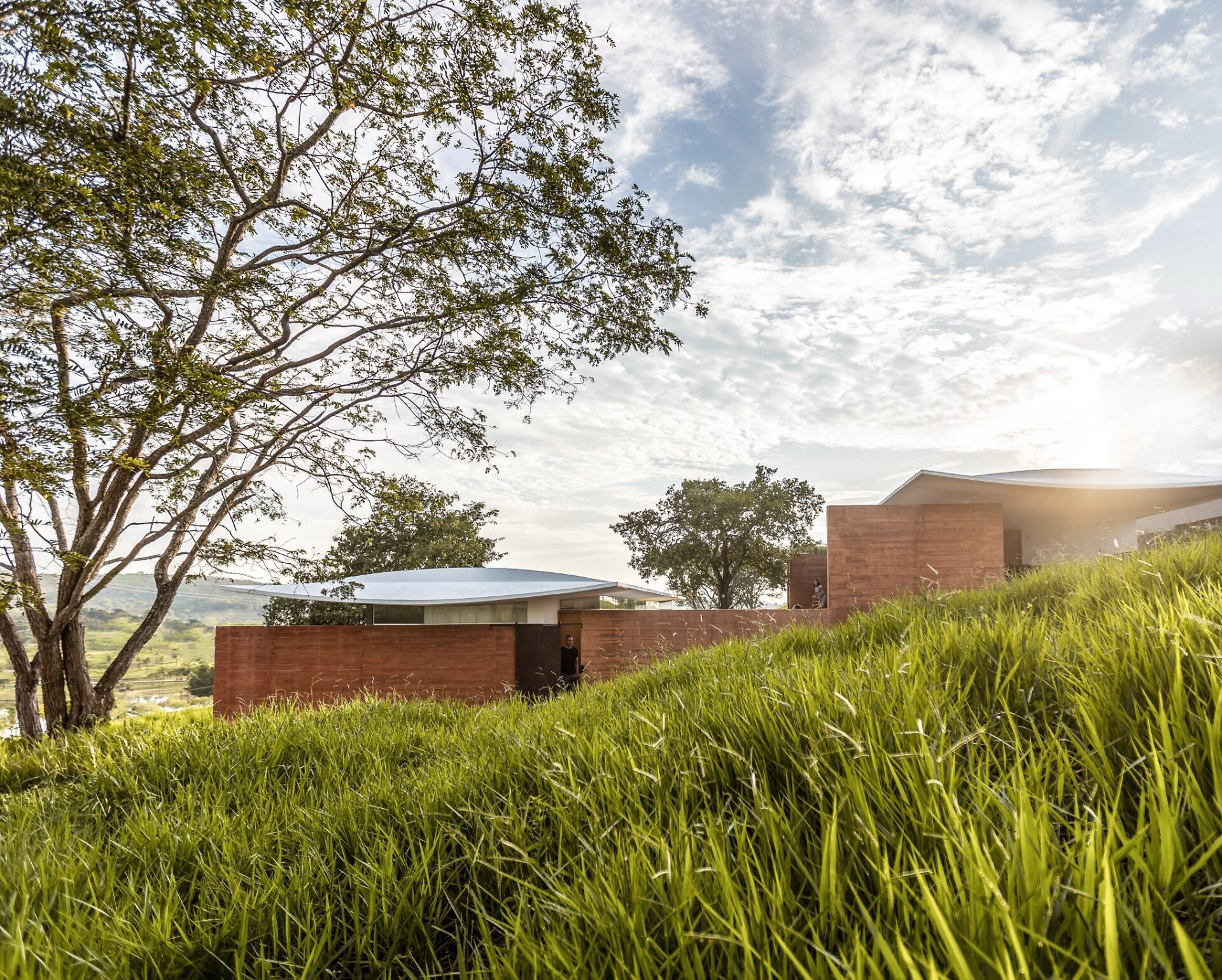 The quality of coffee is greatly impacted by the characteristics of the land and climate where it is grown. In addition, the drink is perhaps the one most related to the air, being recognized by its aroma. In this sense, earth and air were the great inspirations. Weight and lightness. Thus, the materialization of this concept took place through the creation of two main elements that represent this contrast. The thick pigmented concrete side walls refer to the earth and the two thin, white and curved slabs that “float” over the house refer to the air. They are like two sheets of paper resting on the walls that seem to sprout from the ground.