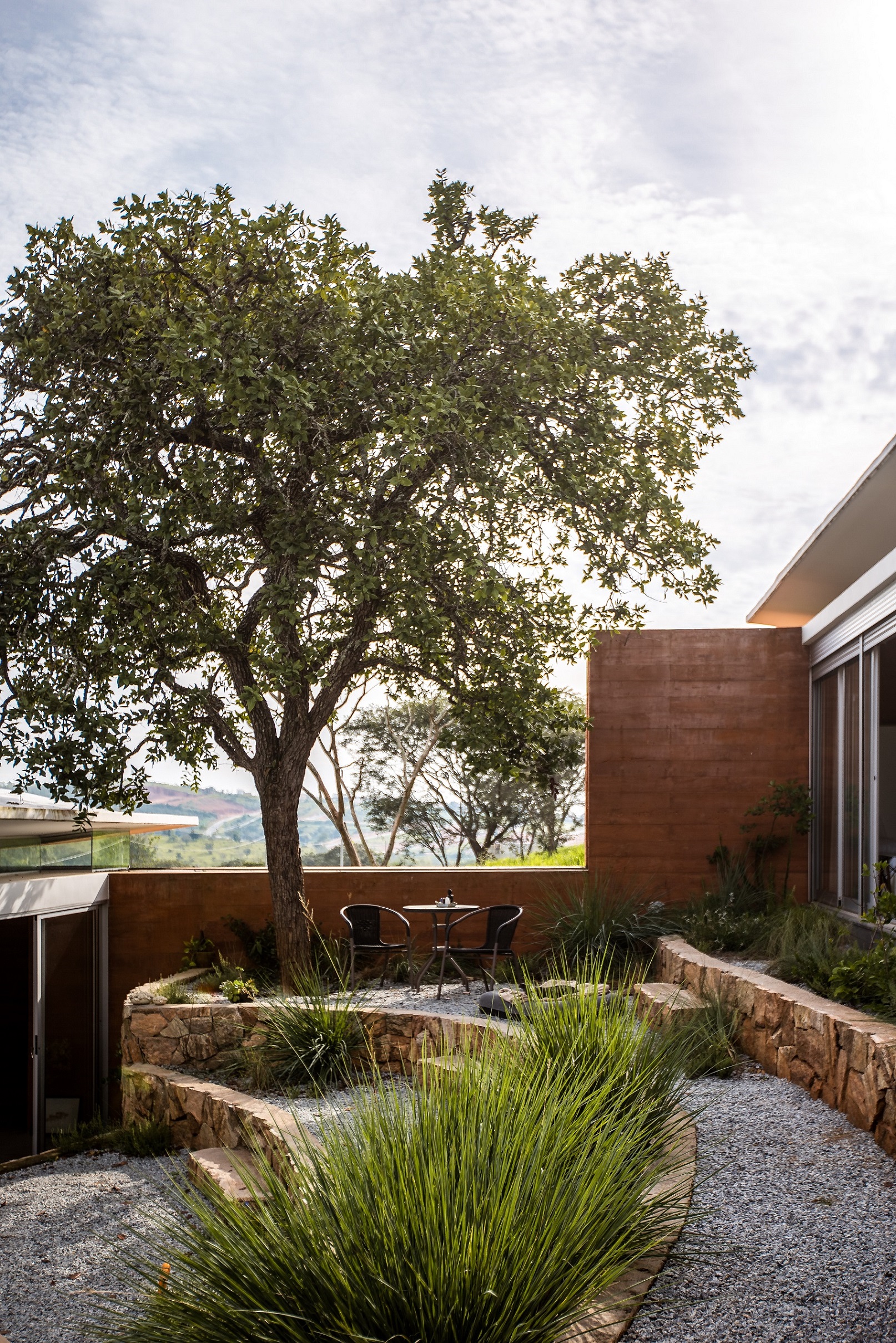 The house, while establishing a connection with the residents, was a response to reading about the place. The earth walls leads to the view. The terrain remains untouched and the topography remains the same. The trees were not cut down and now establish new relationships with the built volumes. These were implanted in the original dimensions of the land and between them, a stepped garden was developed.