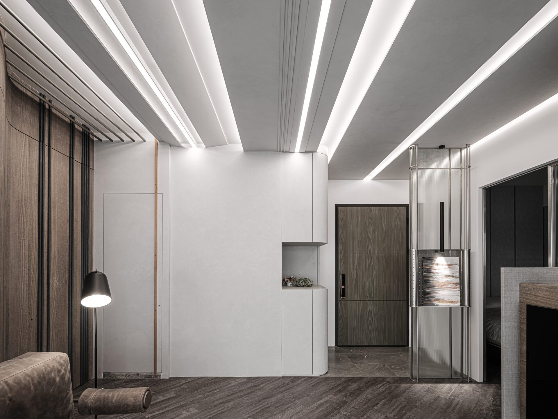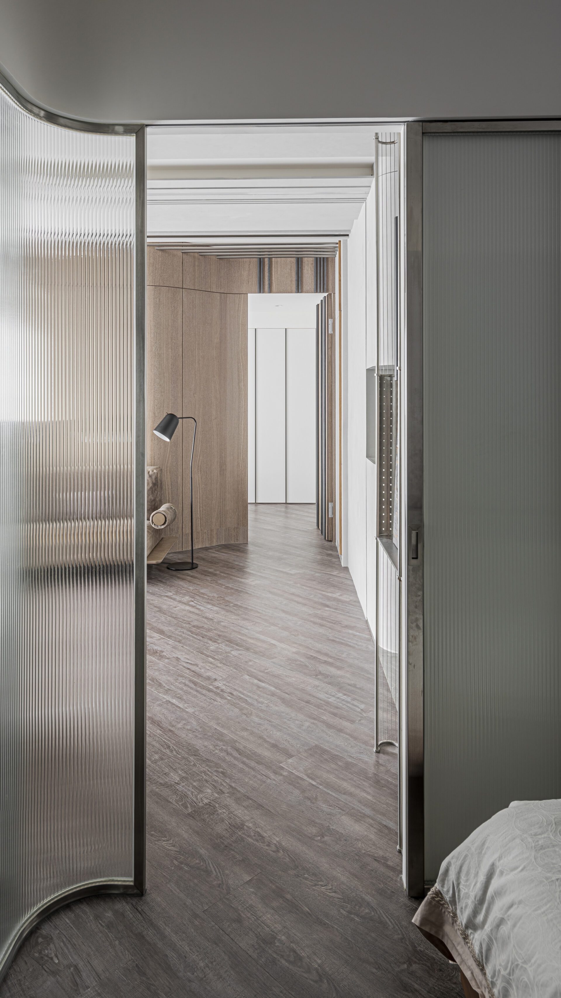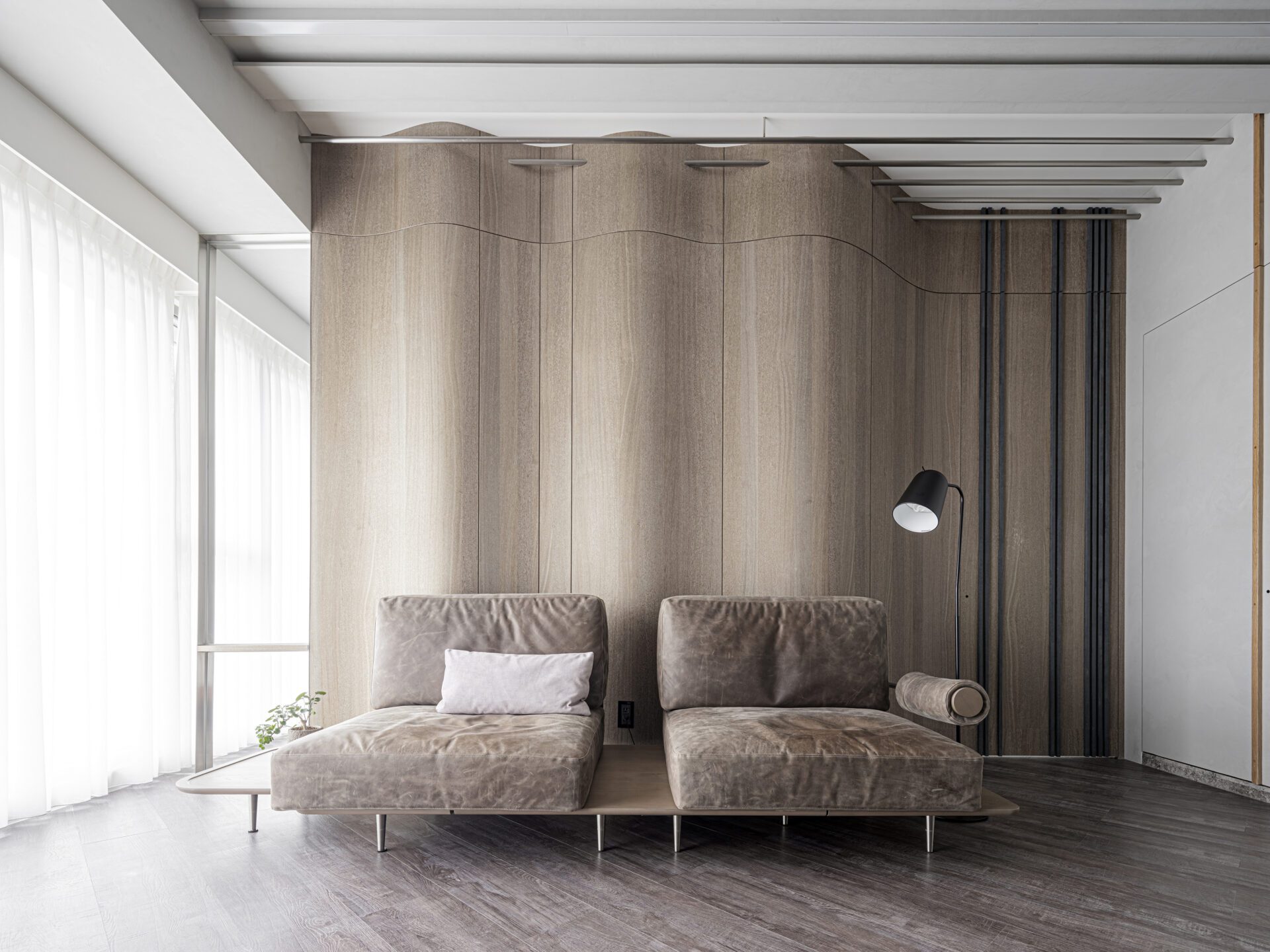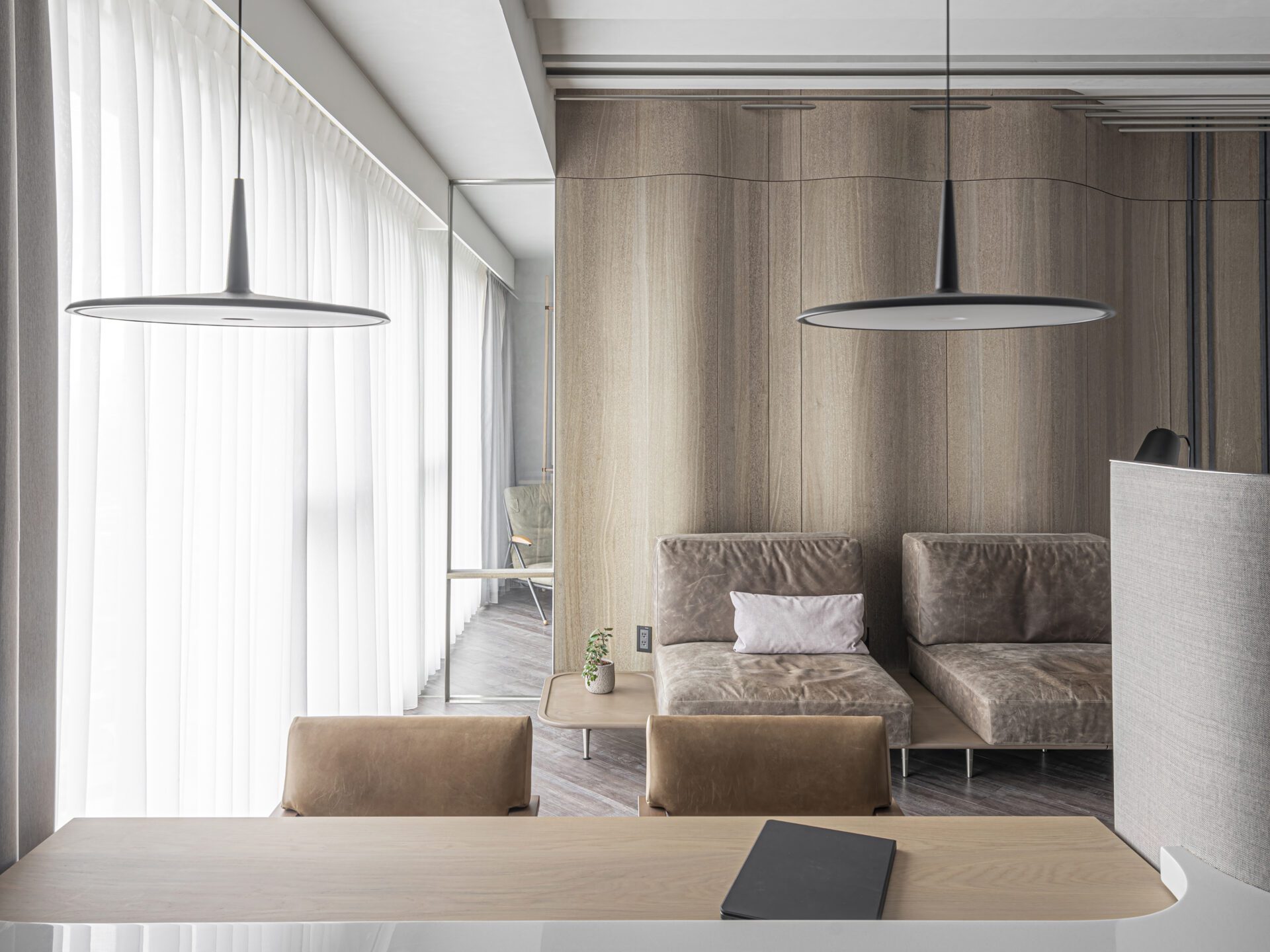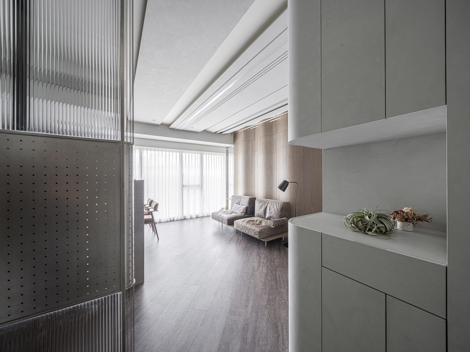 The development of the theme of landscape artistic conception presents the continuous mountains on the back wall of the sofa in a concrete way, and the linear ceiling shape like clouds and dawn extends towards the outside of the window. The texture of reeded glass is used to present the texture of water fluctuations in form. Combining materials and shapes with window views reflects the artistic conception of landscape artistic conception.