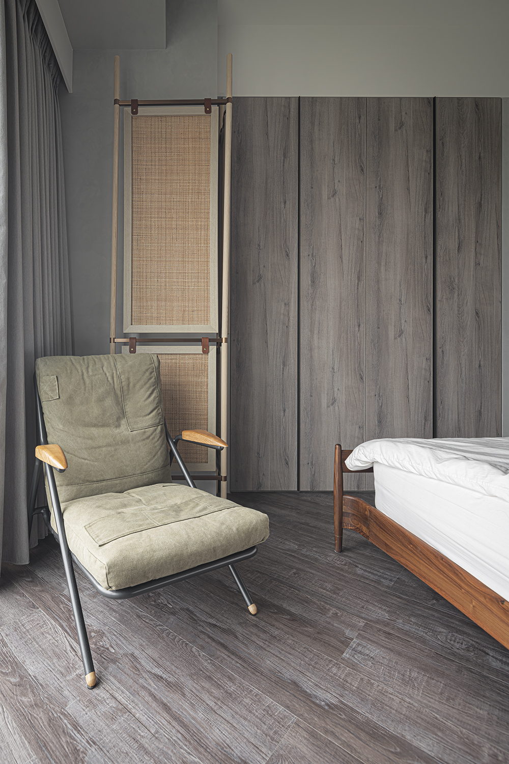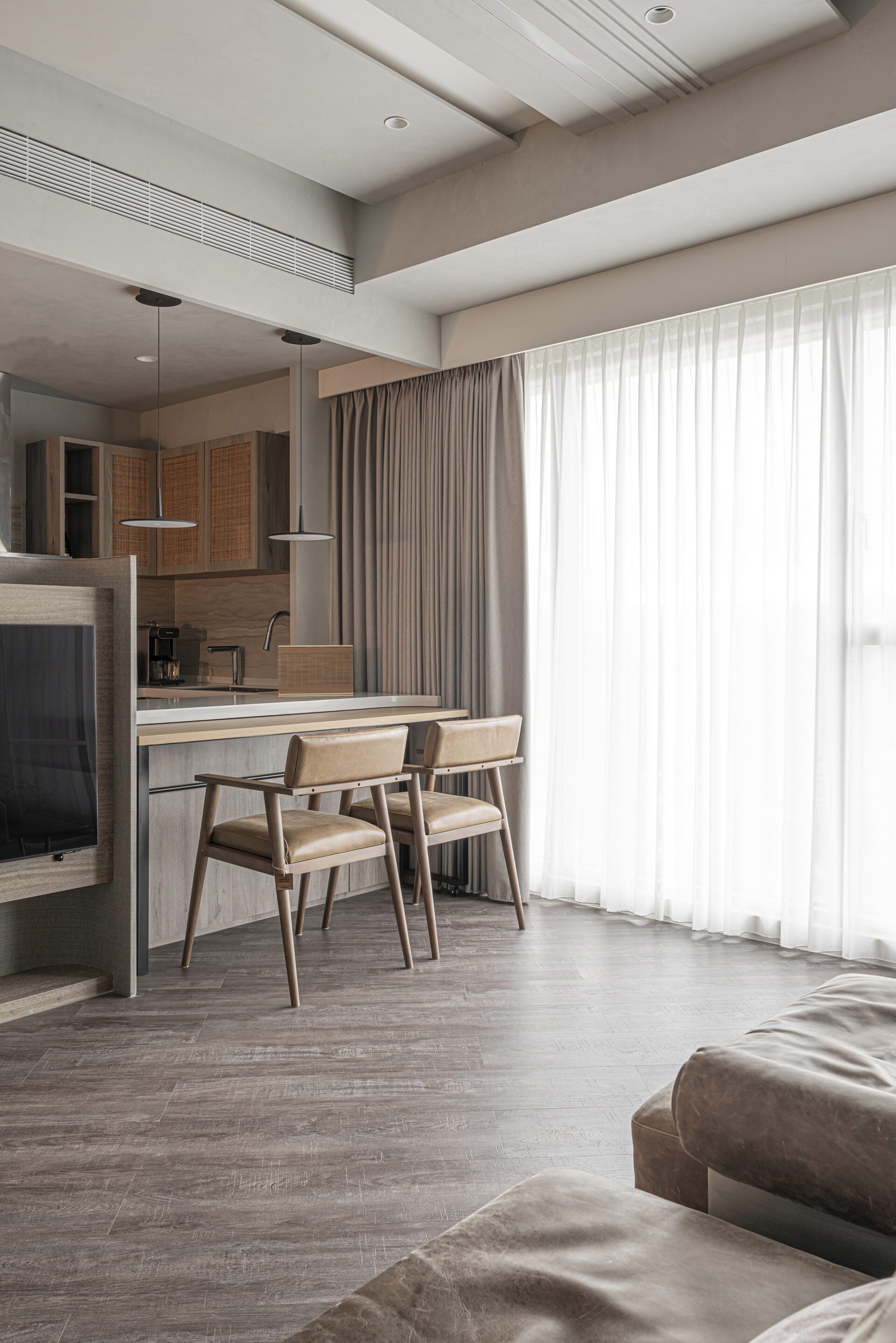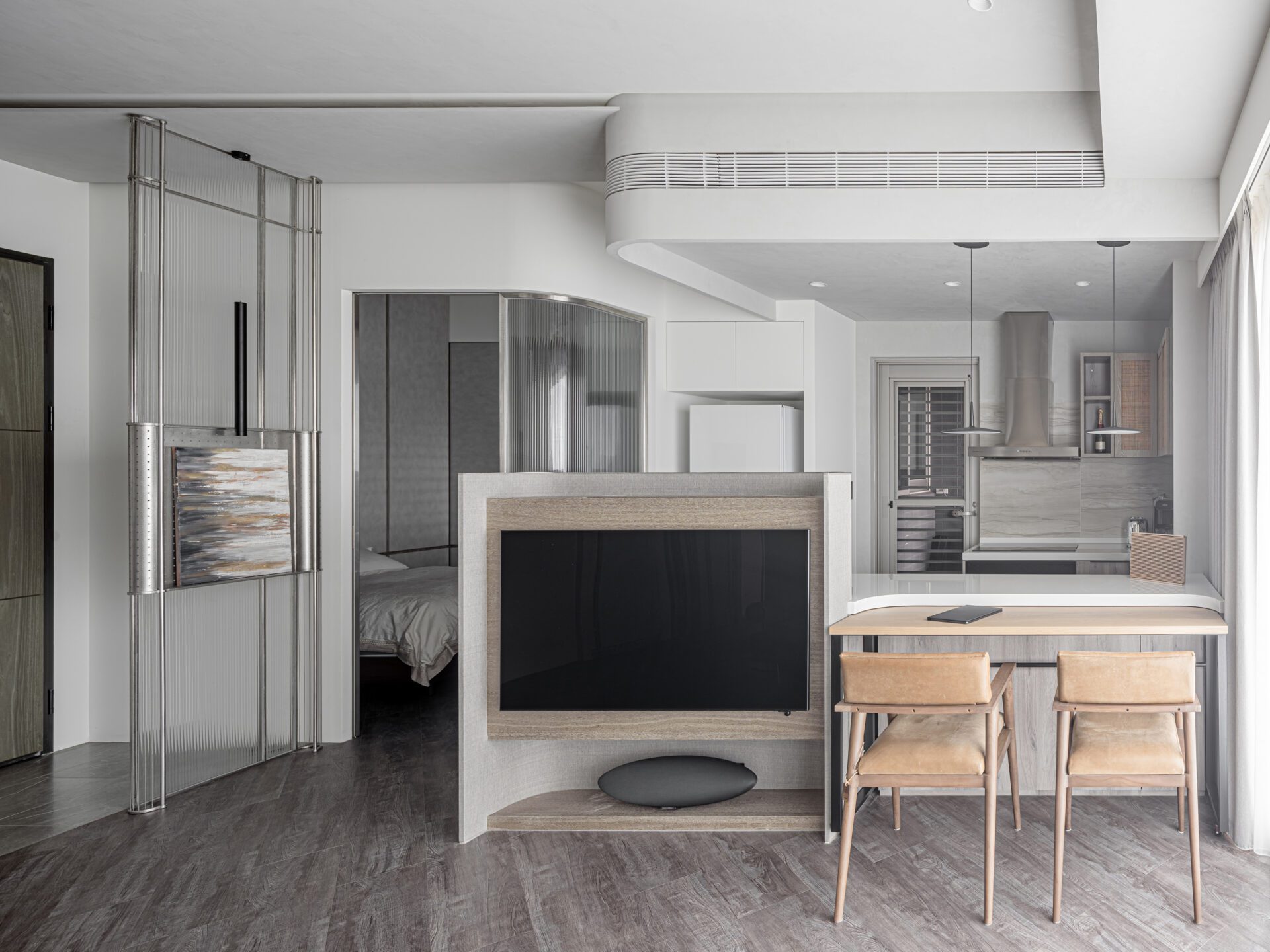 In this case, we make full use of the large viewing windows brought by the high floors, adopt an open kitchen design, combine the central island and the TV wall, and allow the space to be reused. Deliberately leave a side of glass next to the sofa compartment, so that the vision can be well extended, breaking the pattern and maximizing the view and lighting.