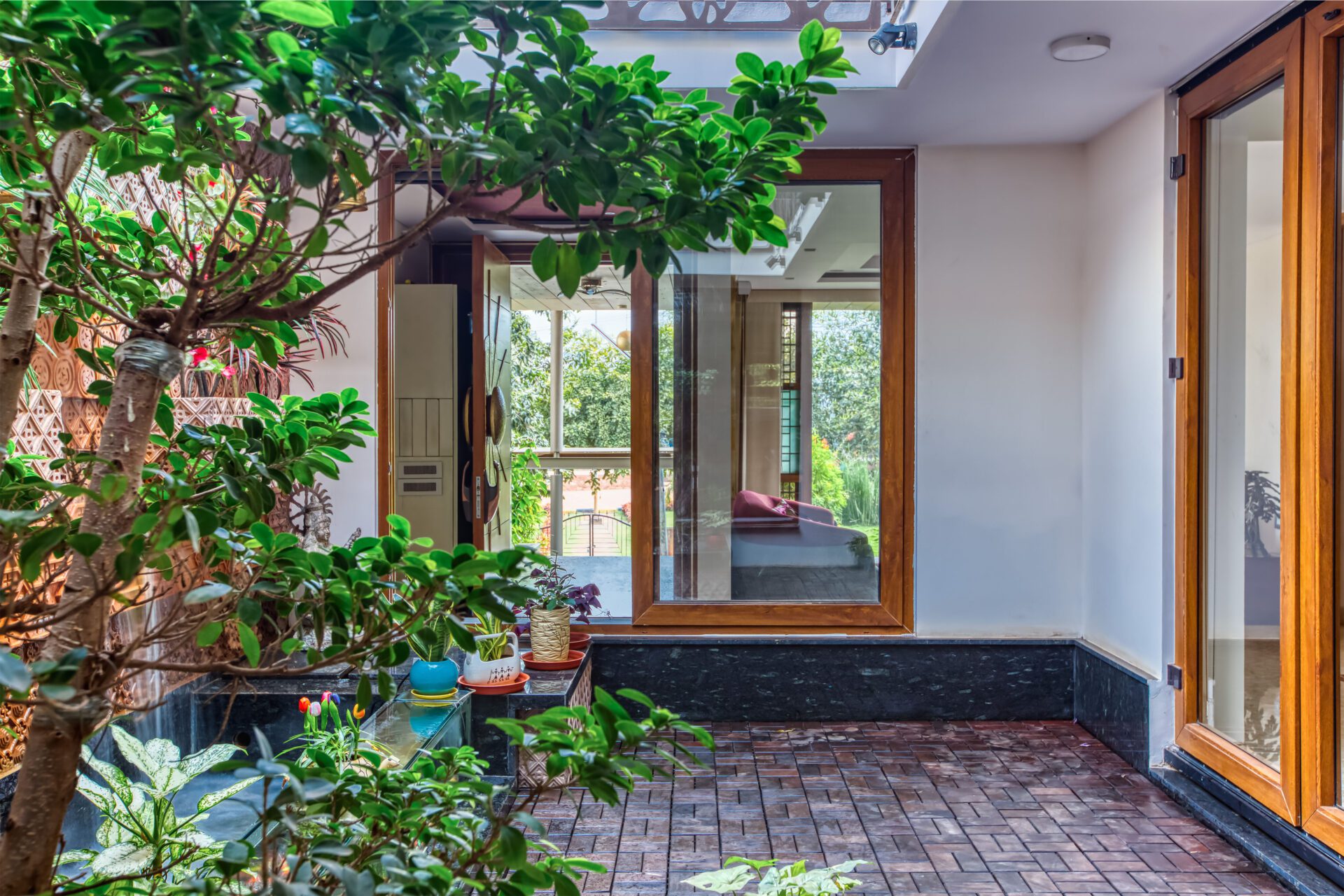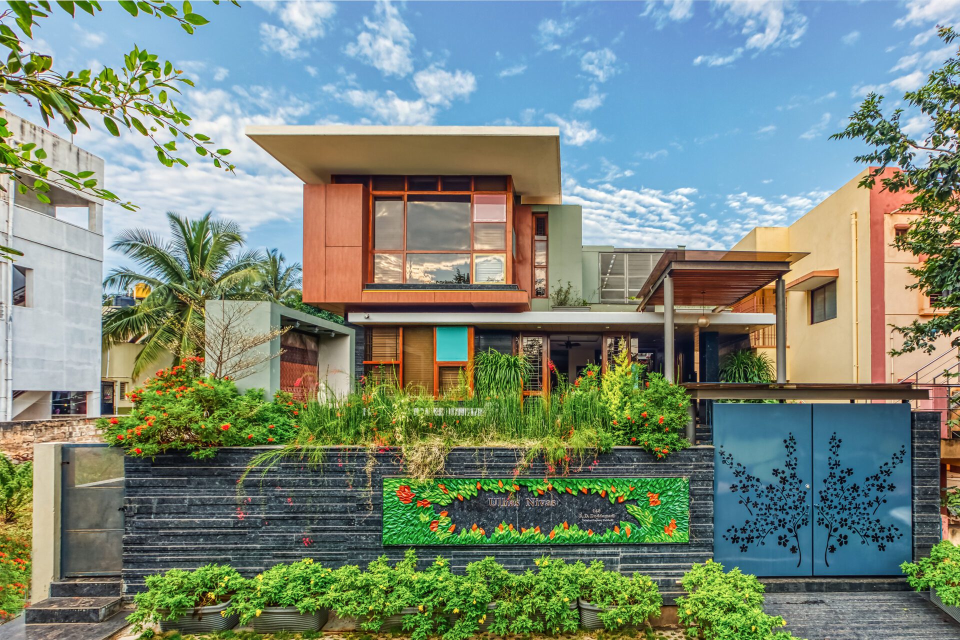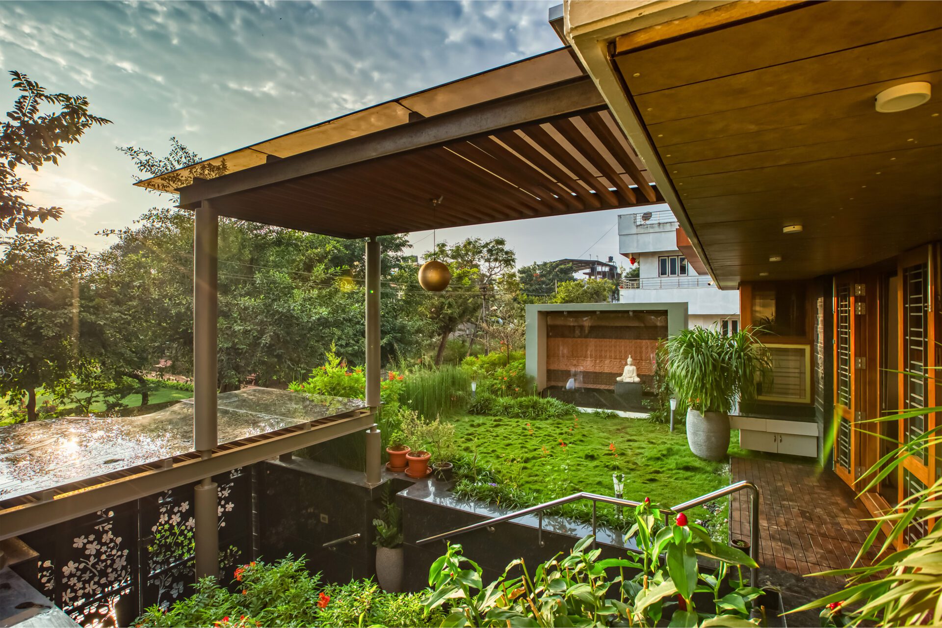 A HOME BY THE PARK is a beautiful house with an infinite visual connection to the Park (neighborhood Park outside the Plot). Nature-loving Clients asked us to design a house that resonates with nature and expresses nature throughout the home. We have taken the advantage of a Public Park in front of the site to extend nature beyond their plot. The inclusion of a Public Park into our design made the house as staying inside nature physically and visually. We connected inhabitants physically with a series of themed Gardens – Front Serene Garden, Central Rain Court, and Private Back Garden, whereas the Public park connected visually and seamlessly. The Front Garden welcomes the guests with a sense of tranquility and peacefulness. To forge a connection between the park and the garden, it has been raised to a level where the Park and the Garden form one vast Visual Greenscape. Though these spaces are separated, they are connected visually. The visual connection is carried along to the Central Rain Court which is strategically placed at the center of the house. This double-height Lung space provides a good connection with the front garden to the public park. The collection of diverse plants and the freshwater aquarium along with diffused light from the court forms its own Microclimate. The aquarium is constantly engaged by a sheet waterfall that burbles, setting a serene mood through the house. All bedrooms open to either the front garden or view of the Park, yet they are designed as private enclosures. The Parents Master Suite opens to the rear garden on the southwest as per the principles of Vaastu. The upper balcony bridged to the family room opens out to the view of the Park.