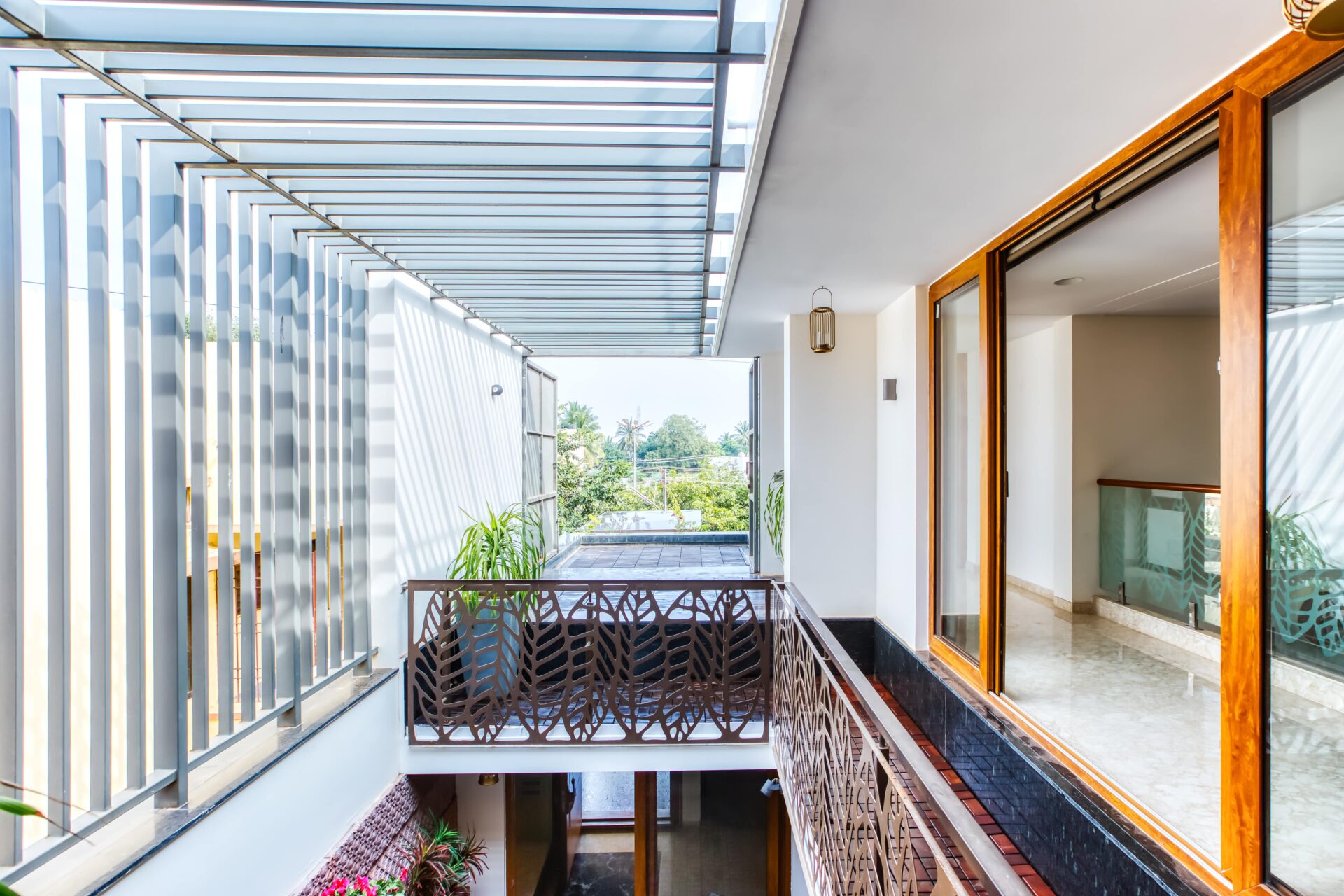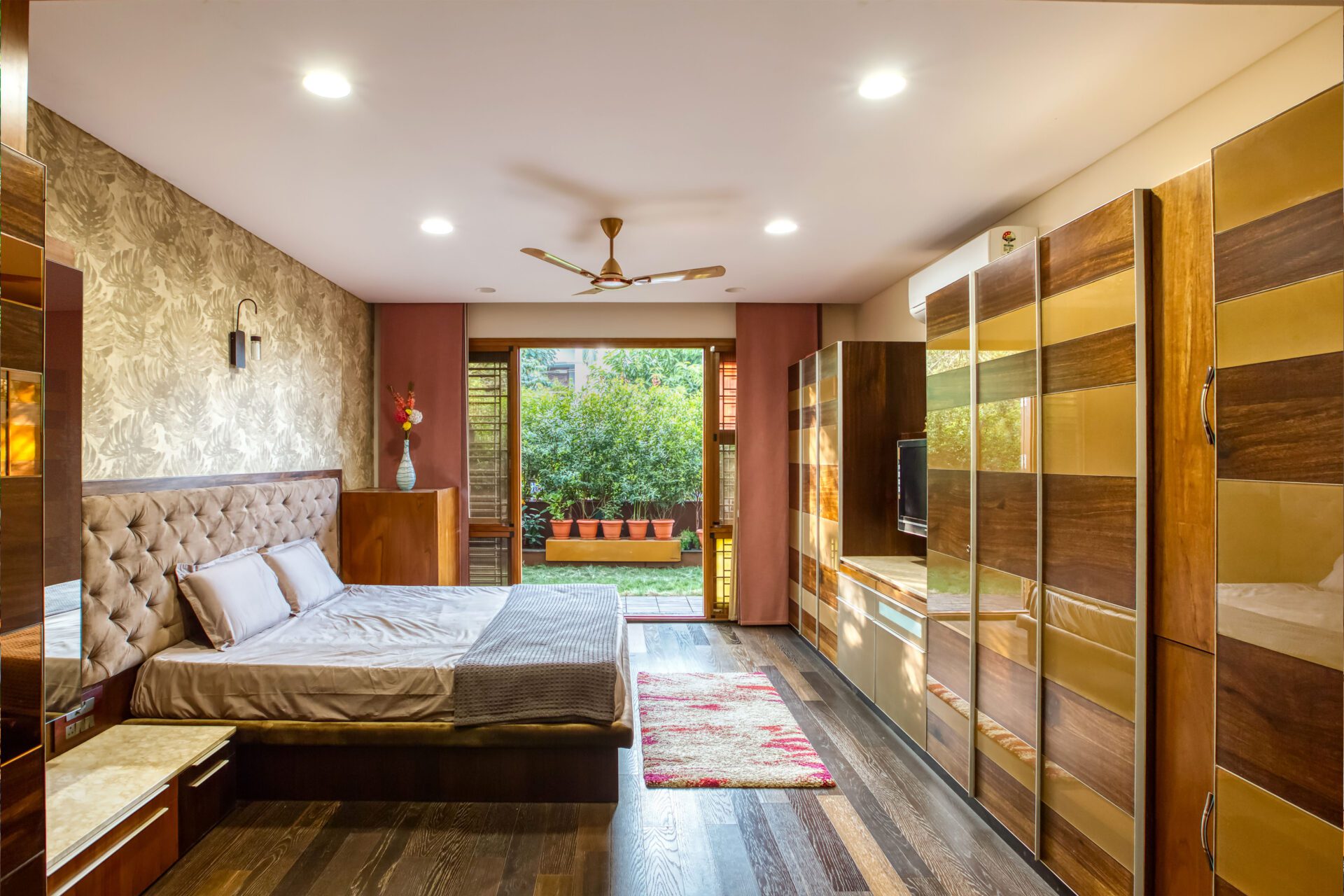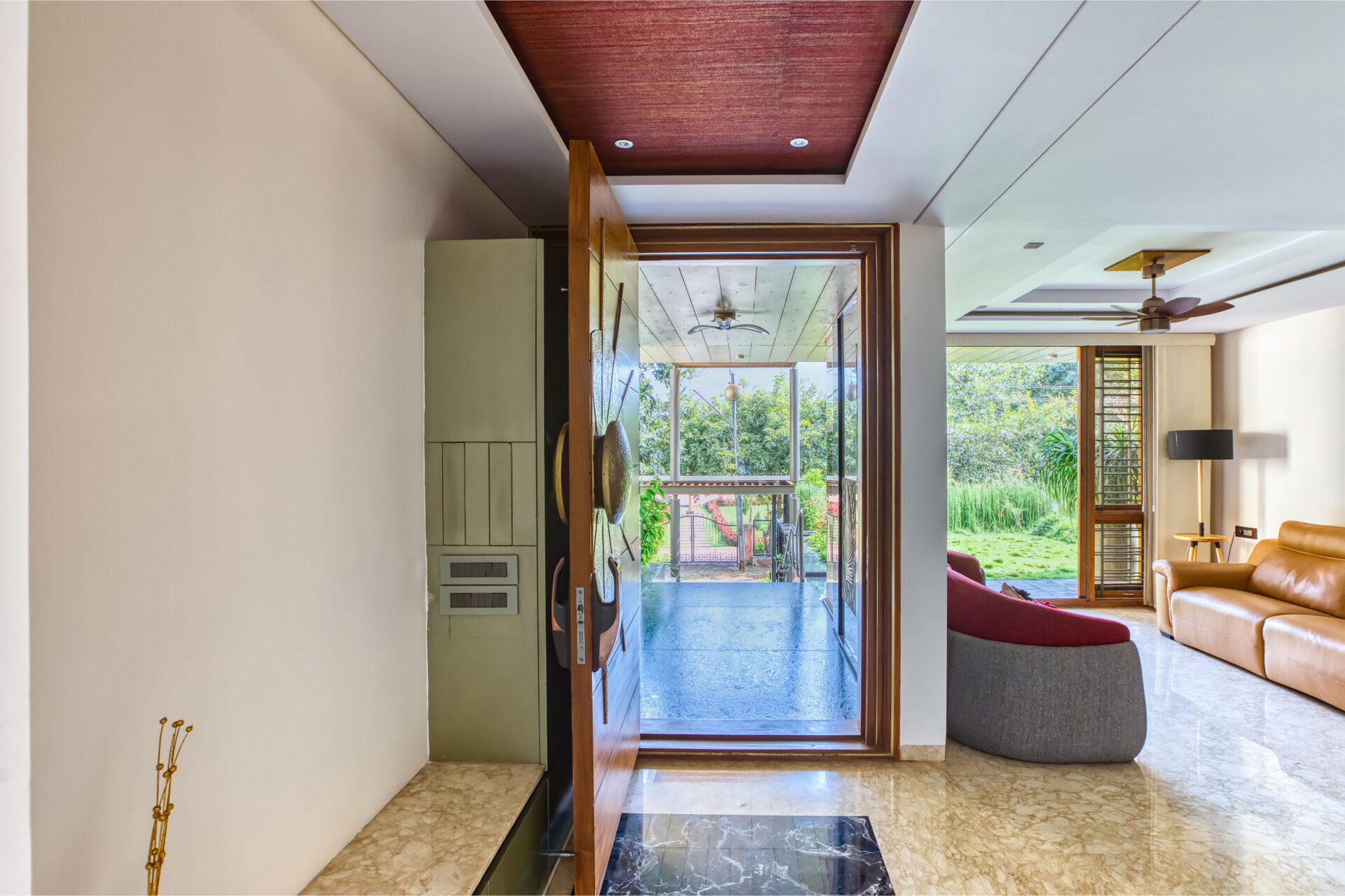 A HOME BY THE PARK is a beautiful house with an infinite visual connection to the Park (neighborhood Park outside the Plot). Nature-loving Clients asked us to design a house that resonates with nature and expresses nature throughout the home. We have taken the advantage of a Public Park in front of the site to extend nature beyond their plot. The inclusion of a Public Park into our design made the house as staying inside nature physically and visually. We connected inhabitants physically with a series of themed Gardens – Front Serene Garden, Central Rain Court, and Private Back Garden, whereas the Public park connected visually and seamlessly. The Front Garden welcomes the guests with a sense of tranquility and peacefulness. To forge a connection between the park and the garden, it has been raised to a level where the Park and the Garden form one vast Visual Greenscape. Though these spaces are separated, they are connected visually. The visual connection is carried along to the Central Rain Court which is strategically placed at the center of the house. This double-height Lung space provides a good connection with the front garden to the public park. The collection of diverse plants and the freshwater aquarium along with diffused light from the court forms its own Microclimate. The aquarium is constantly engaged by a sheet waterfall that burbles, setting a serene mood through the house. All bedrooms open to either the front garden or view of the Park, yet they are designed as private enclosures. The Parents Master Suite opens to the rear garden on the southwest as per the principles of Vaastu. The upper balcony bridged to the family room opens out to the view of the Park.