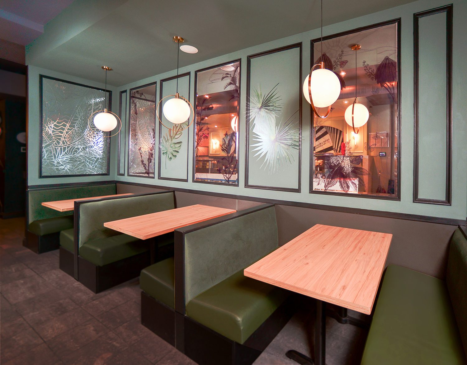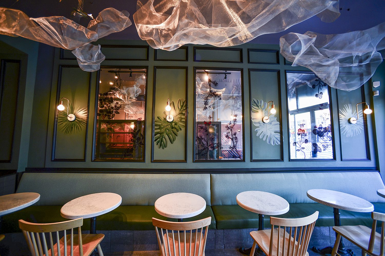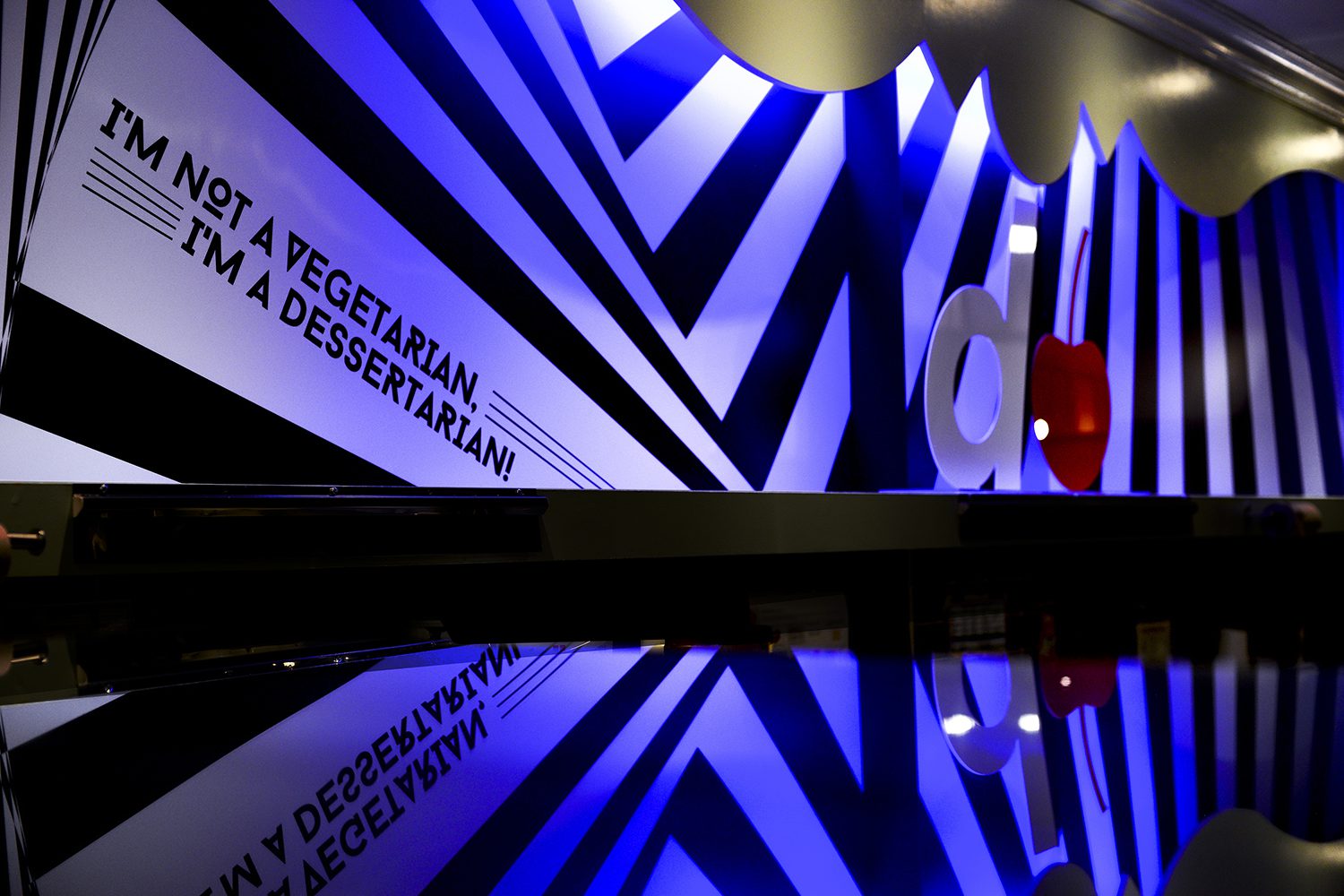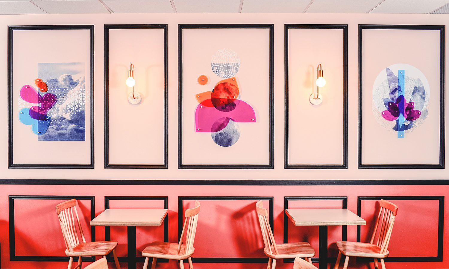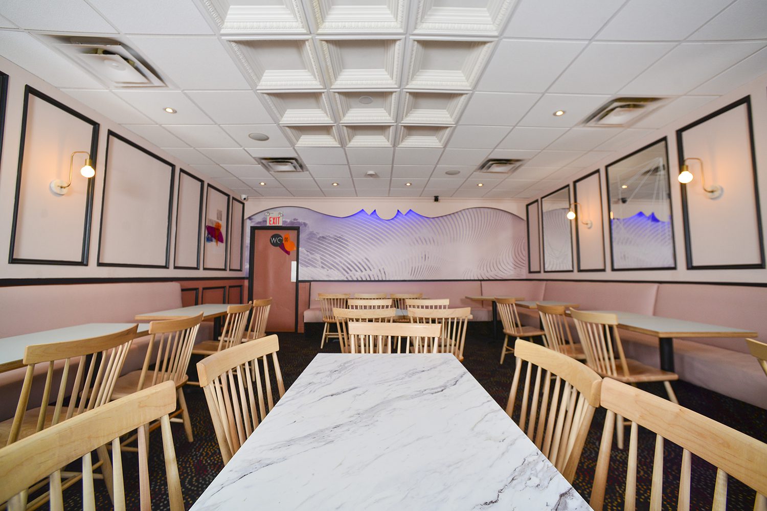 There is a need for a humble, friendly space, where one feels safe and rejuvenated after witnessing an unfortunate event. Through the use of suitable design and functionality, we created a healing and nurturing atmosphere, here at Demetres Danforth. An environment where the guests will enjoy their premium desserts in an upscale yet casual atmosphere that speaks to quality time. Starting with the facade, we wanted to catch the attention of the passersby using movement and transparency, creating an illusion- like effect, an intense style with a diverse shift of colors upon looking at it from different angles. An enticing feeling. Plant and wildlife motifs cover the walls and mirrors, forming a play on illusions. Frothy pastel seating intersects with stark bold lines of millwork that give an air of playfulness with a grown-up approach. Color-changing lights on feature walls allow the owner to set the overall mood of the cafe, while warm glowing orb pendants set the tone for couples sharing an intimate moment. Delicately textured clouds and silver bird mobiles fly in groups above the diners. A soft little piece of beauty and harmony within the boundaries of simplicity. There’s a sense of play on the back wall where the dessert is prepared, using bold lines with LED strip lighting can change the color of the wall while pink intensifying a finished look. Once we added in all the new elements, the entire cafe looked completely transformed into a refreshing environment.