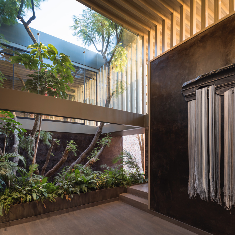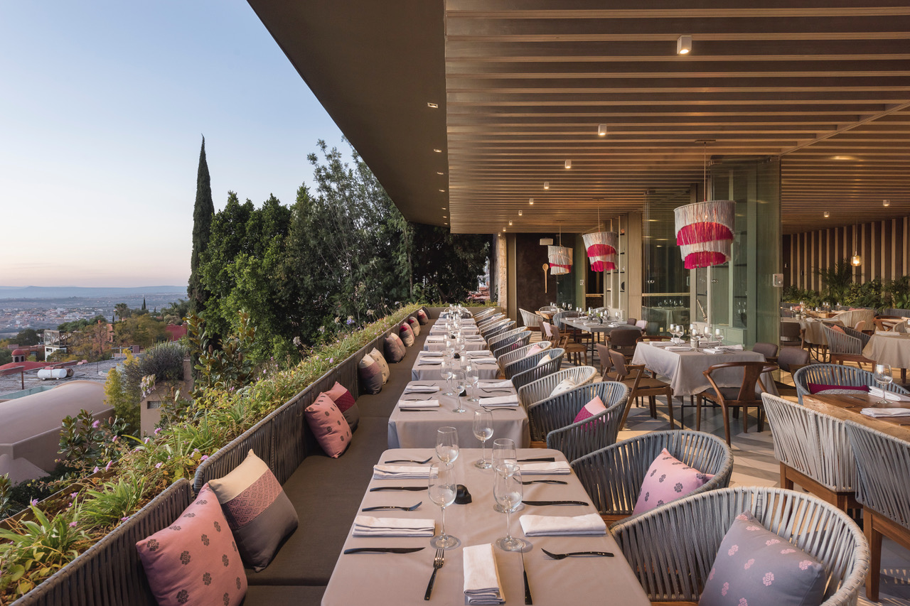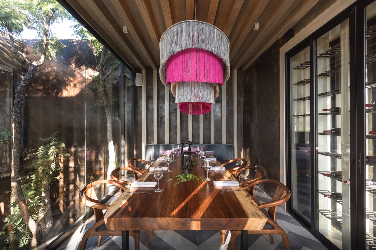 Adela is a restaurant that reinterprets the local 17th century colonial architecture of San Miguel de Allende through sober elements and the openness of natural materials. This restaurant was built on what was previously a fronton court, where honoring the origin and essence of Mexican folklore is the design axis on which this project was created. "Adela - cuisine of origin", seeks to create an experience where Mexican cuisine stands out through the honesty of the ingredients and the authenticity of the dishes. For this reason, the concept starts from a reinterpretation of the local colonial architecture, where the openness of natural materials and traditional elements speak for themselves, in an unpretentious space where our roots rise to create a sensory experience of contemporary Mexican folklore. A sober facade was designed in stone masonry from the region, interrupted only by the steel gate that gives access to the lobby - a spectacular double-height space, where the first visual finish is a sculptural loom designed by the artist Mariella Motilla. In turn, this reception is embraced by a lush garden where a jacaranda stands out - visible from all parts of the restaurant - which was respected from the beginning of the project to be seen in the interior space. As you climb the steel and wood plate staircase, you are surprised by the change in scale and dimensions of the restaurant, where the 40-meter length of the premises is unimaginable from the outside. The simplicity in the design of the interior space is based on the repetition of wooden beams - an element that is taken from the ceilings of the old houses of Guanajuato - which go down the wall and run through the entire space, thus emphasizing the dramatic perspective that it is generated and allows the spectacular panoramic view to be the focal point of the project and the enjoyment of the diners. Adela is a restaurant that reinterprets the local colonial architecture of the century XVII of San Miguel de Allende through sober elements and the frankness of natural materials. In one of the places with the most tourism in the country and with great wealth in terms of he colonial architecture, Adela's intention was to recover an old pediment in San Miguel de Allende, preserving the colonial architecture and transferring it to the present. The intention to highlight the traditional and natural materials of the region was primordial without generating pretensions, the masonry façade was designed with stone of the region, generating economic activity with the local population. Long-lasting elements, easy maintenance and good esthetic. The jacaranda was rescued and became one of the main elements found on the site and that I frame the project design. - visible from all points of the restaurant - being respected was one of the initial objectives of the project to be contemplated in the interior space. As you climb the steel plate and wood staircase, the change in scale and dimensions of the restaurant, where the length of 40 meters of the premises it is unimaginable from the outside. The simplicity in the design of the interior space is based on the repetition of wooden beams - element that is taken from the ceilings of the old mansions of Guanajuato - which go down the wall and go through the entire space, thus emphasizing the dramatic perspective that is generated and allowed the spectacular panoramic view will be the focal point of the project and the enjoyment of diners Our favorite element is the corridor that leads to the wine cellar, a tunnel where the wooden beams descend, as if it were a large latticework. The tour is lived in a dynamic way, on the one hand thanks to the view of the jacaranda, and on the other when discovering the steel plate shelves on which local crafts such as molcajetes, catrinas and clay cups are exhibited. The sun makes this journey magical, changing the space throughout the day with the play of light and shadow that is generated. Arriving at the cellar, a private room was created with a view of the interior garden: an intimate space where to taste the wines under the dim light of the vibrant textile lamp that flutters over the parota wood table. All the furniture and decorative elements are of national and artisan manufacture, highlighting the cushions made on a backstrap loom, the black clay lamps by David Pompa, the textile lamps by Mariella Motilla and all the local crafts that decorate the space, acquired in the neighboring towns. This exercise became an apprenticeship to discover once again the enormous potential that we have in our country, where the delicate artisan hand should be a pride and be exalted through our projects, to share them with the whole world, as well as Mexico. open your arms and your heart.