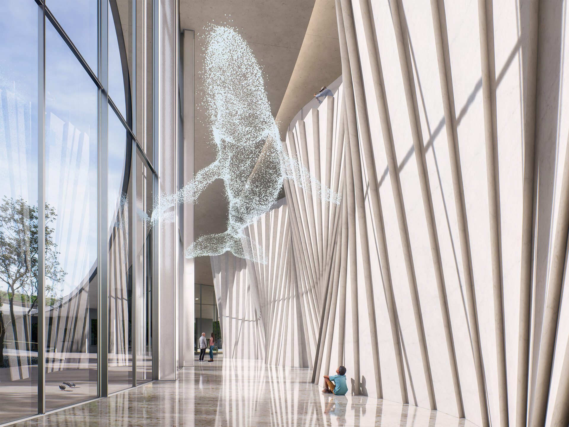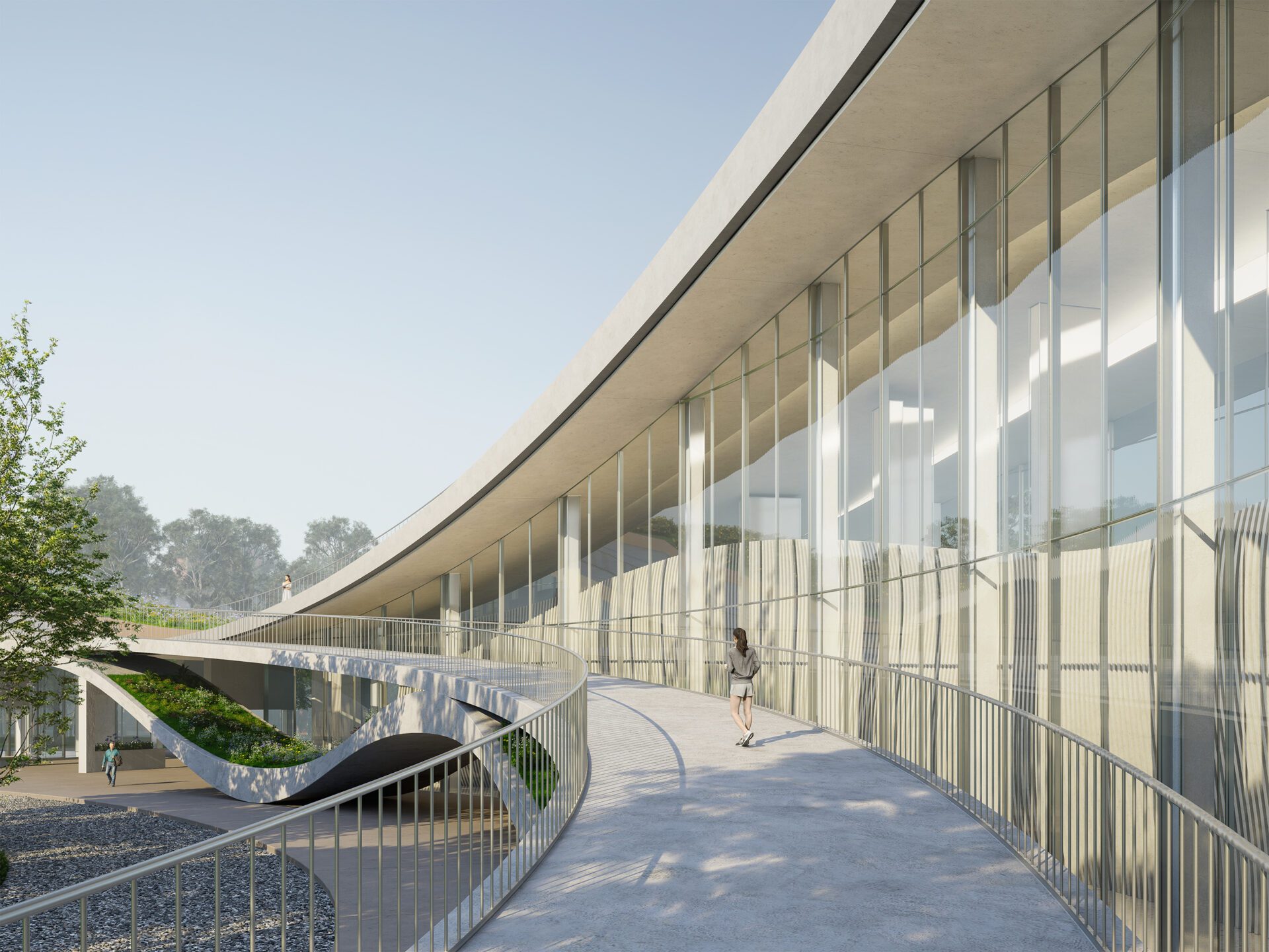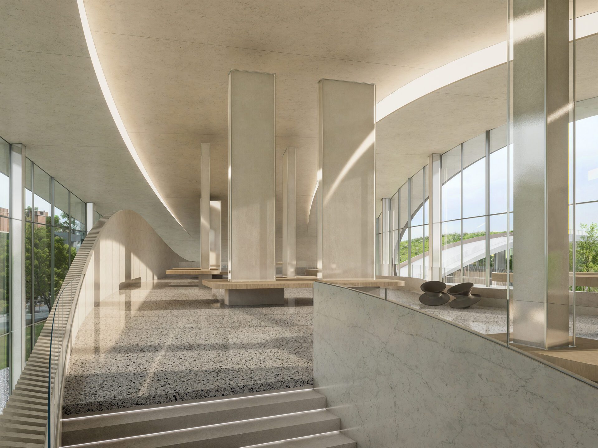 Throughout the design, fluid curves and varied elevation unify the spatial language of both form and plan. A continuous outer glass skin encases the structure, abstracting and amplifying the presence of columns. This reinterpretation introduces a sense of freshness and surprise to the architectural experience.