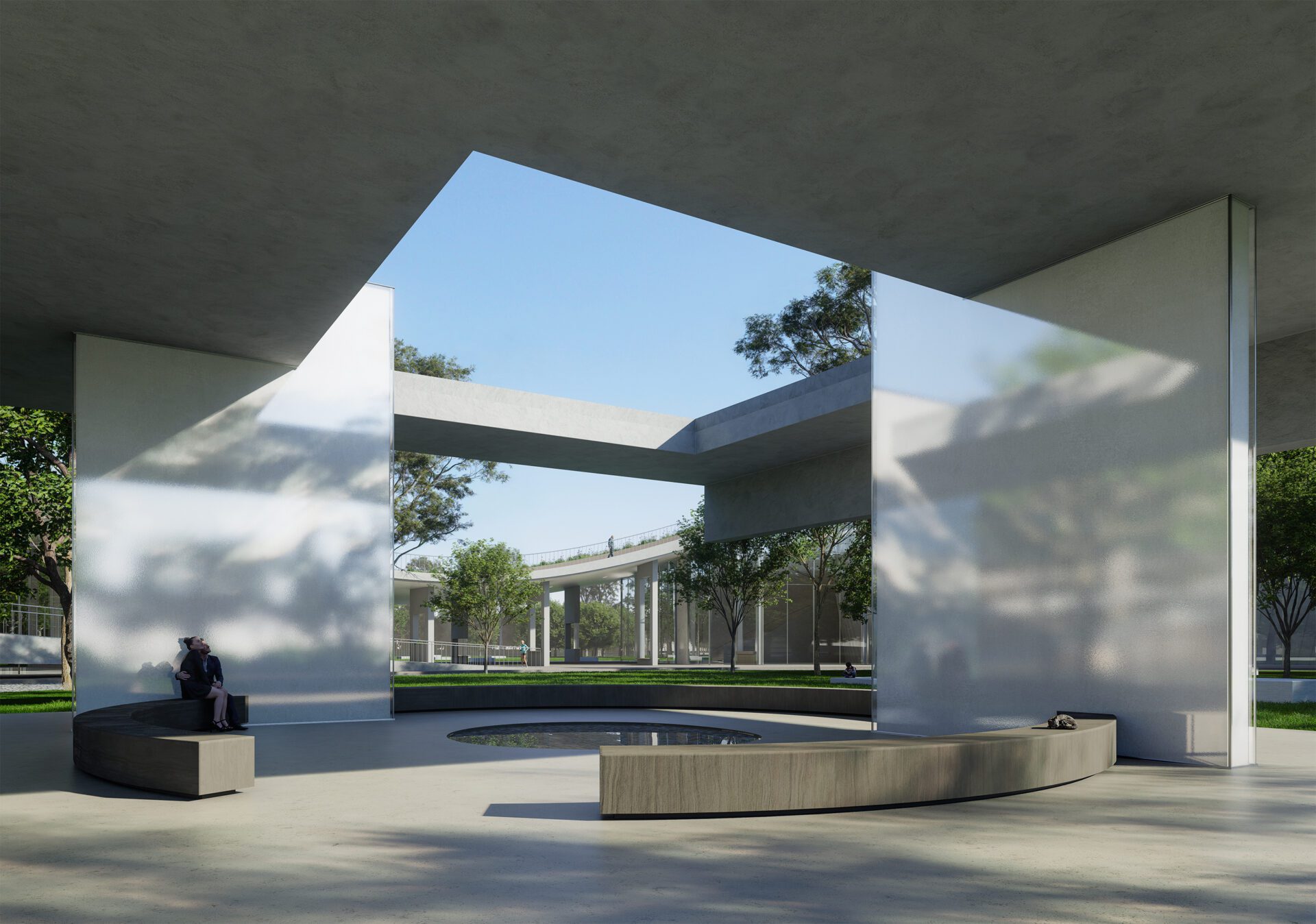 As a public structure on a public site, the design begins with the intention to return open space to the people—preserving the site's original freedom and flow. On an open lawn, people naturally move without constraints. Aero Grove transforms this idea of freedom into soft, fluid curves, which shape both the plan and volume of the building. The architecture is defined by two offset circular forms. Facing the main road and parking area, the outer ring is opened with a series of varied apertures that create visual and physical connections between the courtyard and the surrounding cityscape. Landscaped benches extend from the courtyard outward, forming a gentle transition from built environment to urban boundary, supporting a range of activities through varying heights.