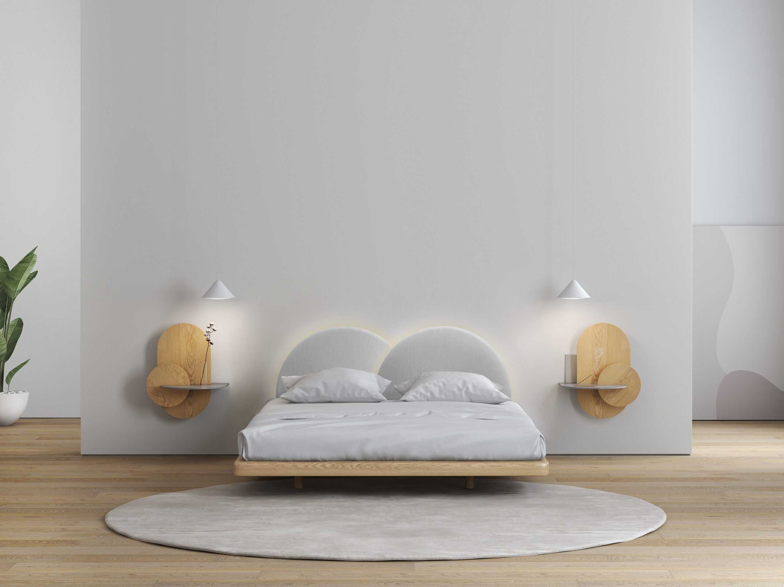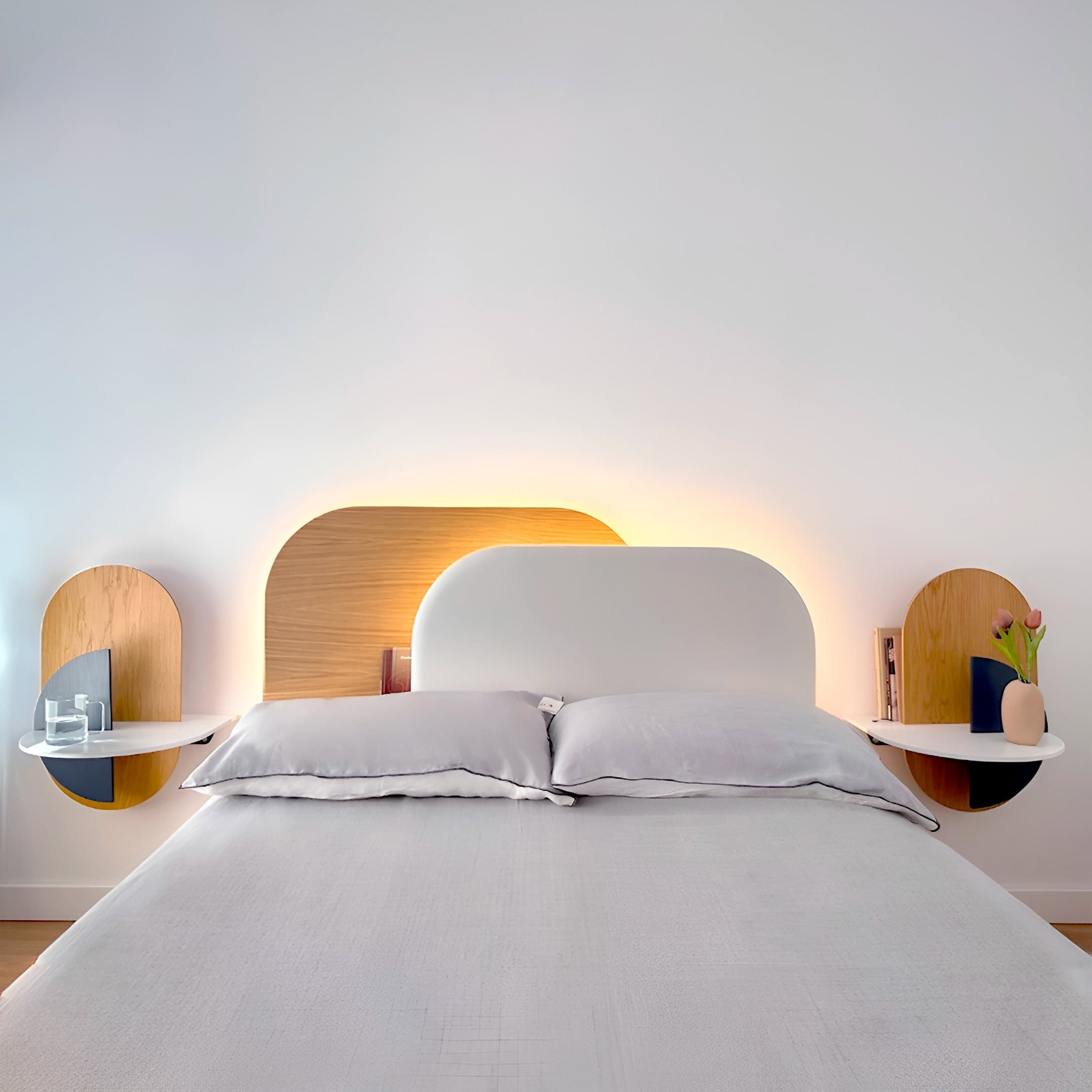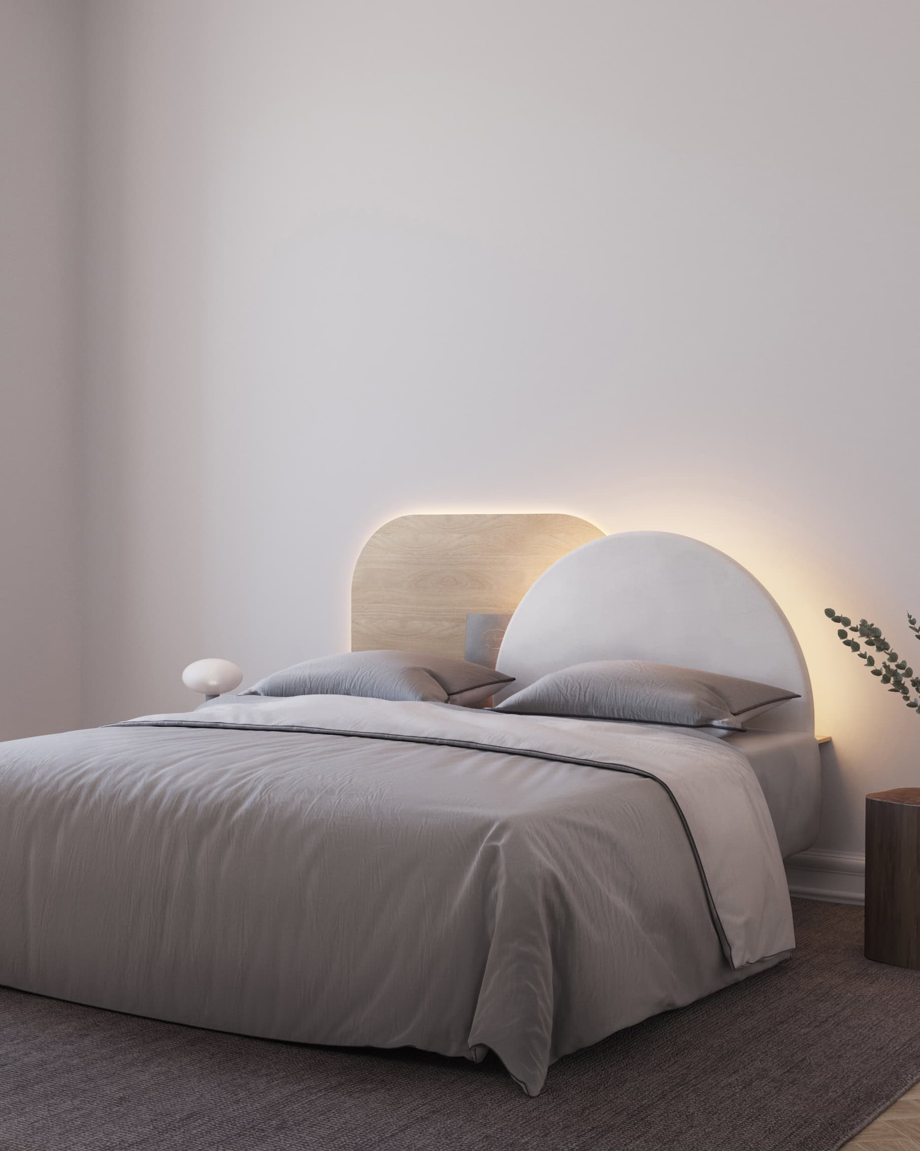 A unique headboard with a sculptural touch that brings personality and elegance to your home. Fully modular and customizable, our Alba headboard consists of two panels that overlap in the centre, allowing it to adapt to different bed sizes. It also features a hidden shelf at the back for small everyday objects and the possibility to add a dimmable backlight. Available in a sustainable wood finish or in a beautiful textile. Carefully manufactured with our Design with Intention philosophy locally in Spain.
