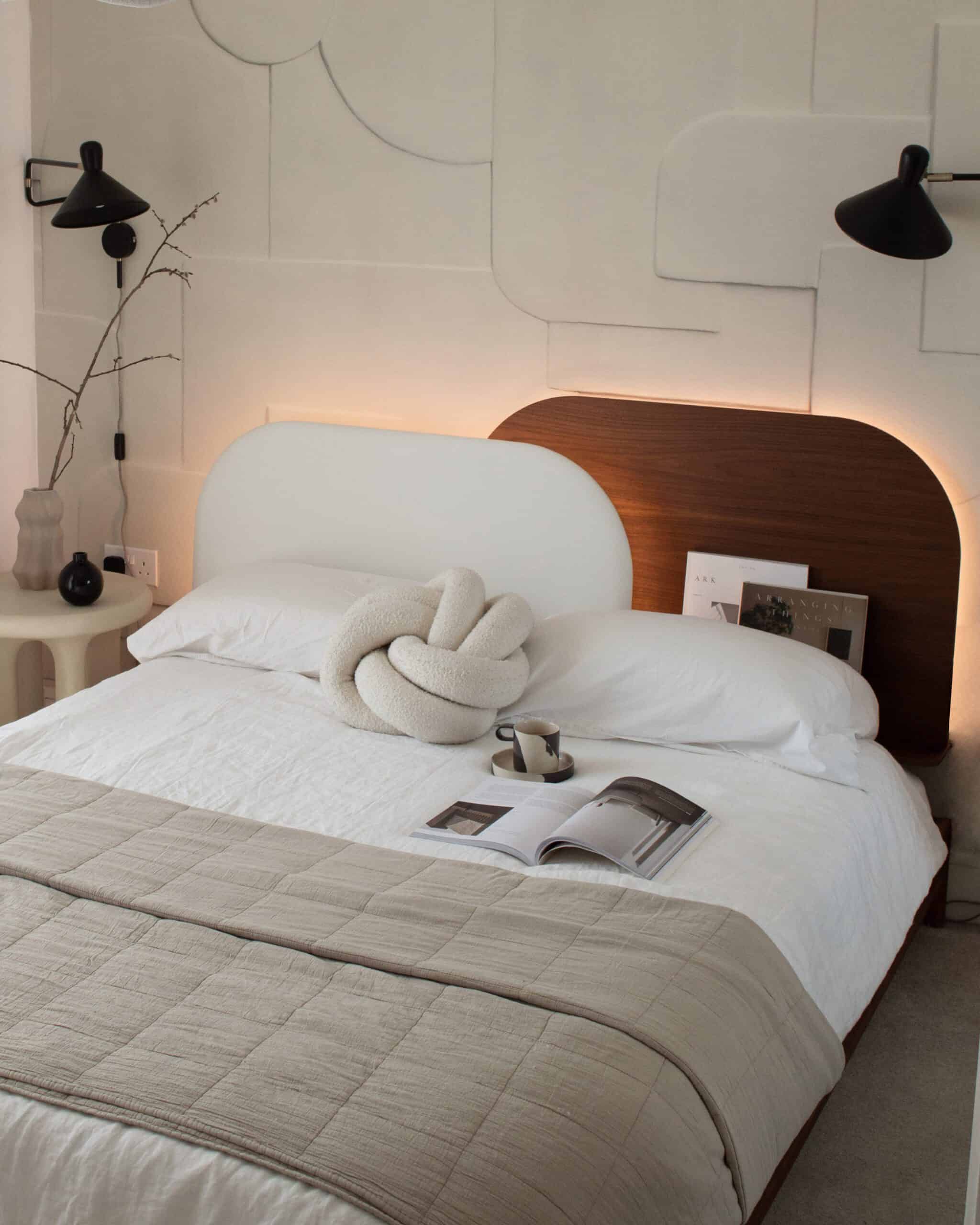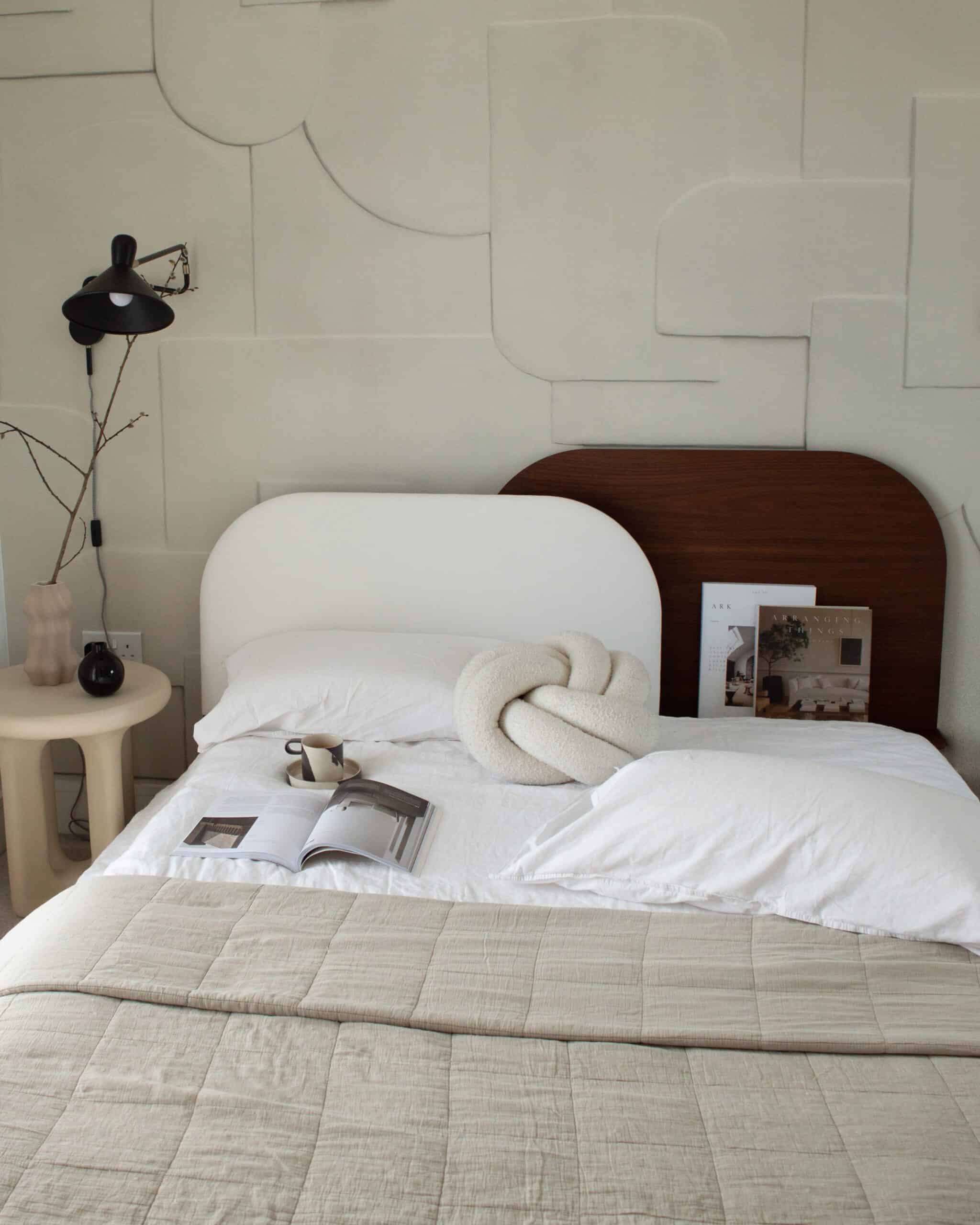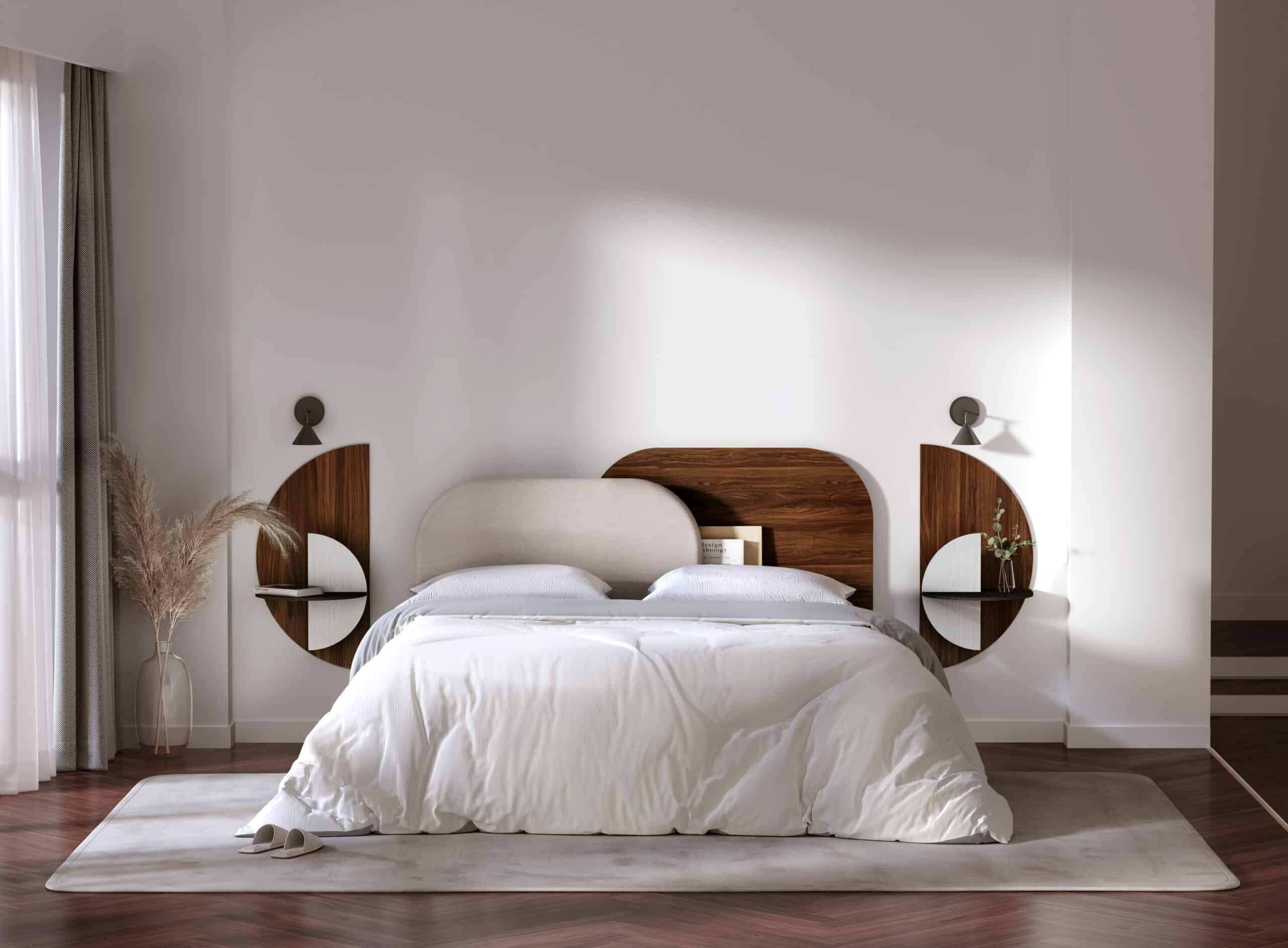 A unique headboard with a sculptural touch that brings personality and elegance to your home. Fully modular and customizable, our Alba headboard consists of two panels that overlap in the centre, allowing it to adapt to different bed sizes. It also features a hidden shelf at the back for small everyday objects and the possibility to add a dimmable backlight. Available in a sustainable wood finish or in a beautiful textile. Carefully manufactured with our Design with Intention philosophy locally in Spain.