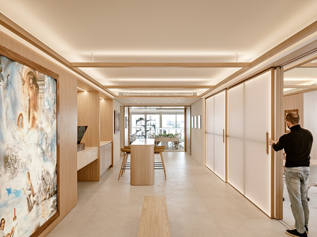 Amplitude, neutrality and lighting are the project’s highlights, as they elevate the works of art to the position of protagonists, in combination with the light tones’ palette, which lends sobriety to the environment. Wooden grids support the large light fixtures in the public area, which bathe the environment indirectly, completing the visual effects created by the lighting applied to the sliding panels in allusion to the sailboat that also inspired the project. “In the art panels and niches, we washed the wall with direct light to highlight the works. It is as if the pieces were transformed into light fixtures, reflecting their colours in the environment”, adds Carlos Andrigo.