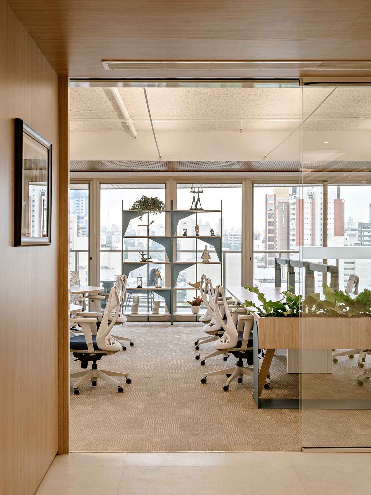 With the new office of the advisory and consultancy company, the characteristic volumes of the Oscar dos Santos Emboaba Building gain an unconventional complement: wide and neutral spaces mark the 350m² that open like an art gallery connected to the outside.