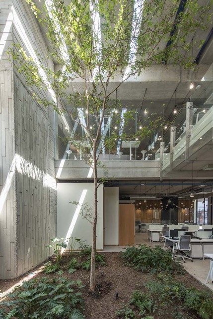 The design premise consisted of developing a 2-level building almost entirely made of concrete, which would enhance both the exterior and the interior due to its combination of textures and series of volumes. Inside, the concrete walls and double heights generate a comfortable and illuminated atmosphere through large skylights. The core of the project is defined by an interior patio that houses a tree, allowing the entry of natural lighting and ventilation. On one side of this element, there are the stairs that are surrounded by a concrete lattice.