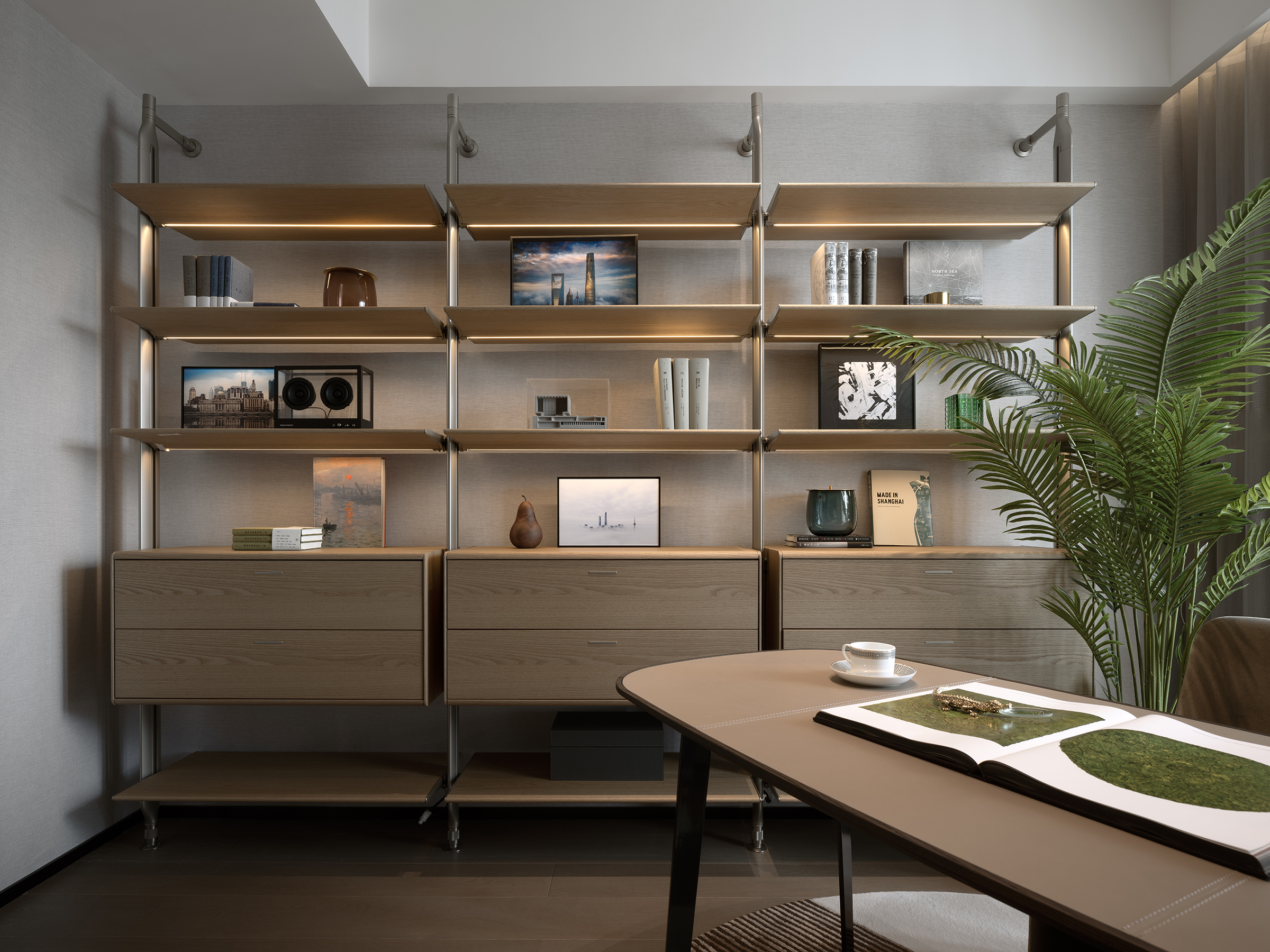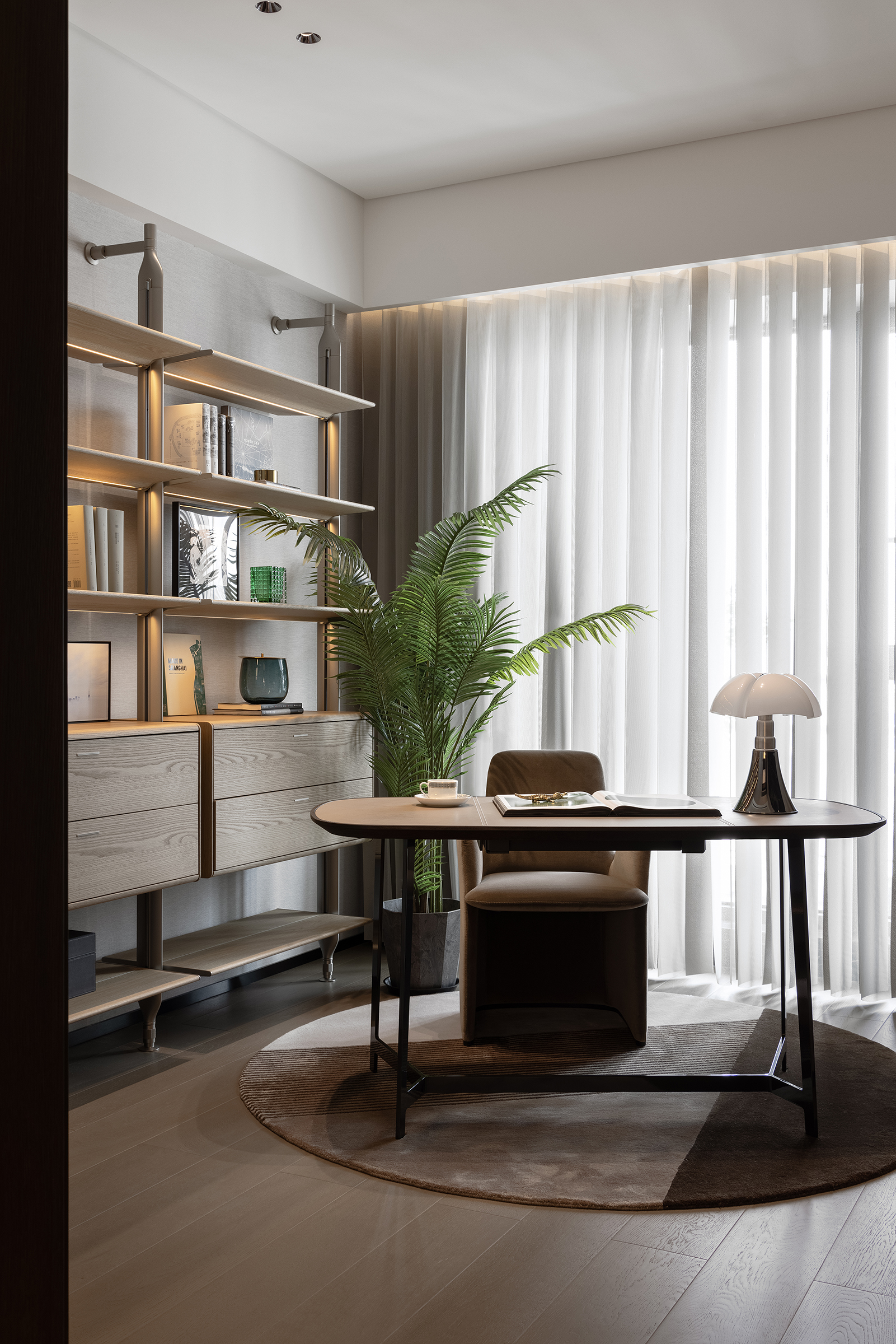 The entire collection of imported desks and bookshelves in the apartment share exquisite craftsmanship and a similar slimness in shape. The main desk is delicately inlaid with solid wood and leather, its subtle curves softening the strong, clean lines of the metal structure. The bookshelf has a strong architectural aesthetic and can be custom mounted with hinged doors, drawers, shelves, and storage cabinets. Soft, stylish chairs and circular rugs complete the stylish effect, providing a comfortable yet refined setting for study or work.