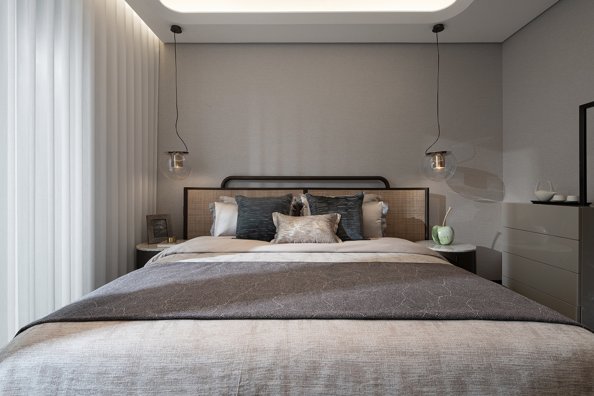 The design of the master bedroom presents a pristine yet comfortable environment with tranquil, dignified colors, and a carefully curated selection of simple, rich fabrics. Gold-tinted bedside light from a selection of glass chandeliers by Italian design companies Lodes and Oluce provides a warm ambience, while exquisite gilt picture frames evoke a past era of Art Deco aesthetics.
