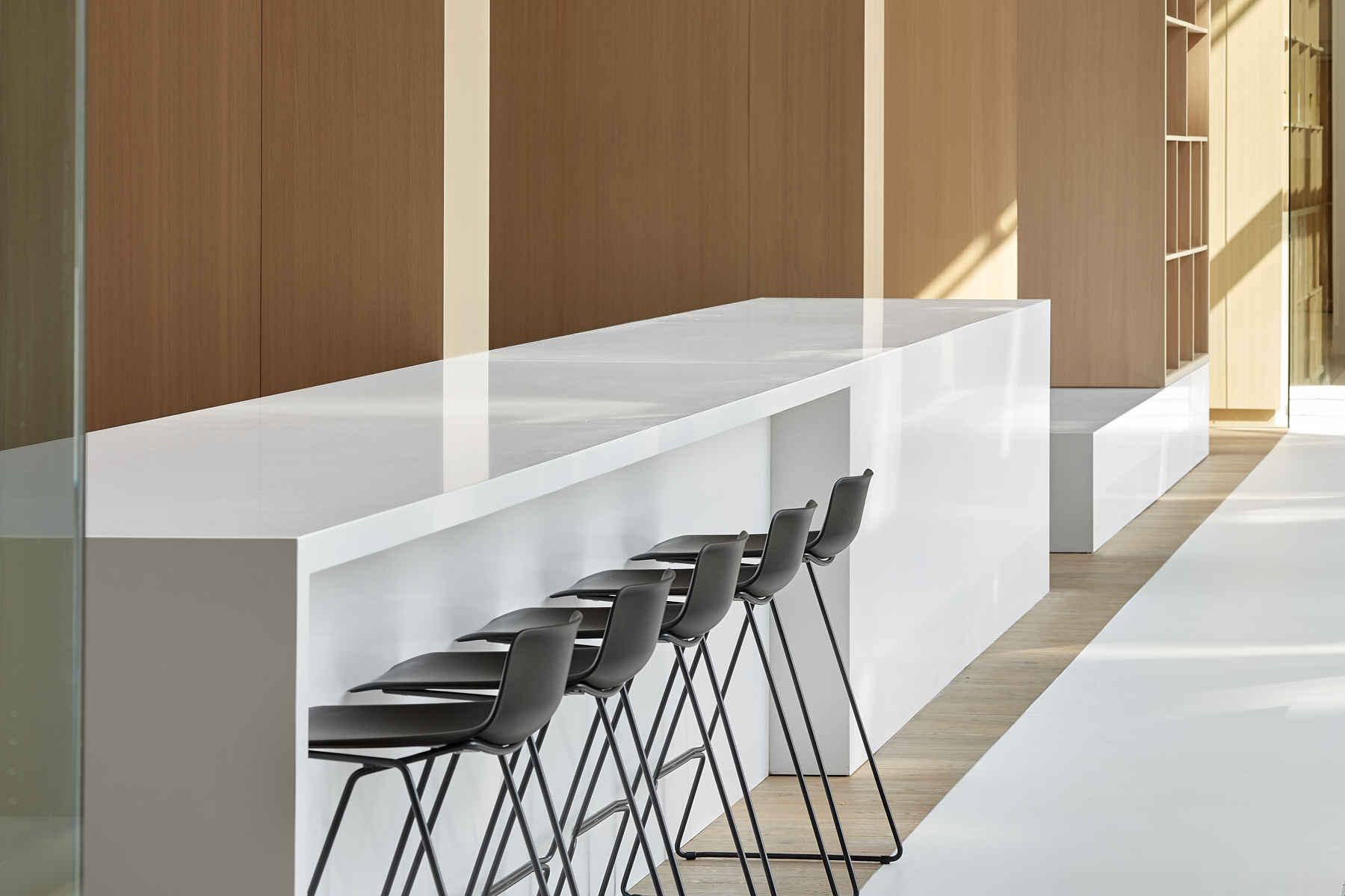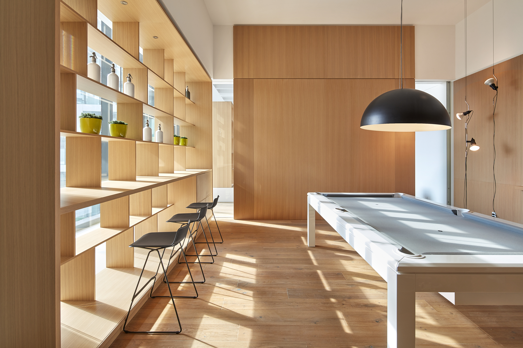 For the amenities, the spaces are sculpted to create permeable vistas from one area to the next. Light coloured millwork acts as screens and room dividers, offering a peek into the activities in each room. The corridors occur at the glazing so that all guests can enjoy views and daylight; it’s an egalitarian approach to space utilization.