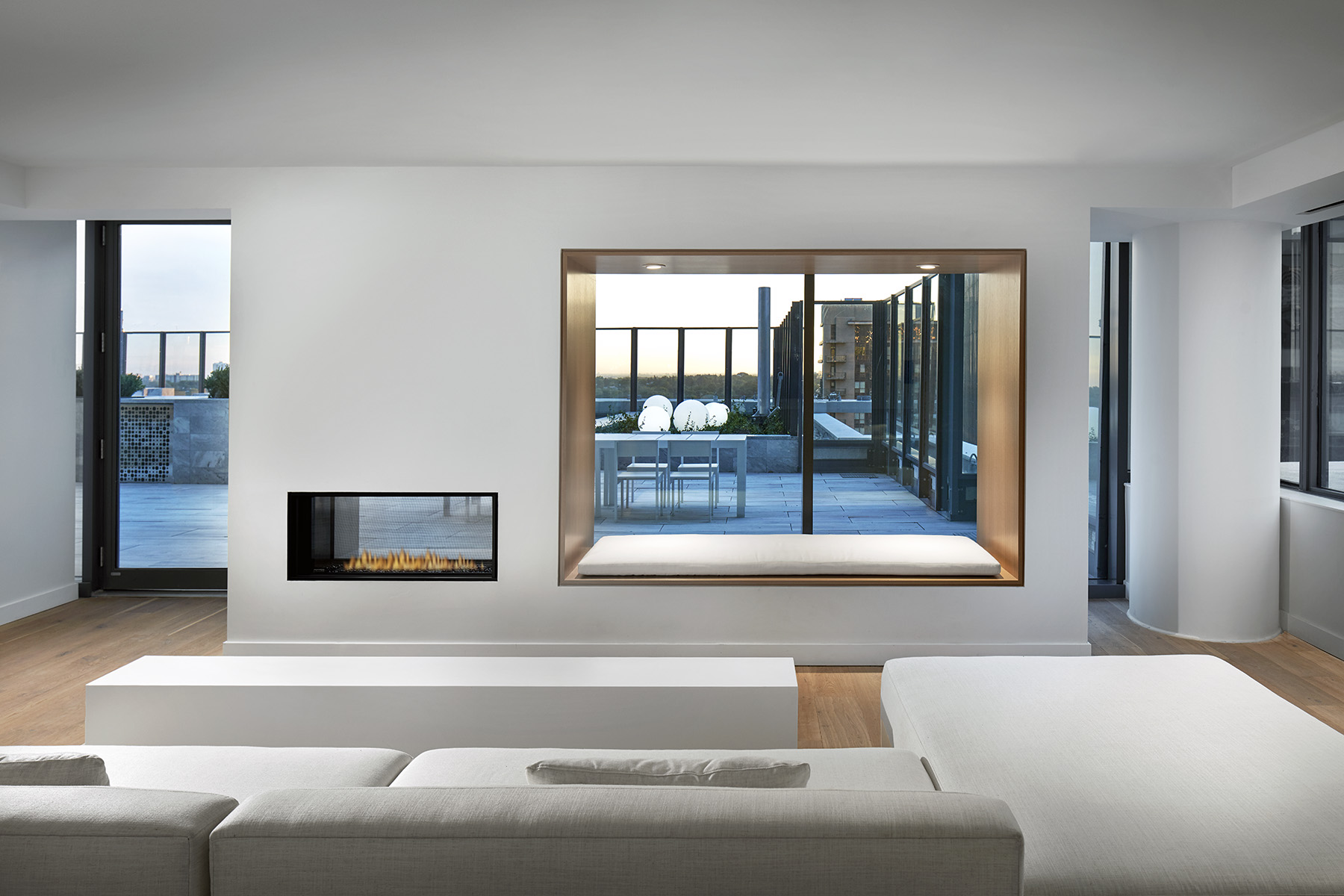 One of the most dynamic amenities is the roof top pool. It is long and linear and frames spectacular city views. The adjoining interior spaces have been designed to work seamlessly inside to out, while creating framed views to the exterior.