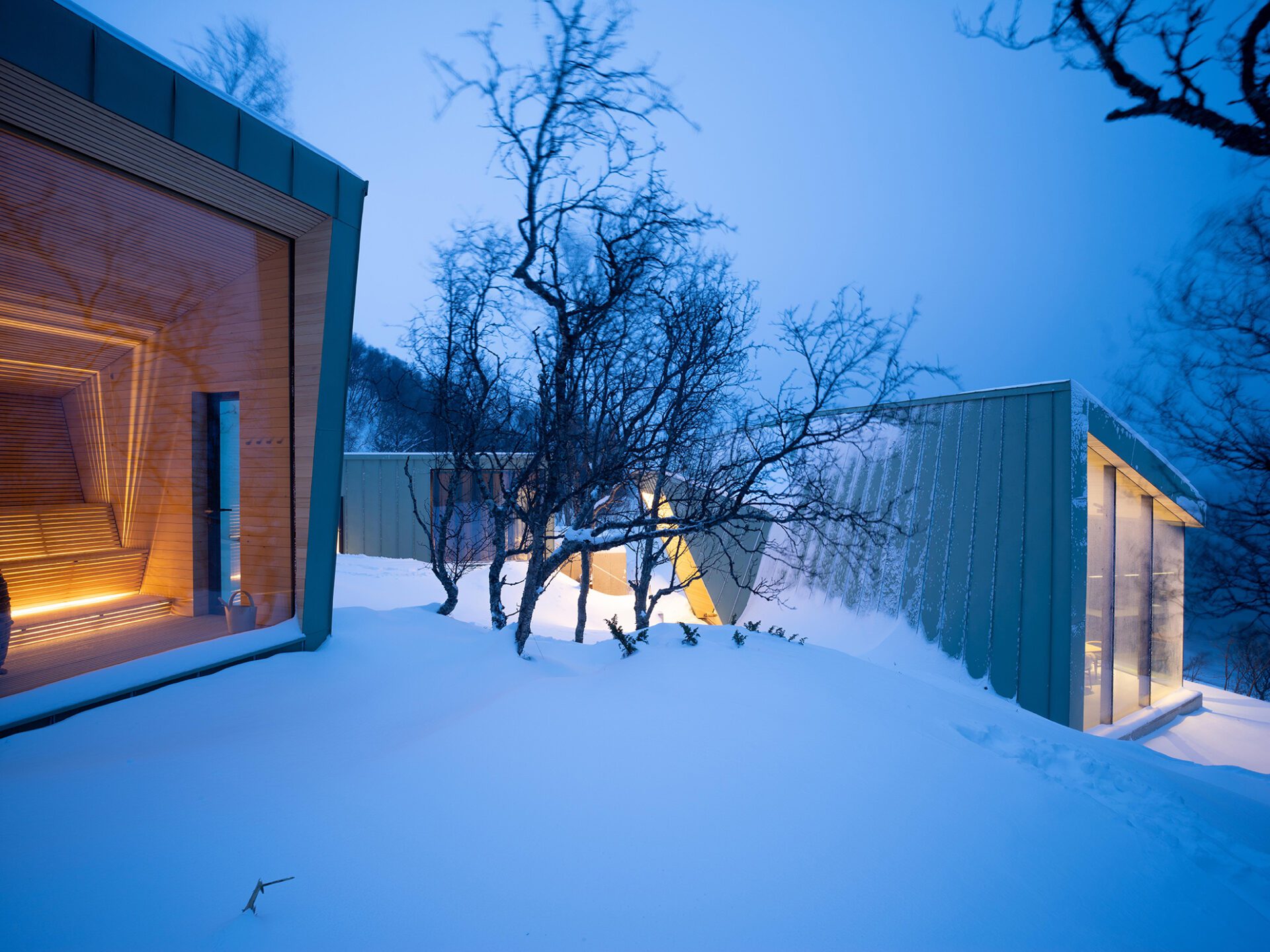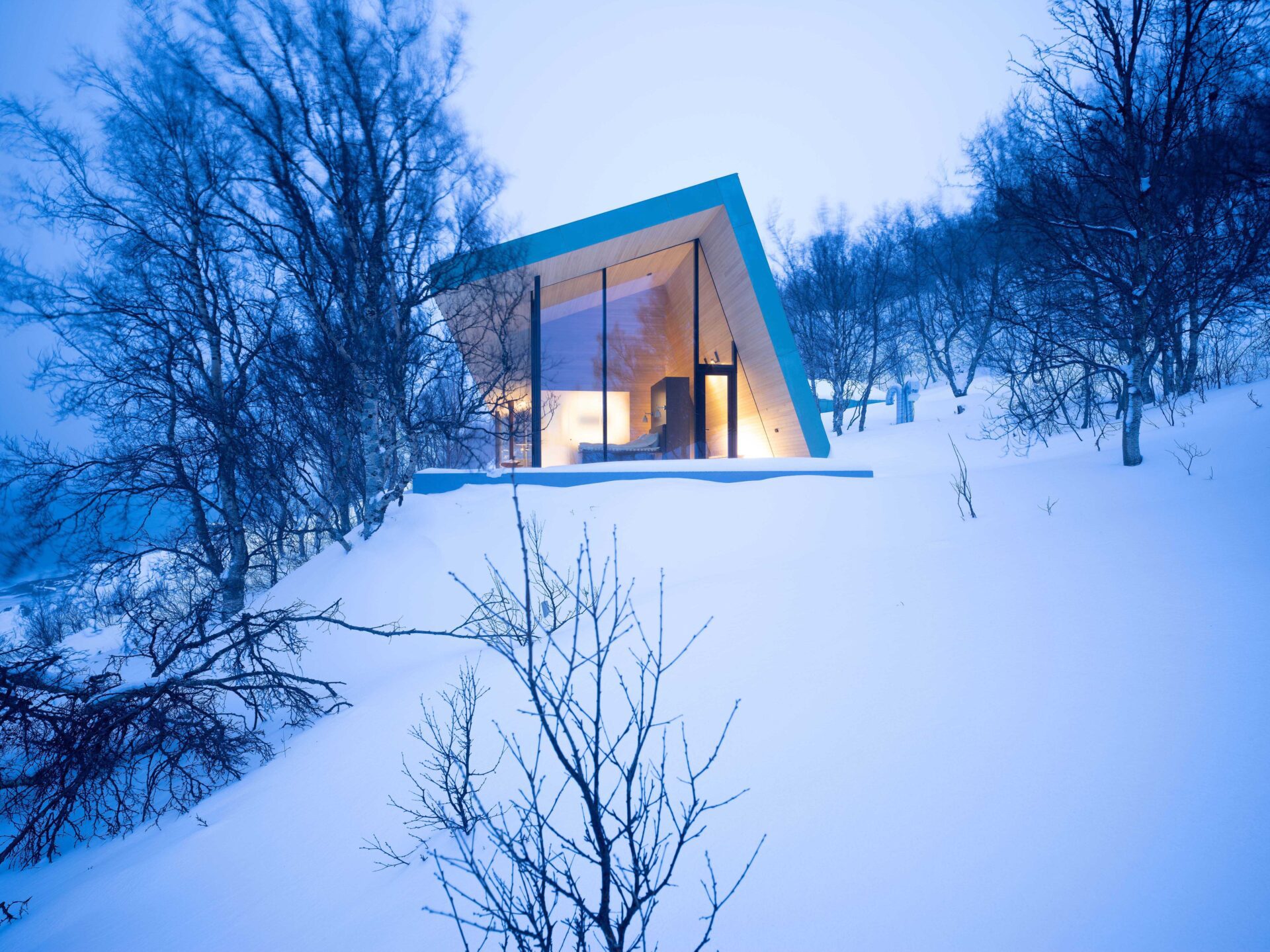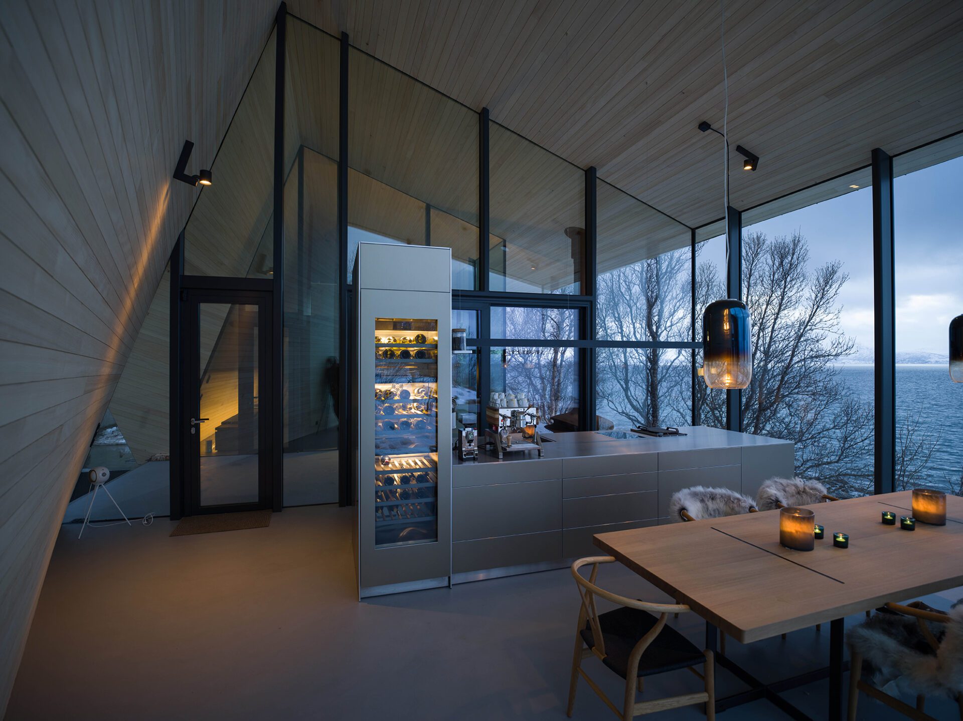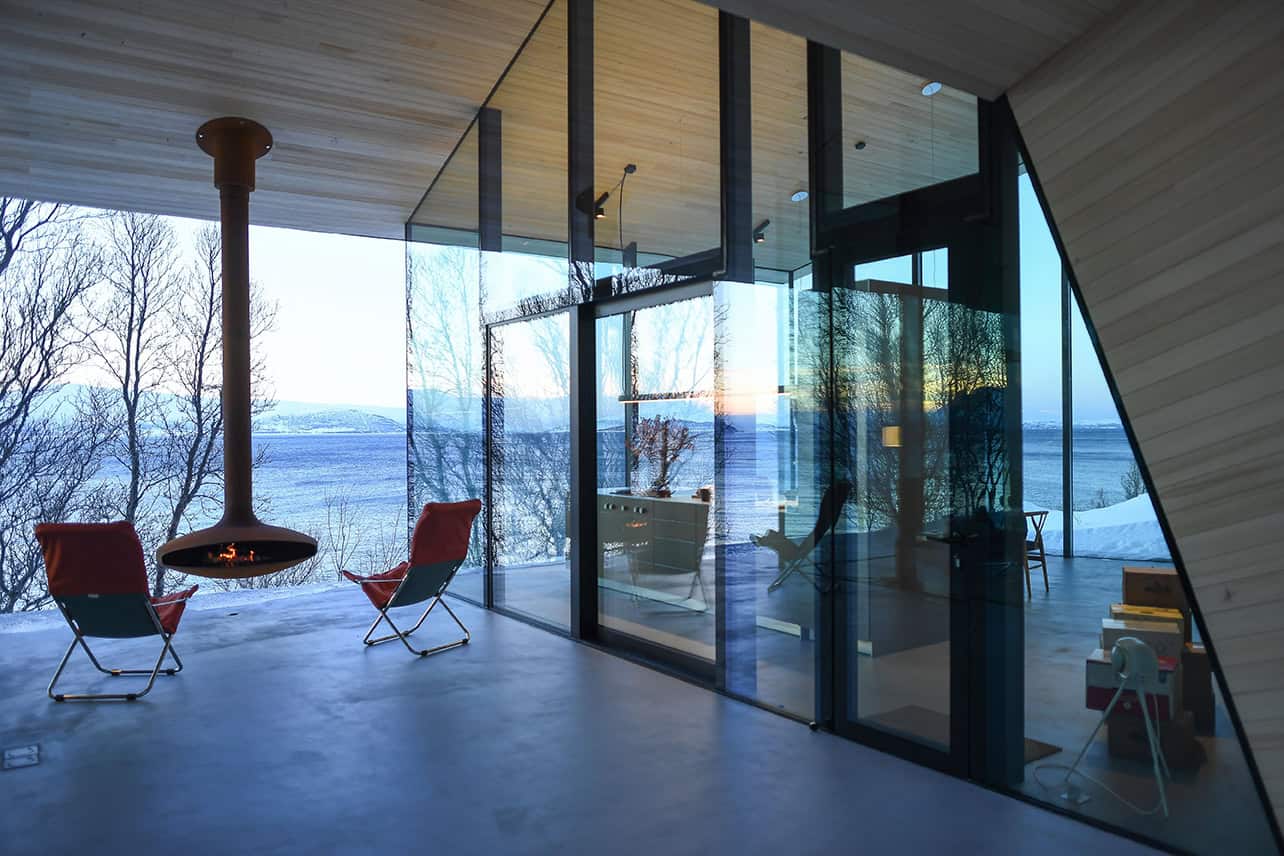 Located in the remote Lyngen Alps this private chalet is organized within a main structure comprising two units and terraces, a separate suite and a sauna across the creek. With respect for nature being the key inspirations for this project, the design endeavors to complement the site, with the main building stretching out across the natural plateau. High ceilings and seamless glass walls invite the sky and landscape into the building. The concrete floor and terraces are an extension of the natural terrain. A simplistic A-frame design echoes a fundamental shelter; however here tilted back from the seaside to an angle where the roof is aligned with the surrounding terrain, to provide privacy on one side and panoramic views on the other. The main unit houses five bedrooms with private, en-suite bathrooms and a living room. The northernmost unit houses the kitchen and dining room, designed like a ‘winter garden’ observatory to provide fantastic views across the sea to the horizon.