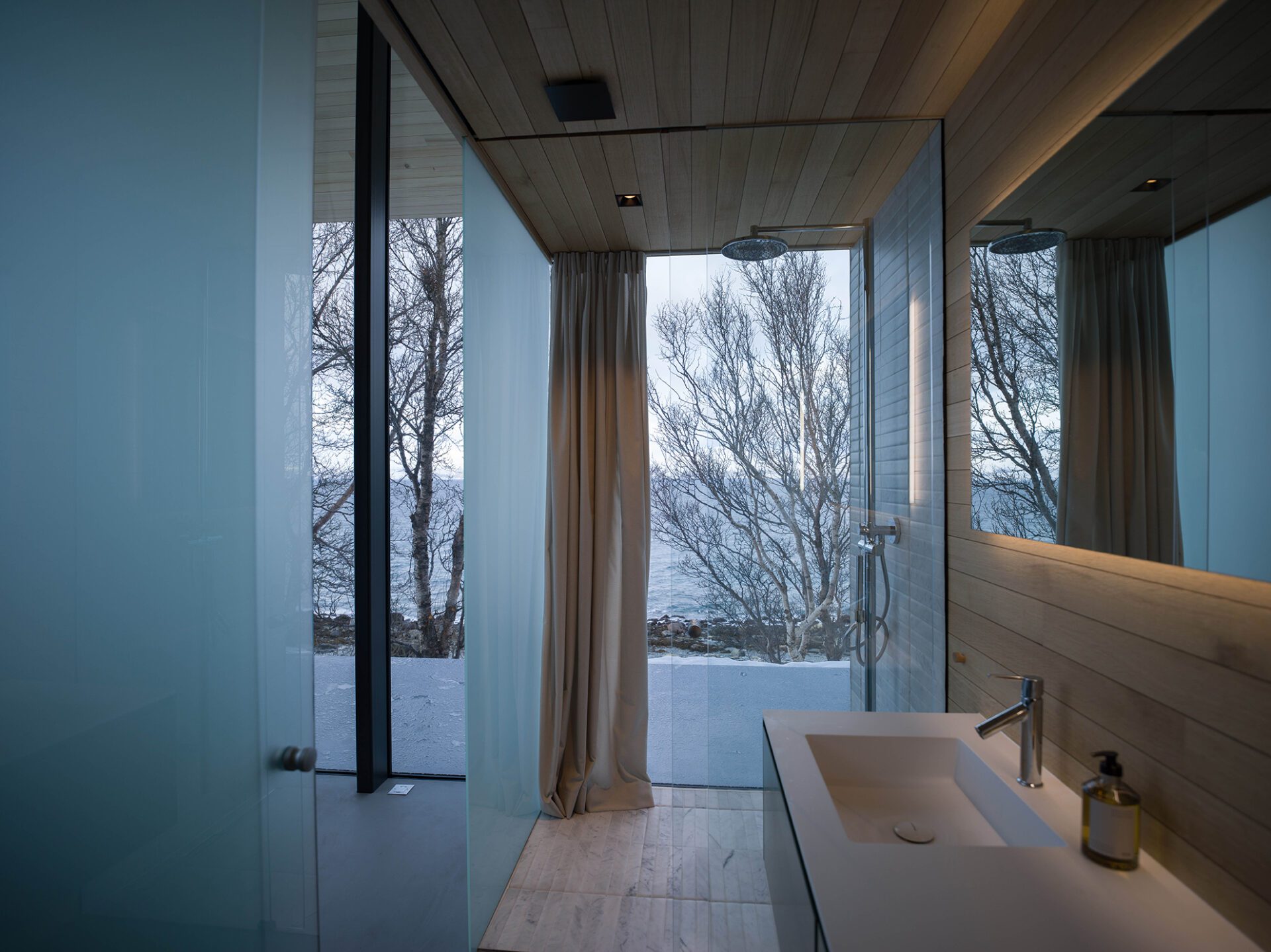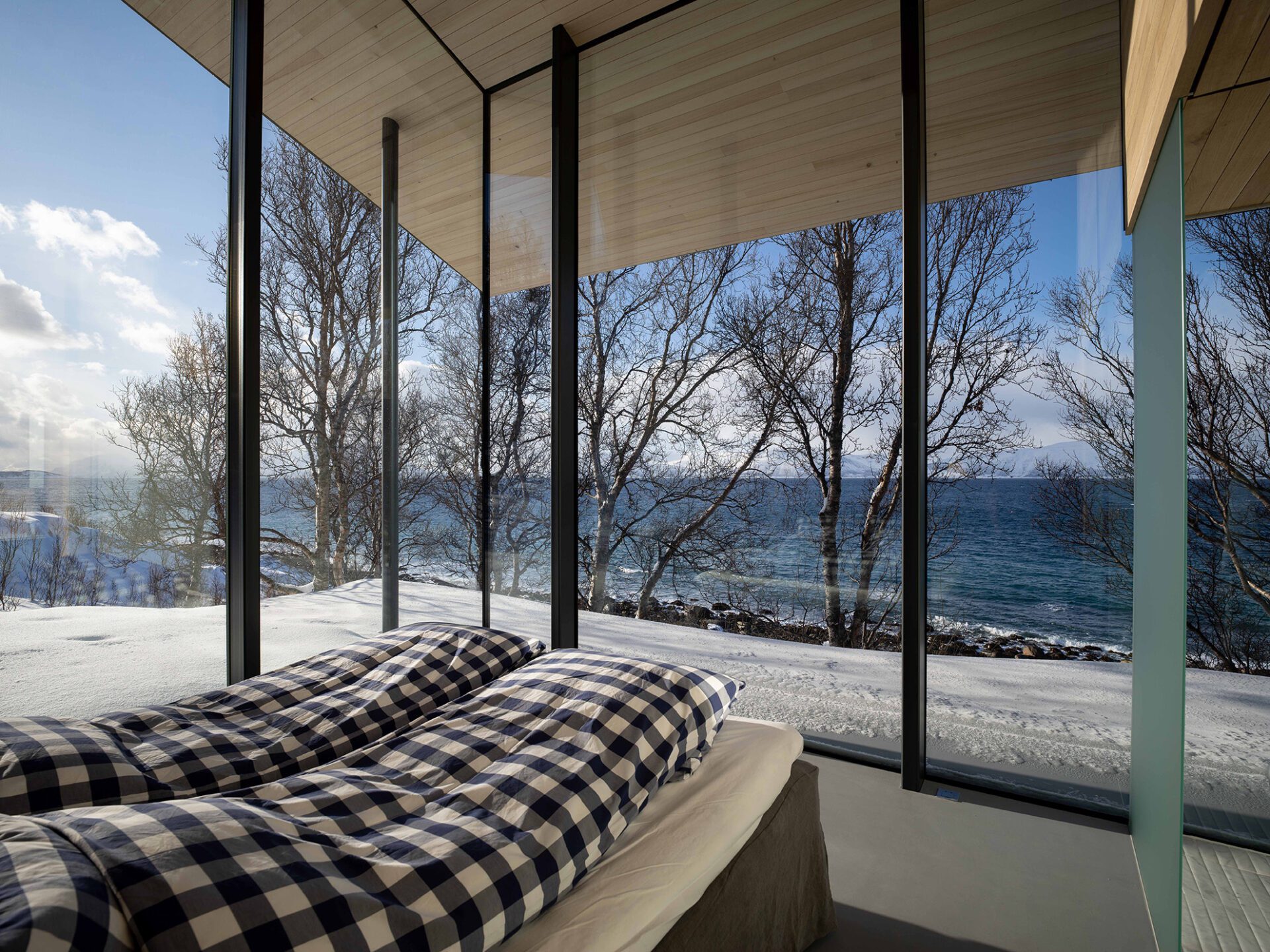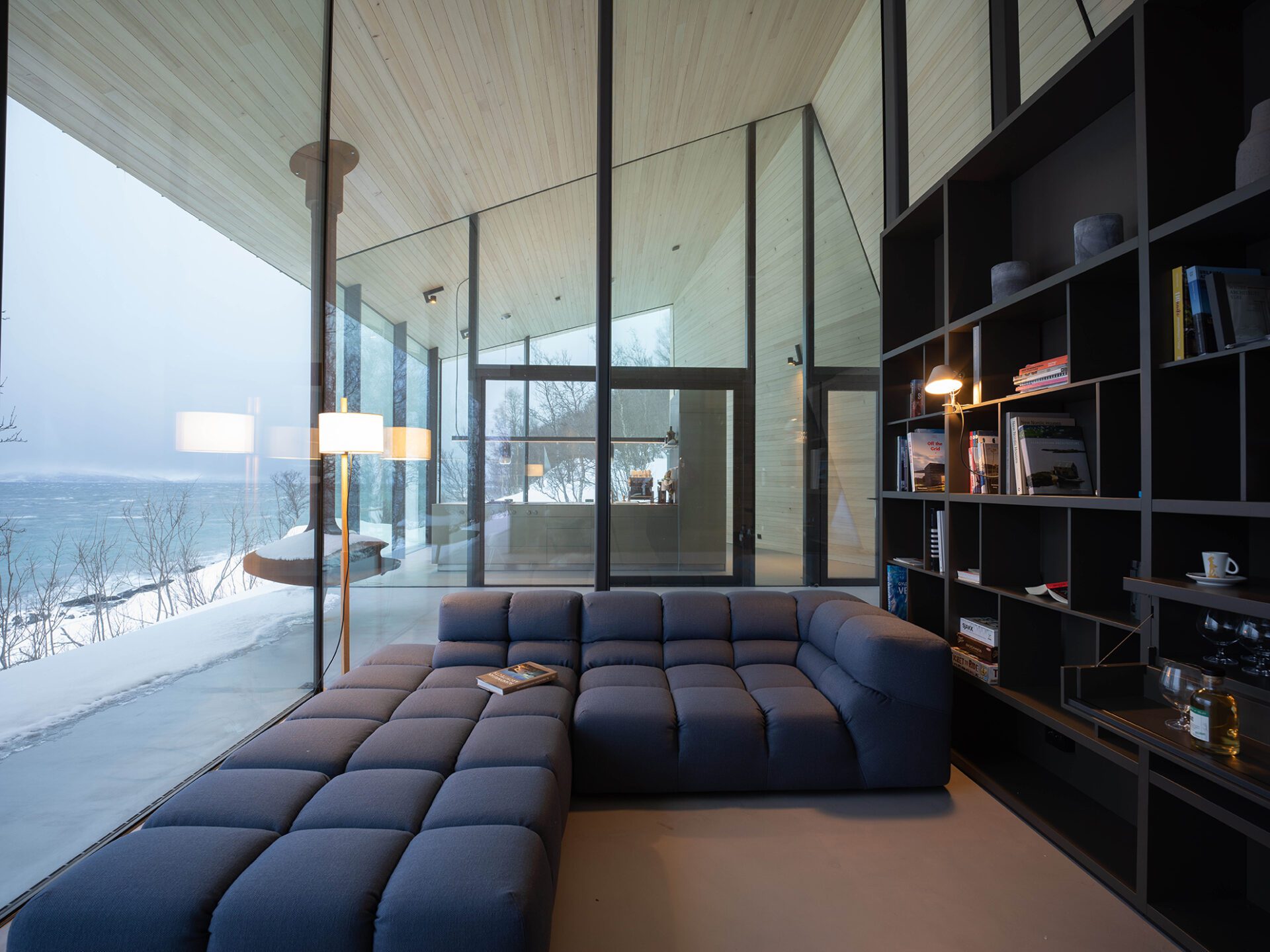 Located in the remote Lyngen Alps this private chalet is organized within a main structure comprising two units and terraces, a separate suite and a sauna across the creek. With respect for nature being the key inspirations for this project, the design endeavors to complement the site, with the main building stretching out across the natural plateau. High ceilings and seamless glass walls invite the sky and landscape into the building. The concrete floor and terraces are an extension of the natural terrain. A simplistic A-frame design echoes a fundamental shelter; however here tilted back from the seaside to an angle where the roof is aligned with the surrounding terrain, to provide privacy on one side and panoramic views on the other. The main unit houses five bedrooms with private, en-suite bathrooms and a living room. The northernmost unit houses the kitchen and dining room, designed like a ‘winter garden’ observatory to provide fantastic views across the sea to the horizon.