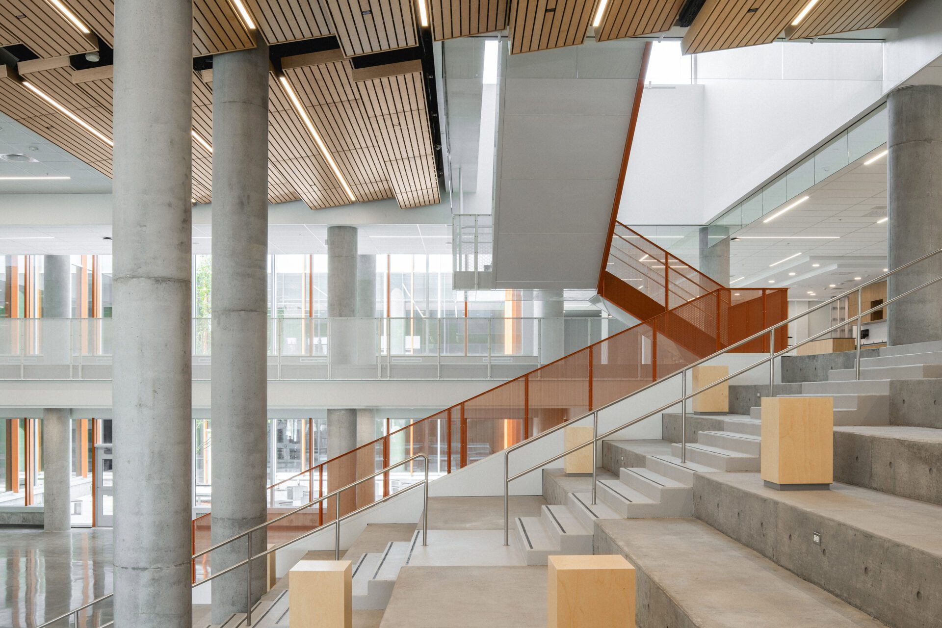 The Aux Mille-Voix high school embodies a forward-thinking vision of education—evolving, sustainable, and inclusive. As part of Quebec’s initiative to renew education infrastructure, the project goes beyond the traditional concept of a school to transform it into a true public building: a place where people meet and interact, bringing life to its neighbourhood.