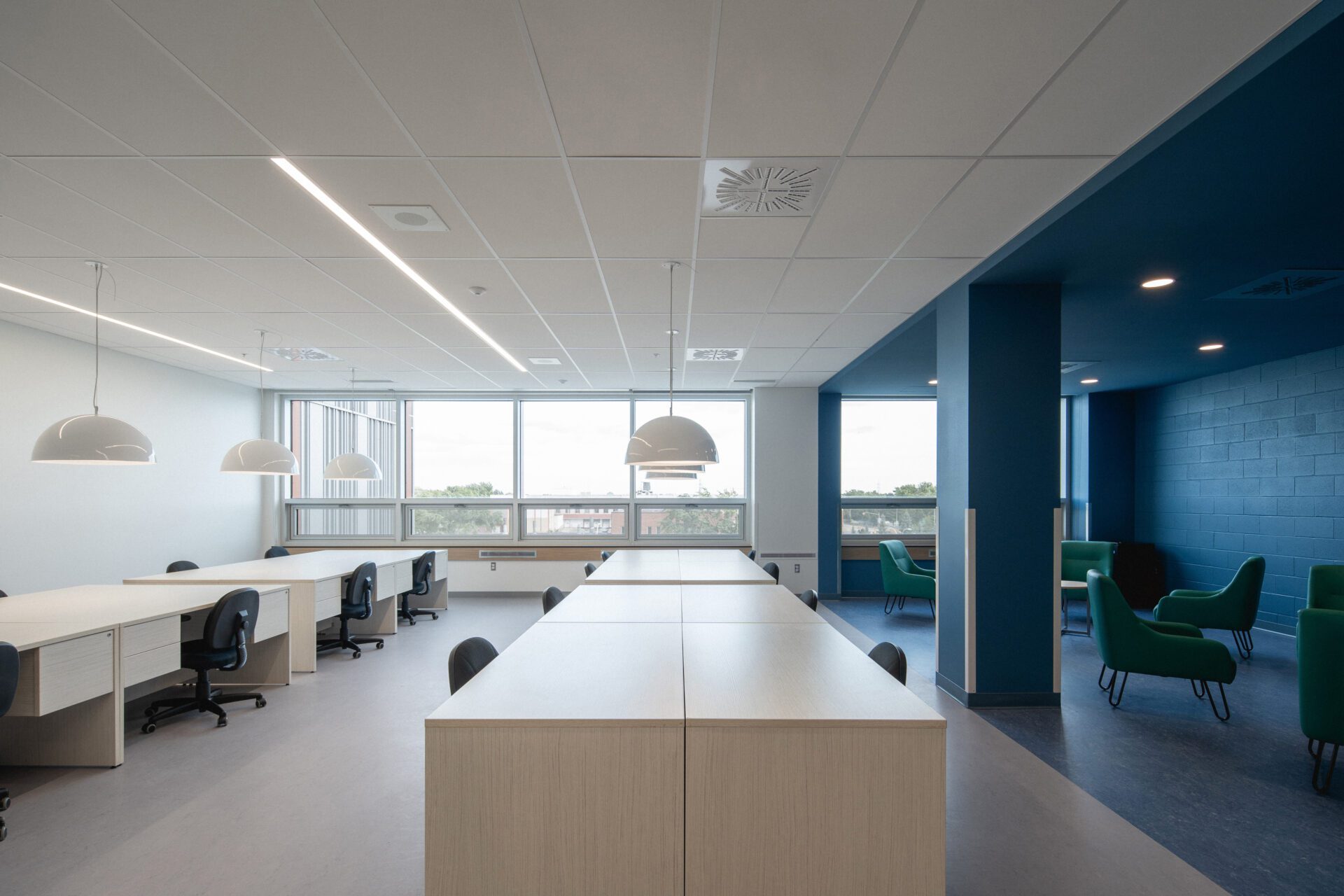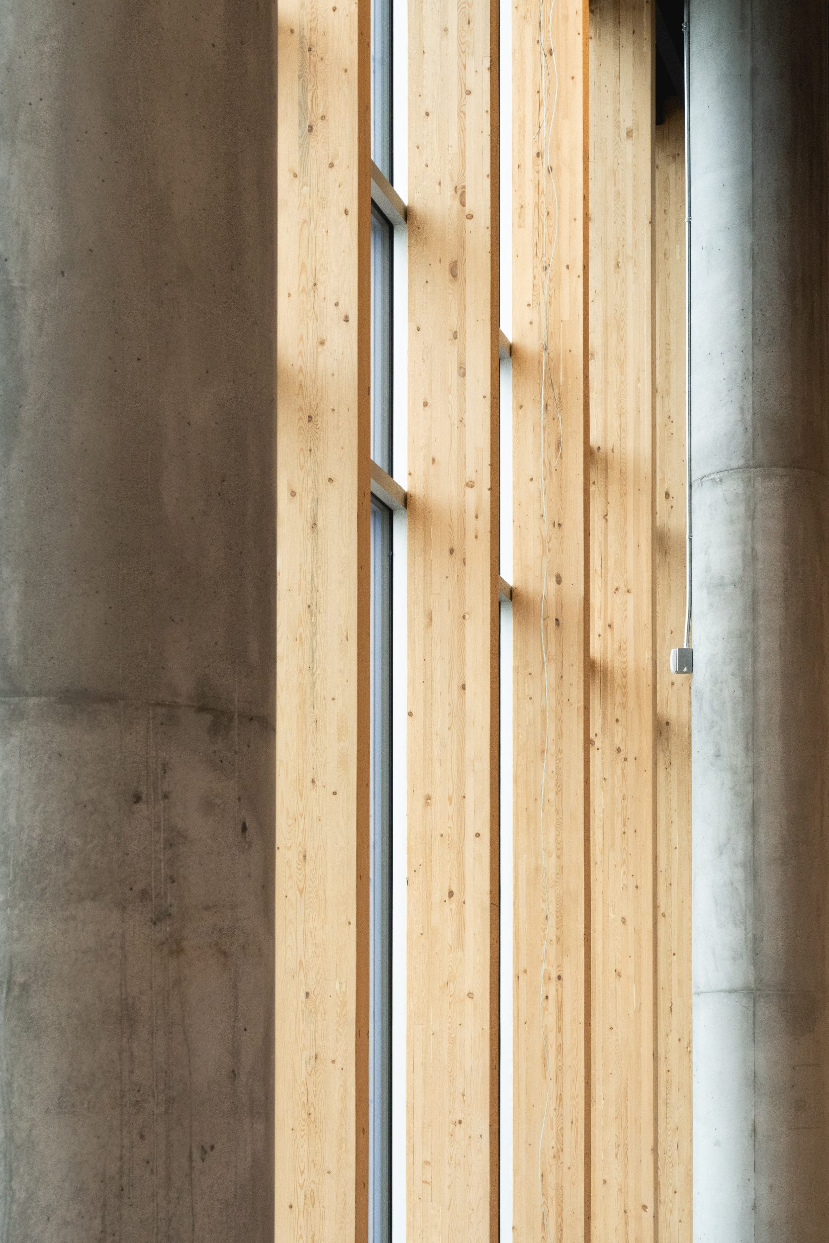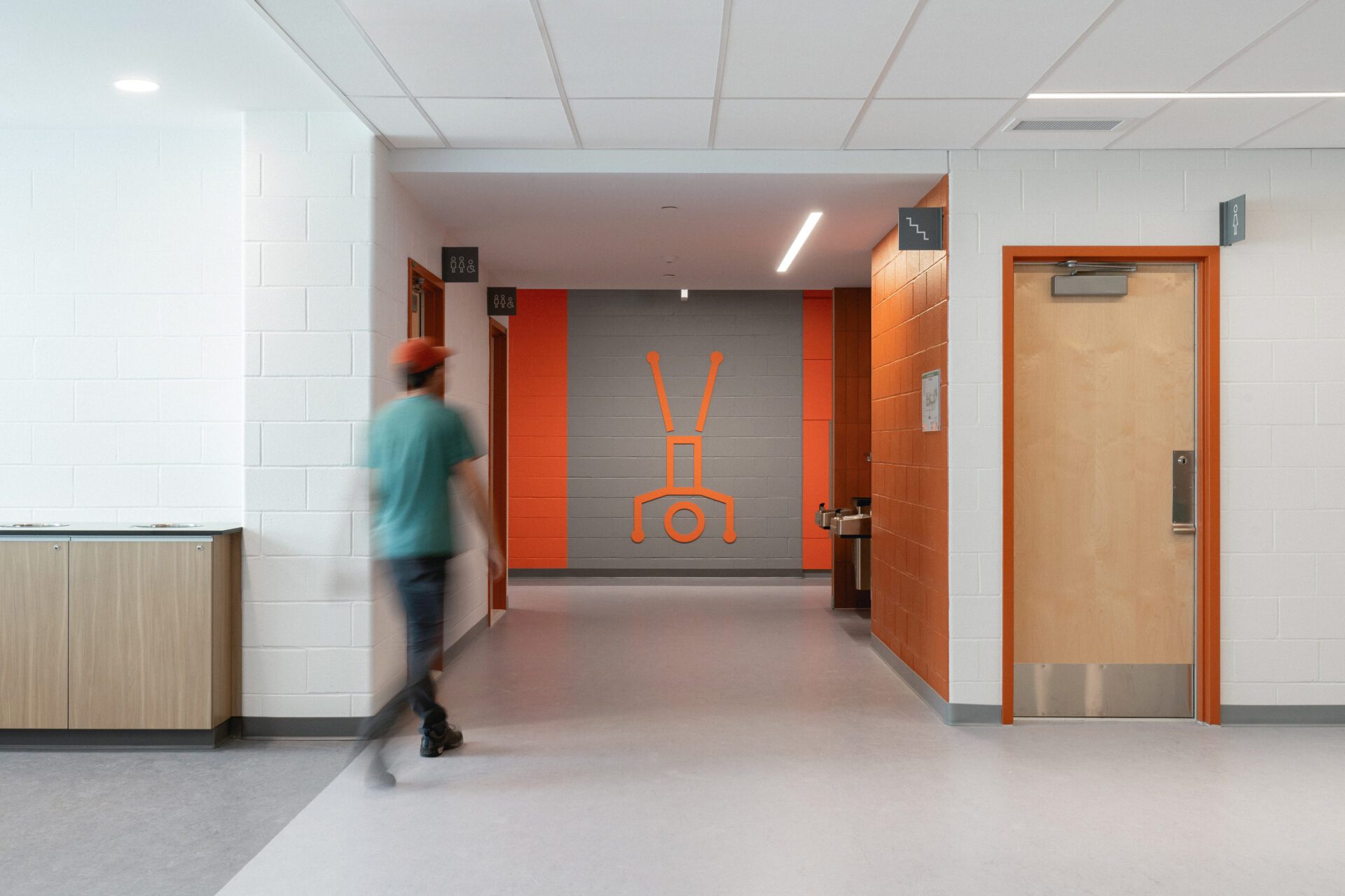 A sustainable and biophilic approach is embedded throughout the project, with the goal of achieving LEED v4 BD+C Silver certification (Schools). The building features wood and natural stone, while the interior finishes prioritize locally sourced materials with low VOC content, significantly enhancing indoor air quality. The integration of indigenous planting and maximization of natural daylight create a strong connection between users and the natural environment.