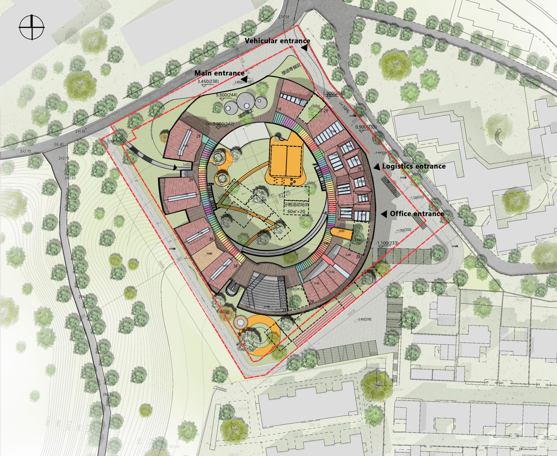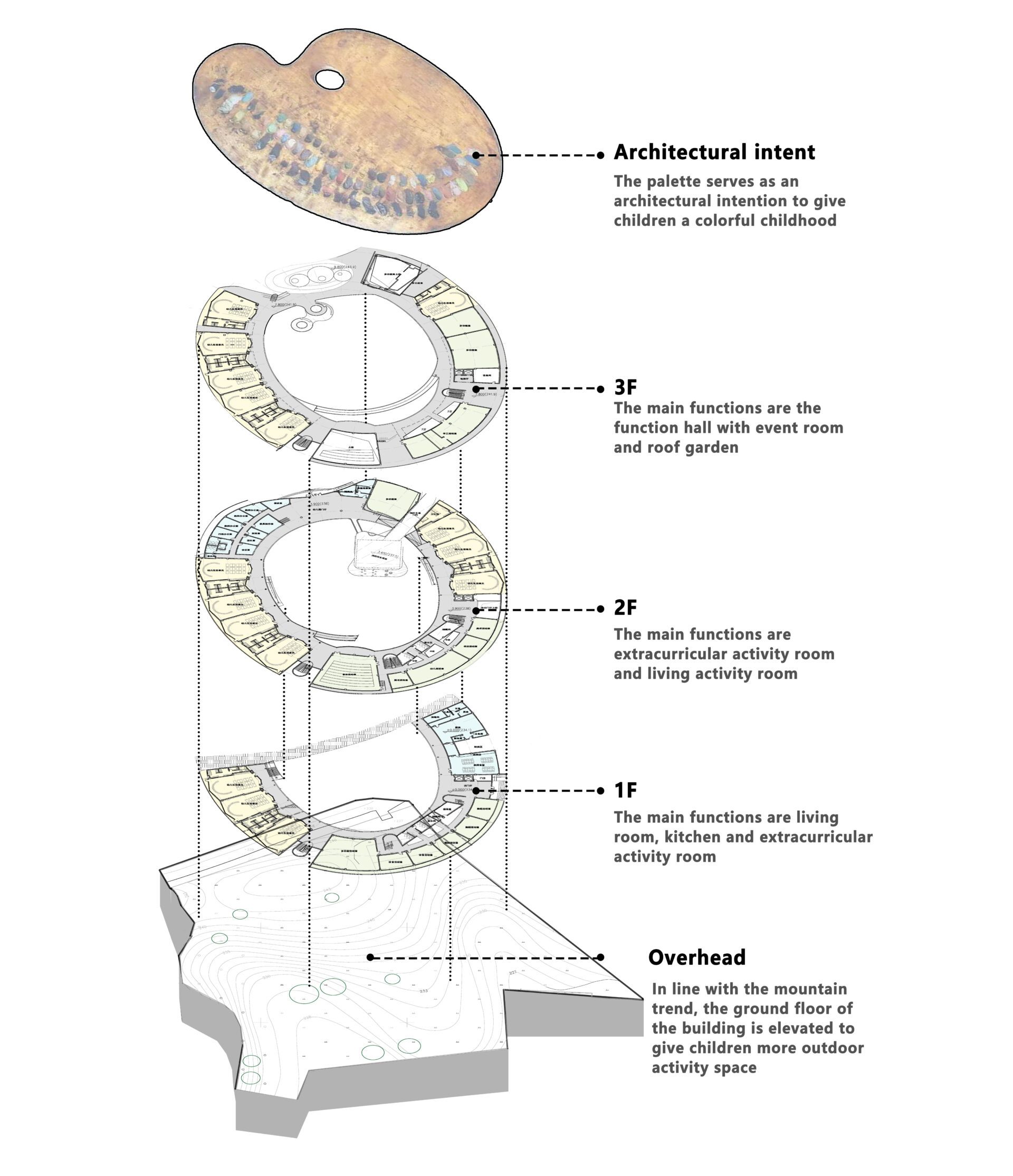 The overall architectural design is inspired by a drawing palette, and spaces are organized around a three-level oval-shaped yard in the middle. Functional rooms built with distinct forms are configured on the three floors, which also incorporate local characteristic architectural form and materials. The inner yard keeps the existing plants and the slope, which connect with each building level directly and enable kids to commune with nature. On south side, a stilt floor is created naturally, which links the inner yard with the external environment and enhances the wind environment of the construction as well.