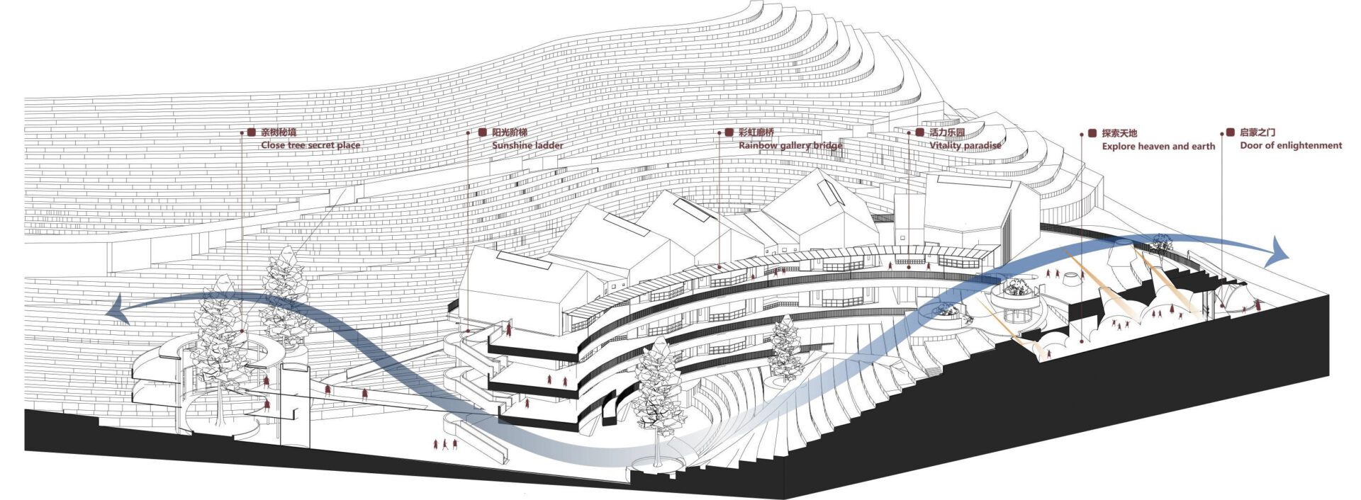 The entrance hall is set under the hillock. Its interior design draws on the form of mountains and also incorporates skylights, which echoes the cave in the local Danxia Mountain, providing kids with an interesting space for exploration.