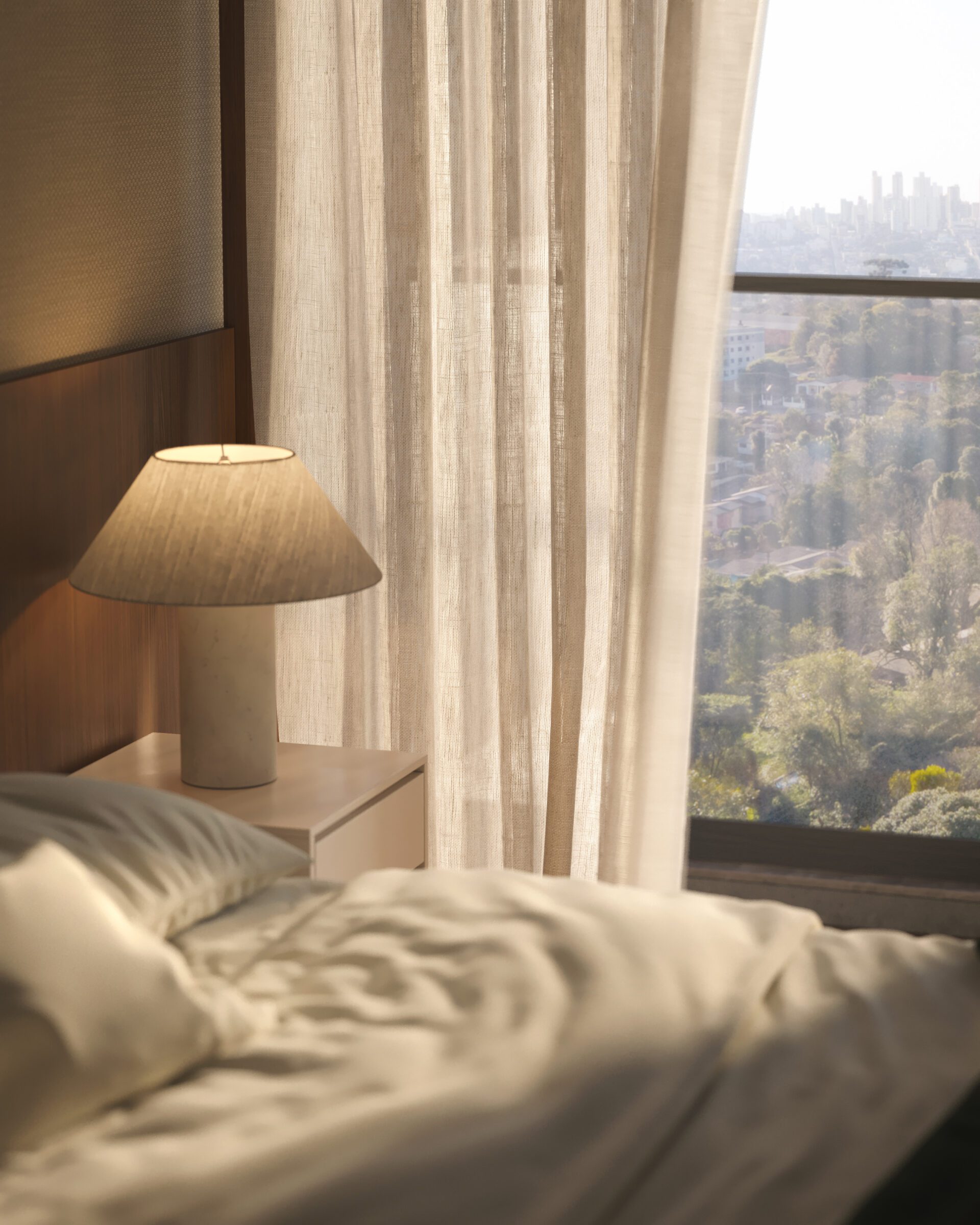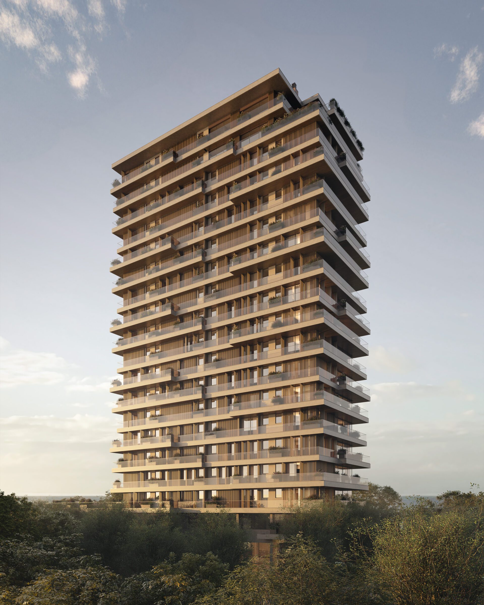 The façade strategy relies on the extensive use of balconies around the perimeter of the building. These elements, alternating between floors, generate a horizontal rhythm that brings movement to the architectural mass. Wooden-toned brise-soleils provide privacy and thermal comfort to the intimate areas of the units, while also establishing a chromatic dialogue with the natural surroundings. Vegetation placed in balcony planters completes the façade composition, strengthening the conversation between built and natural environments. Furthermore, this architectural gesture blurs the boundary between interior space and the forest landscape, allowing residents to feel part of the ecosystem.