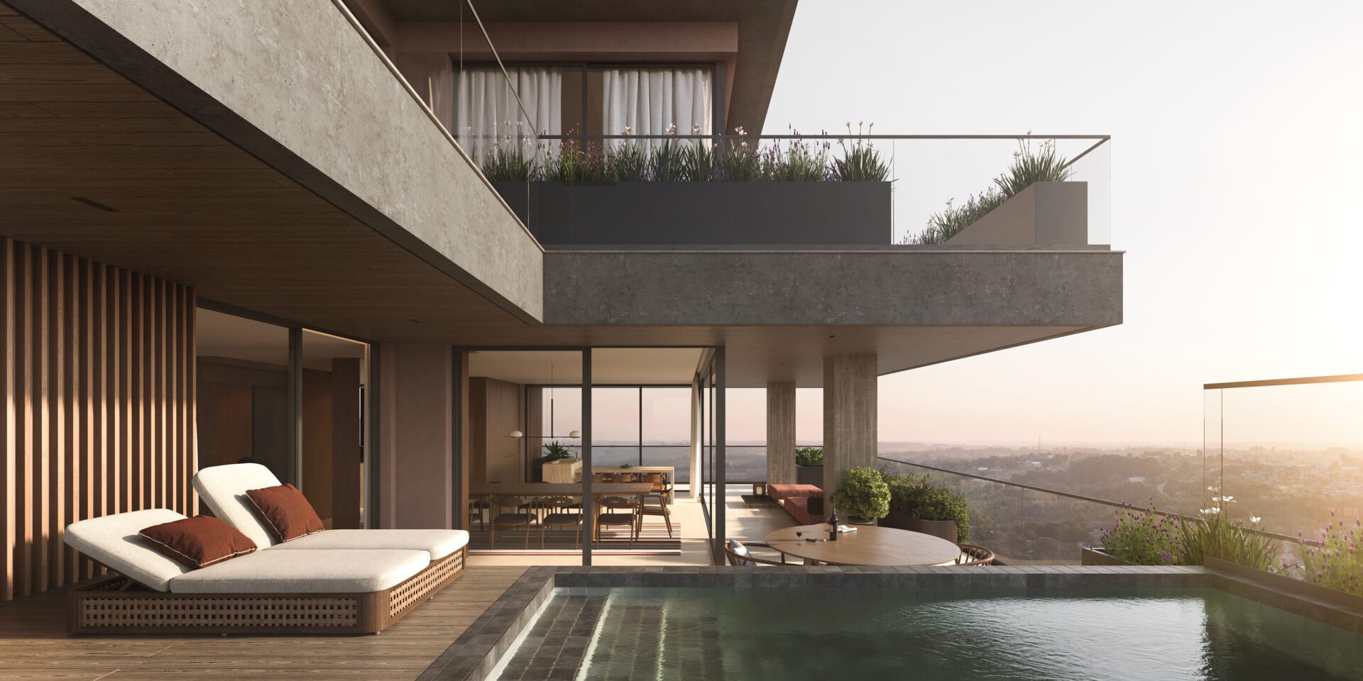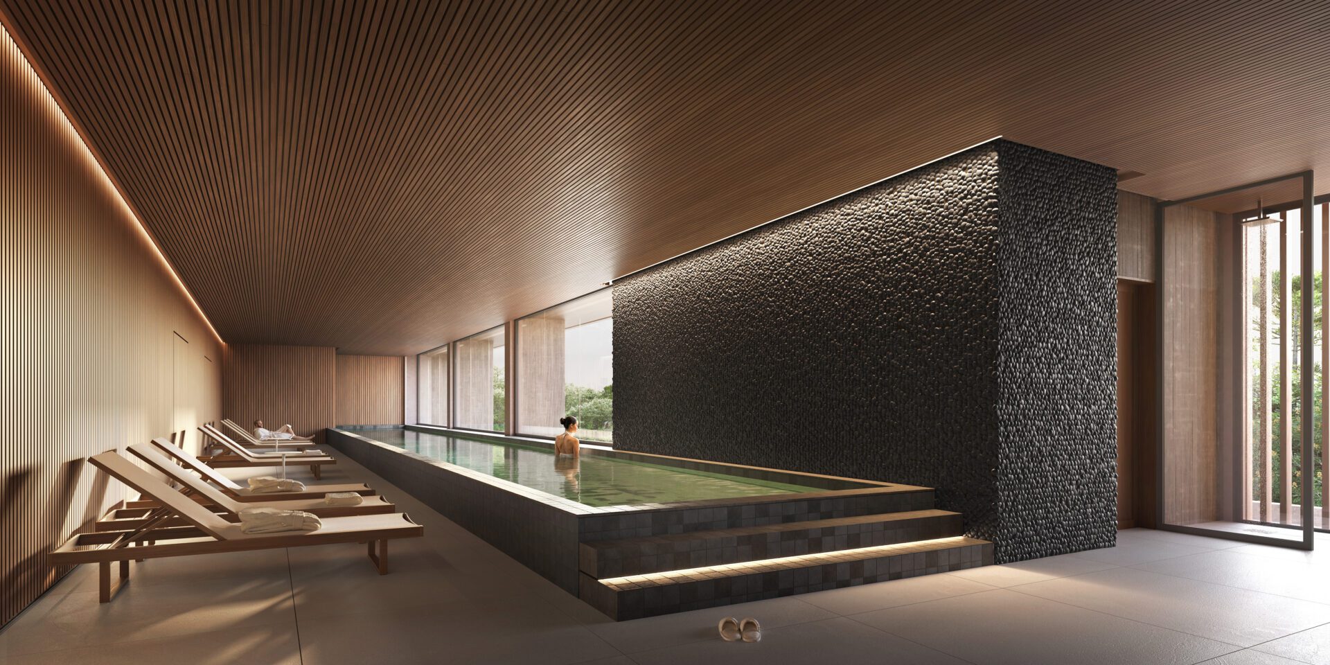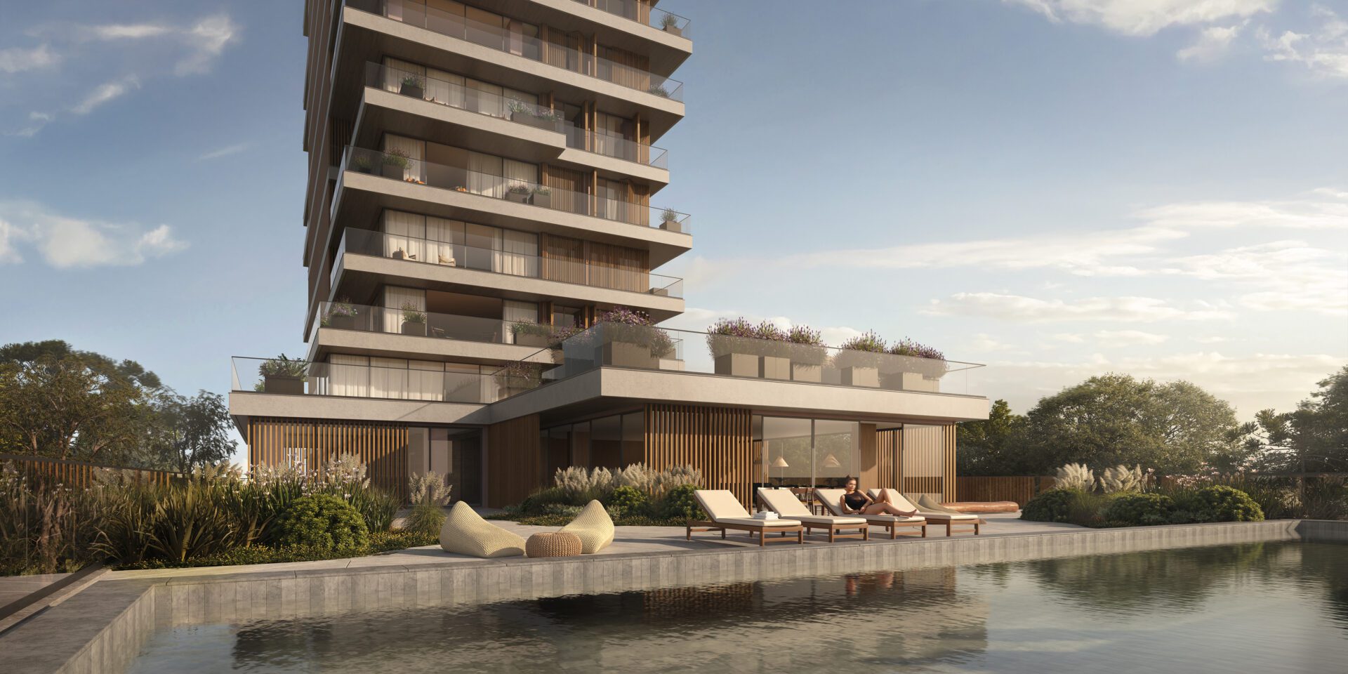 On the ground floor, common areas are carefully positioned to preserve existing plant species and engage in harmonious dialogue with the vegetation. Access to the building is through an internal courtyard that functions as a transitional space, an arrival sequence that softens the passage from city to home. An open-air pool invites residents to immerse themselves in nature. The project was conceived to foster a seamless integration between built form and natural landscape. It is tailored for a living terrain.