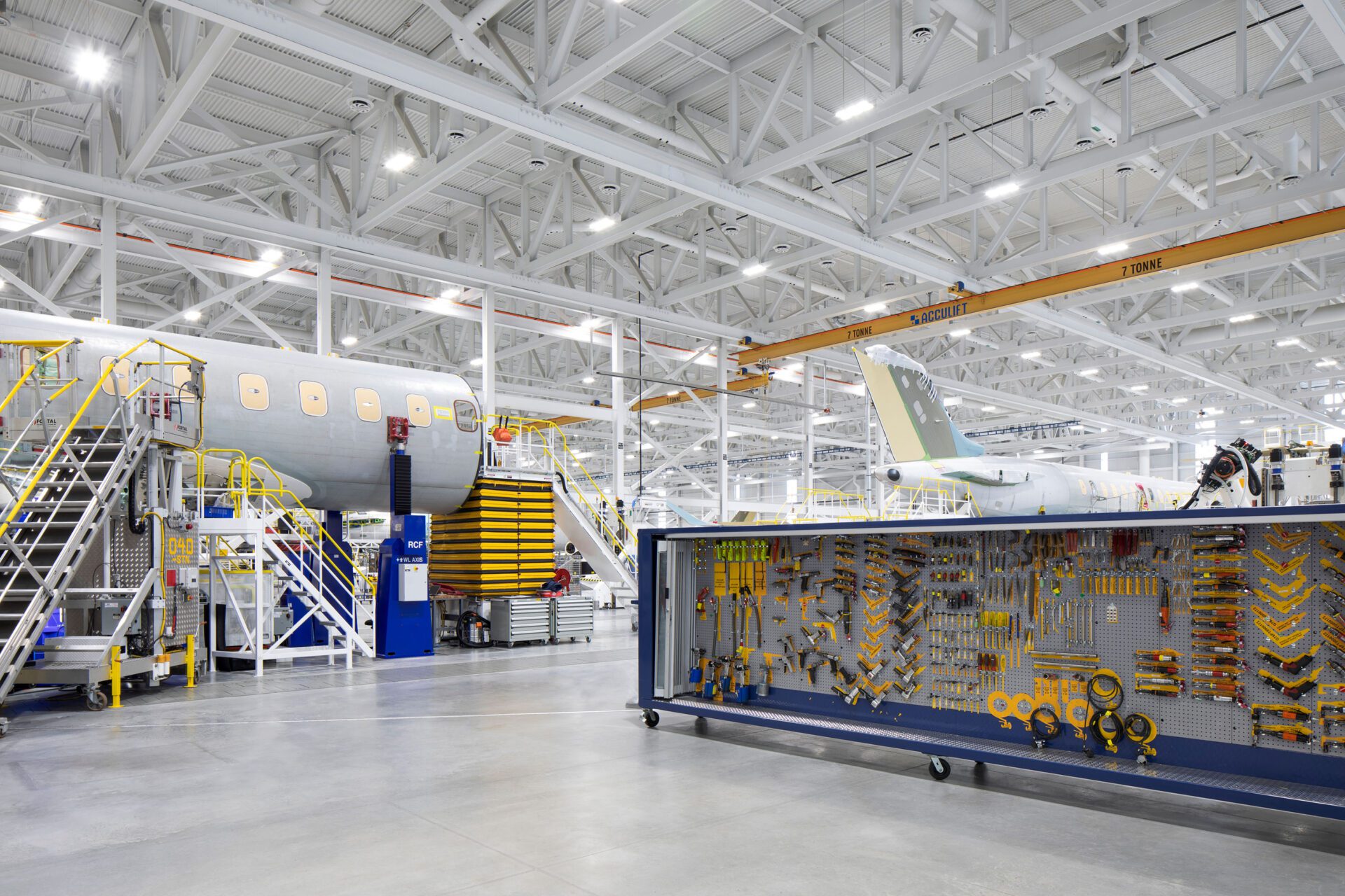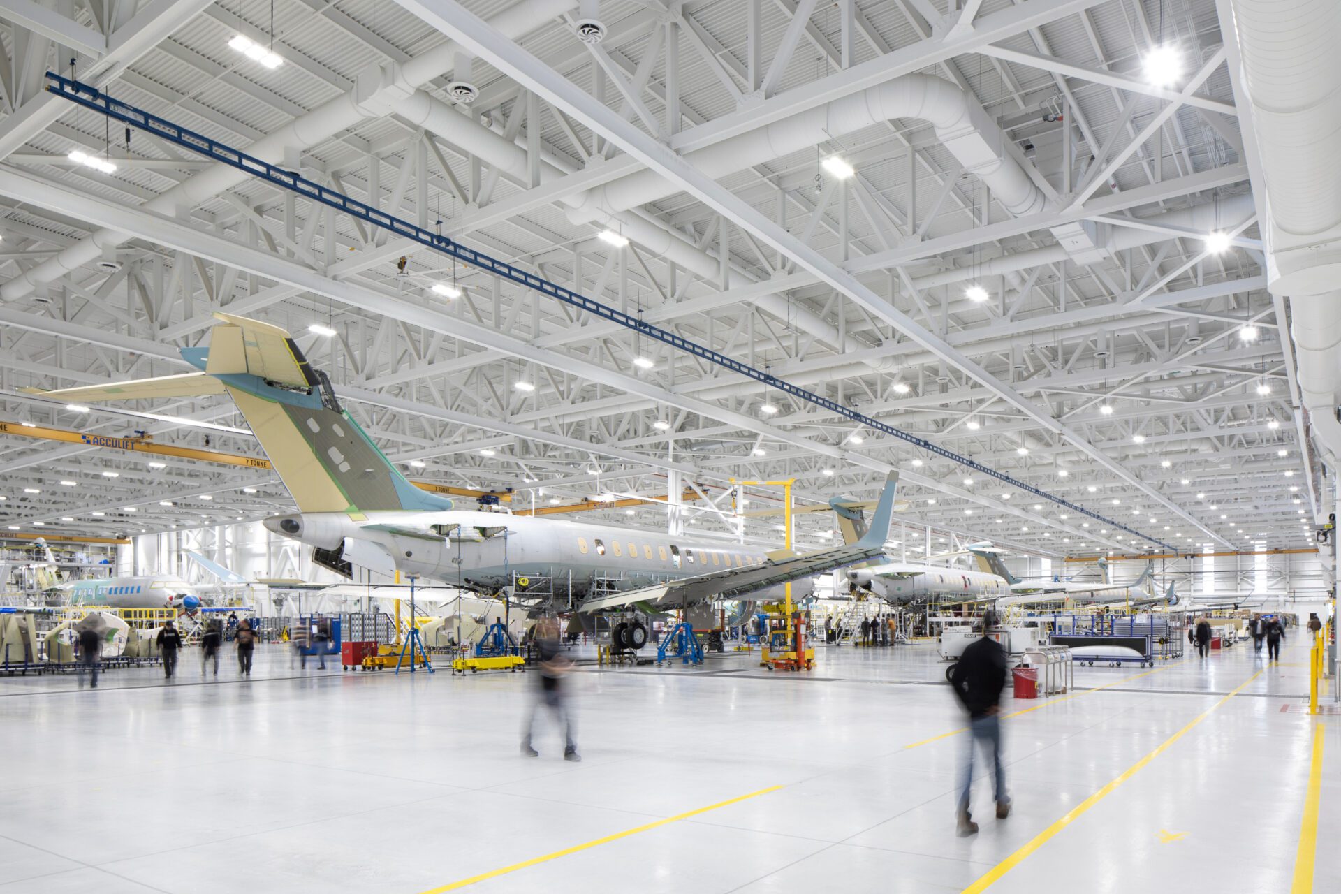 At the heart of the campus, the 60,000 m² facility is the largest standalone structure built at Pearson in over two decades. A 75-metre clear span creates an uninterrupted production floor that accommodates 16 work centres, enabling the simultaneous assembly of over a dozen aircraft by 2,000 employees. Complementing the manufacturing space are a 10,600 m² flight test hangar, engineering offices, simulation suites, and training labs.