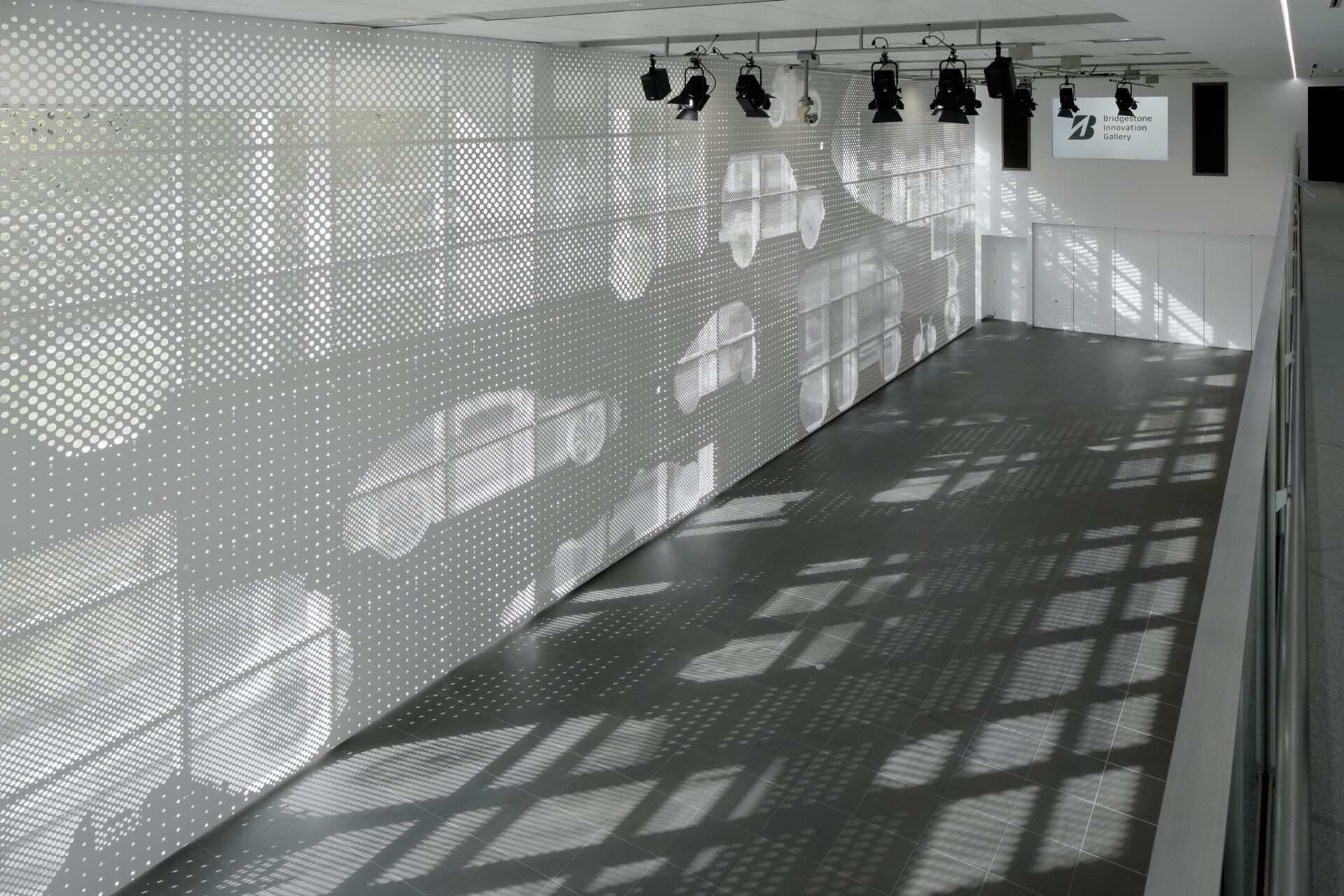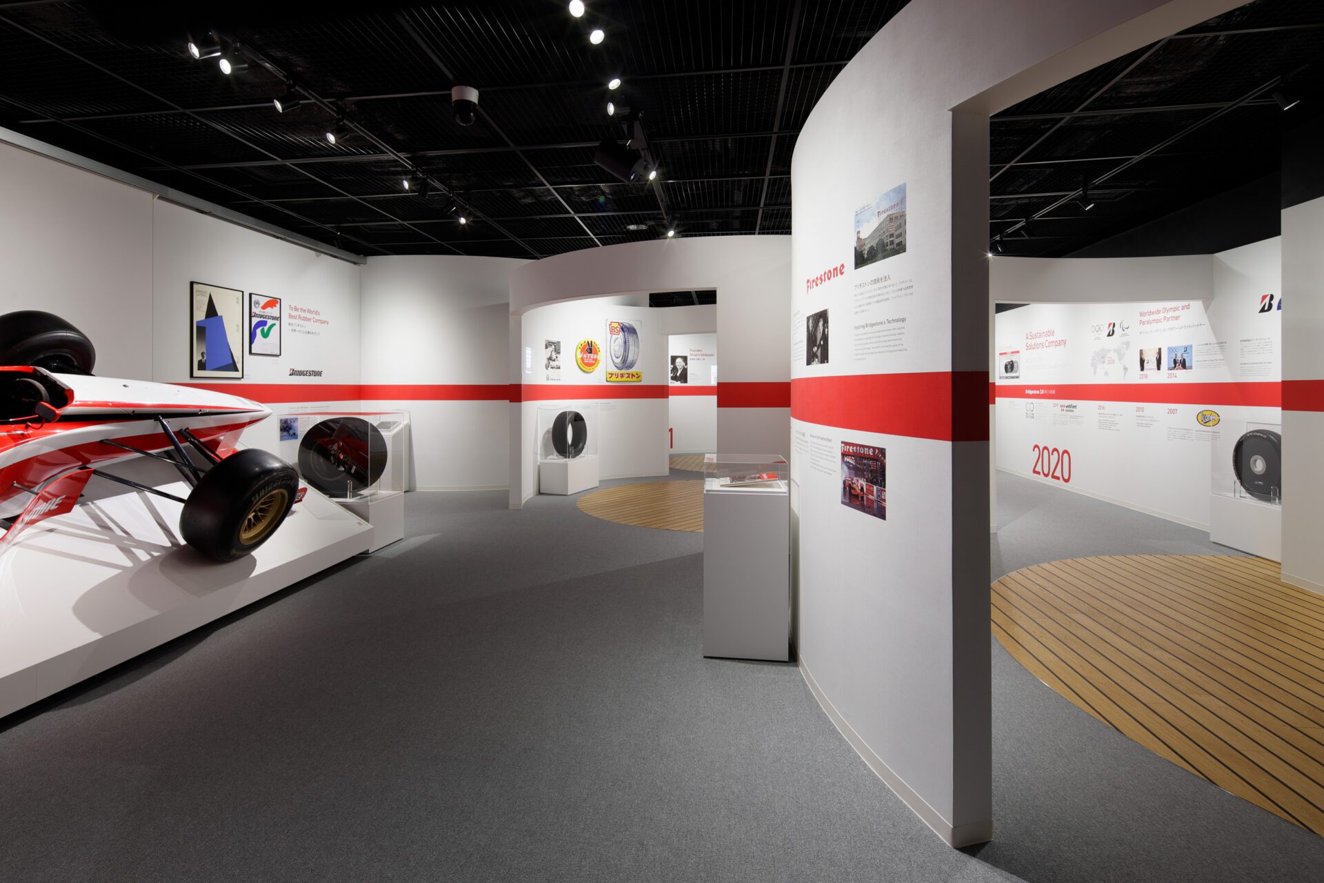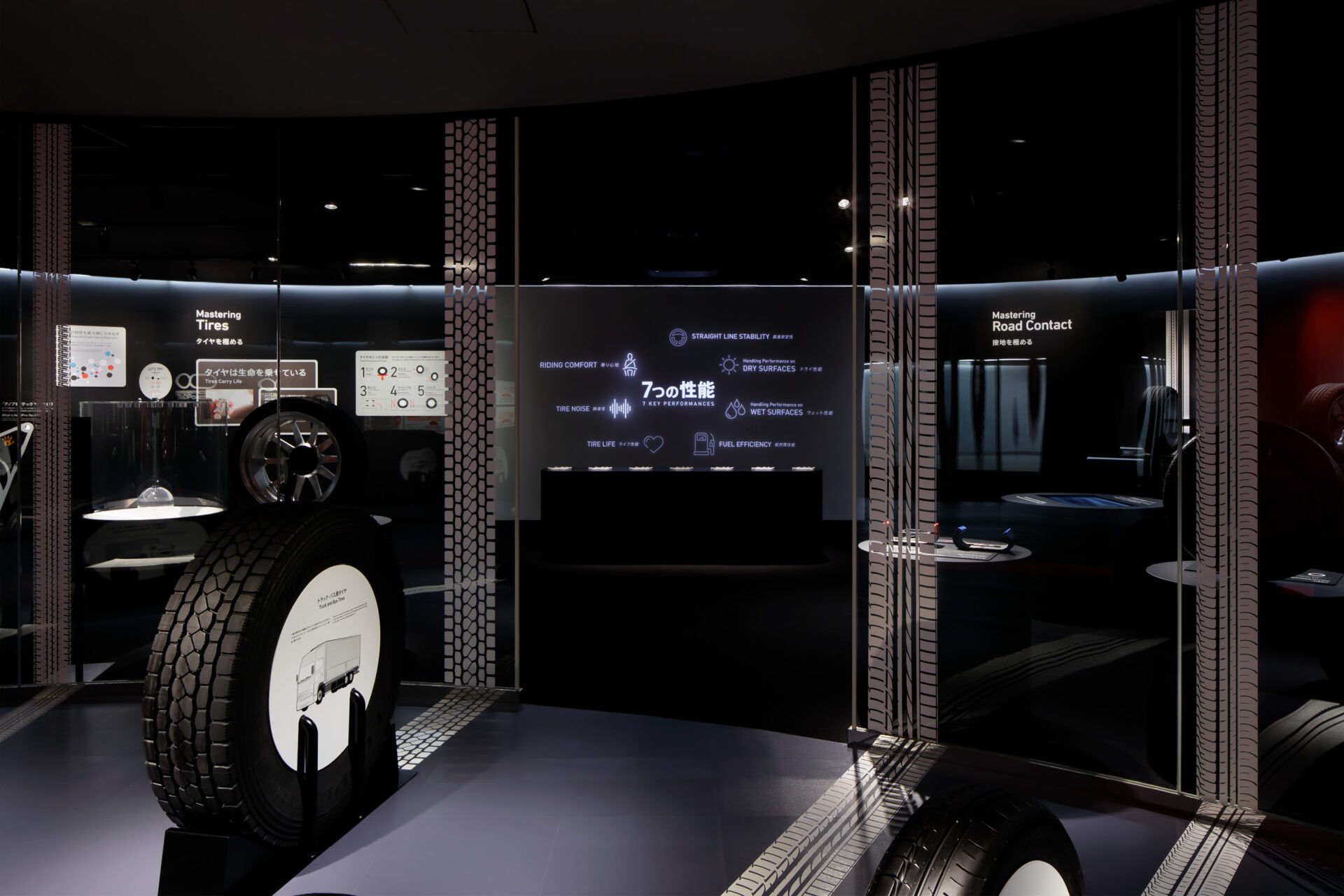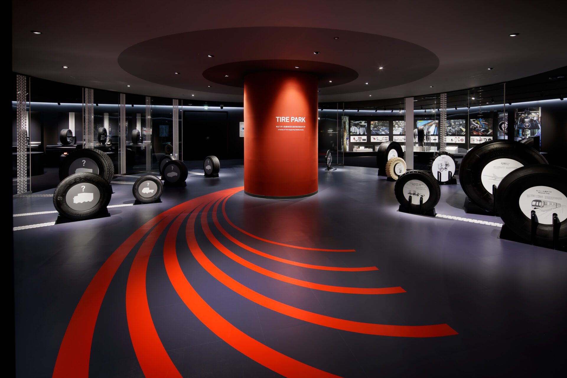 Bridgestone Innovation Gallery was designed to be a place that seamlessly connects people and things, the past and the future, the real and the digital, under the theme of ROUNDABOUT, an intersection without traffic lights. Visitors can learn about Bridgestone's history, its fascinating products, the mobility society, and the latest technology through experiences in four zones, each with its own unique characteristics. In the "WHO WE ARE" zone, a single red line runs through the space, connecting history and the future; in the "WHAT WE OFFER" zone, a tire park with a variety of vehicle tires is the center of the exhibit, evoking the future of mobility; and in the "HOW WE CREATE" zone, a permeable membrane divides the space, expressing solutions for seeing the future. In the "HOW WE CREATE" zone, the space is partitioned with permeable membranes, expressing solutions that see into the future. In the "WHERE WE GO" zone, visitors can experience Bridgestone's innovation through images that wrap around the body. Visitors can learn about Bridgestone's history, fascinating products, mobility society, and the latest technology through the experiences of four zones, each with its own unique characteristics. In the "WHO WE ARE" zone, visitors can learn about Bridgestone's history by following the red line that runs through the space. In the "WHAT WE OFFER" zone, visitors can learn about Bridgestone's past products and future solutions, mainly in the "Tire Park" where a variety of vehicle tires are displayed. In the "HOW WE CREATE" zone, a permeable membrane divides the space, creating a laboratory-like atmosphere to promote new products. In the "WHERE WE GO" zone, visitors can experience Bridgestone's innovation through images that wrap around the body. The dynamic dot art at the entrance is designed to represent Bridgestone's CSR system of "Mobility," "People," and "Environment" in a single piece of art, with layers of visitors, full-size cars and airplanes, and trees in the background. Eleven different types of vehicles are laid out in full scale, allowing visitors to experience the size of an actual tire. The dot art is 35 meters in length and 7 meters in height. About 30,000 dots of various sizes are placed by hand, and the logo is hidden in several places for children to find treasure. We imagine that children will feel close to Bridgestone and talk about their experiences with a sparkle to their fathers and mothers.