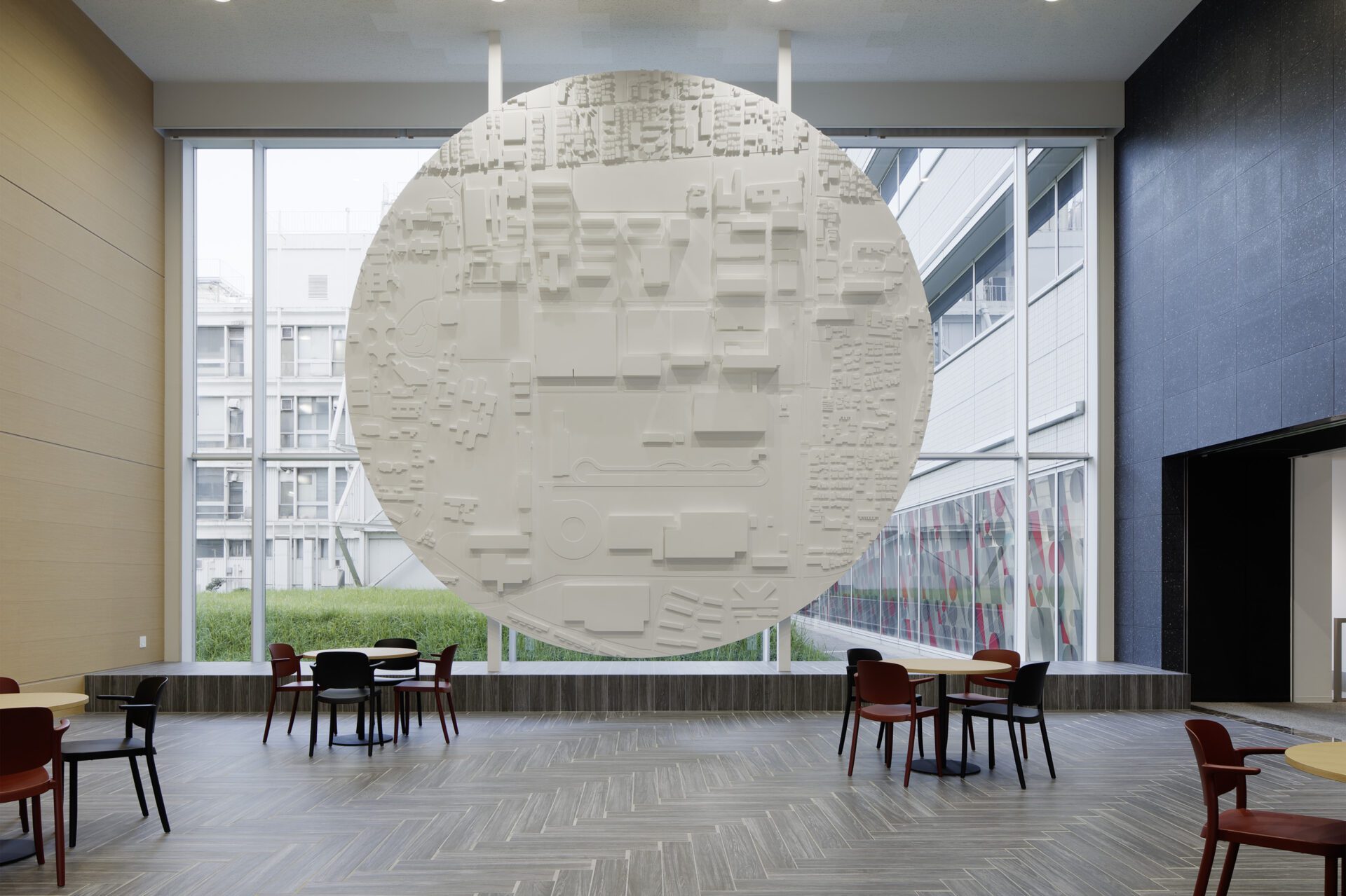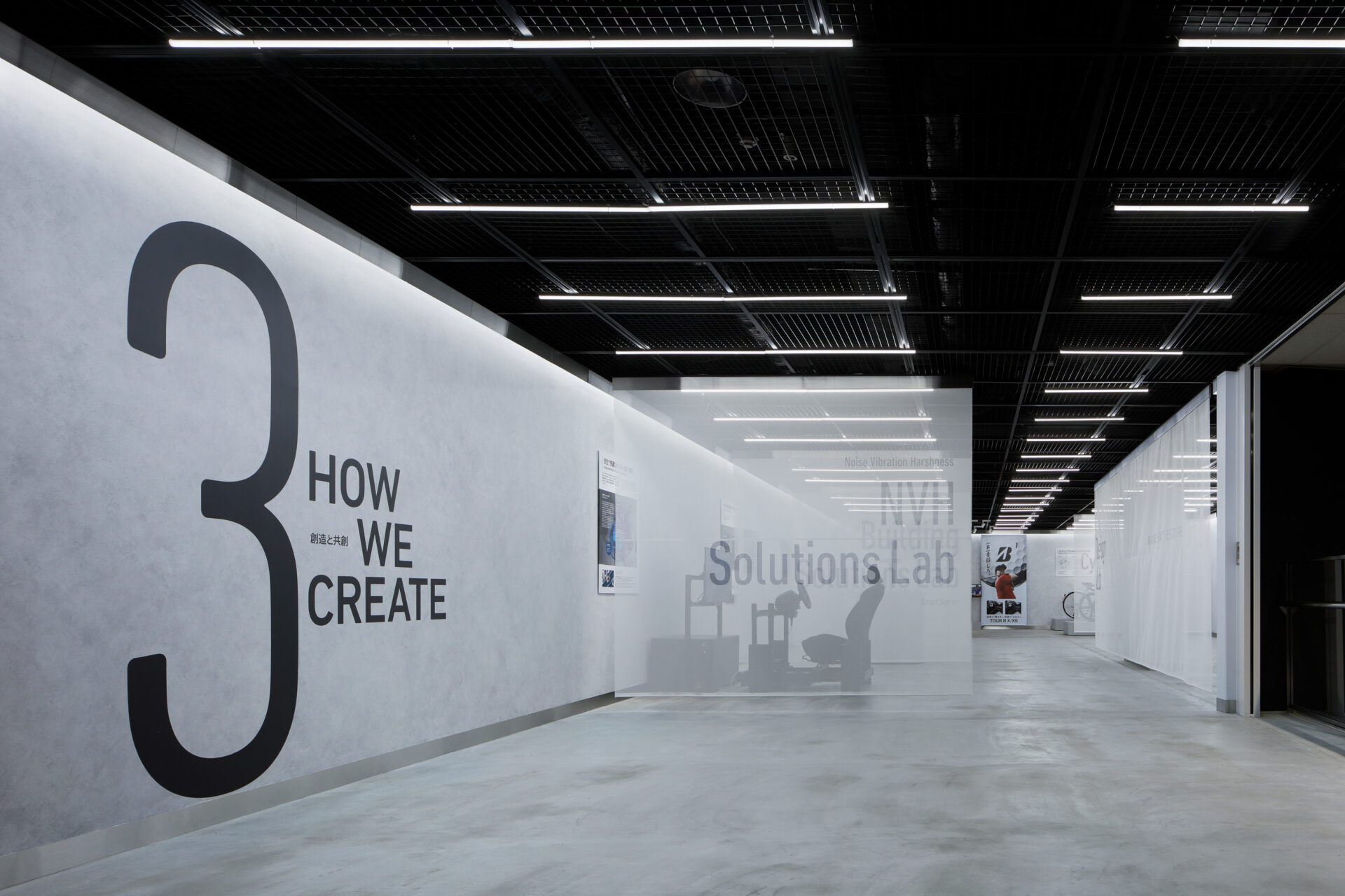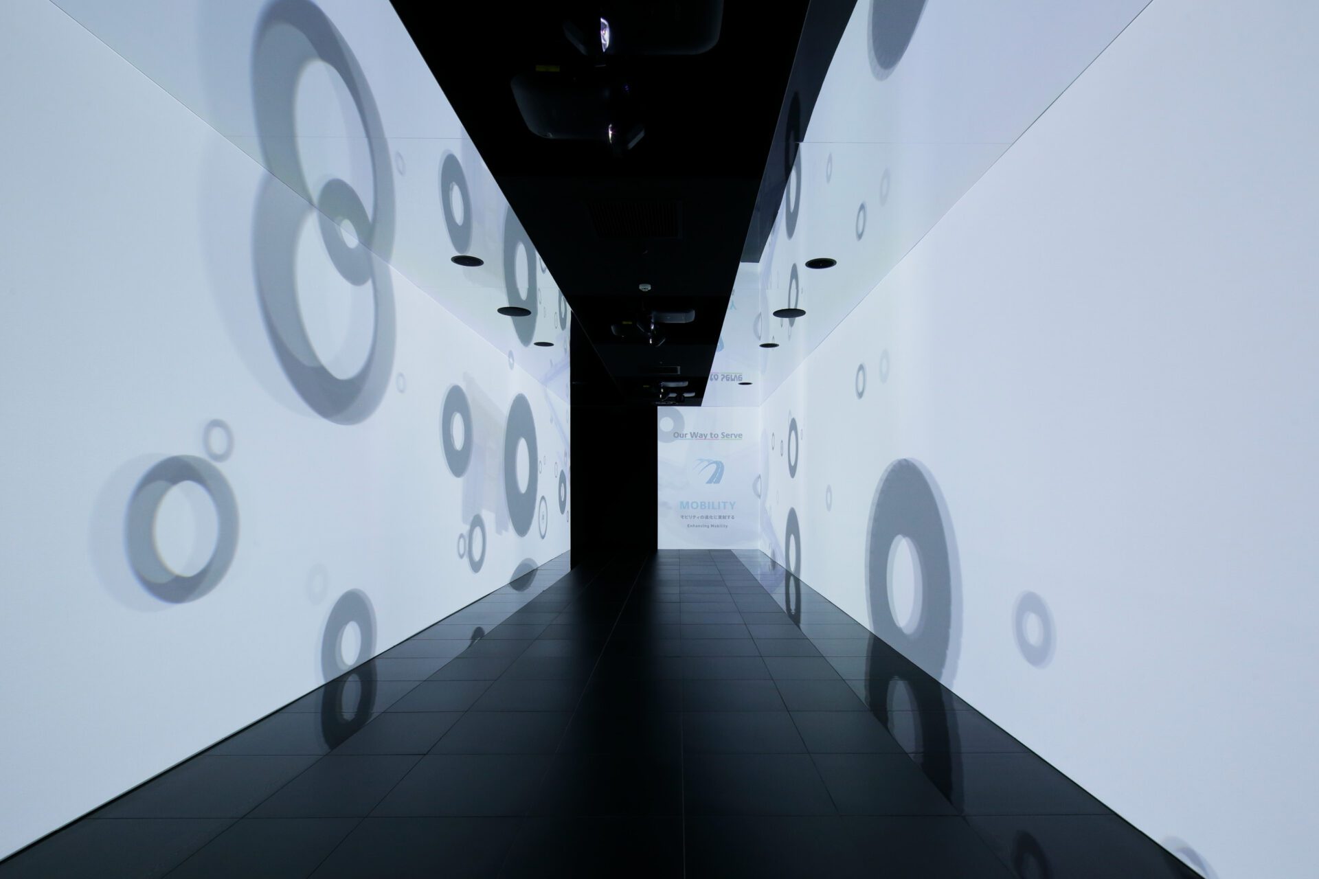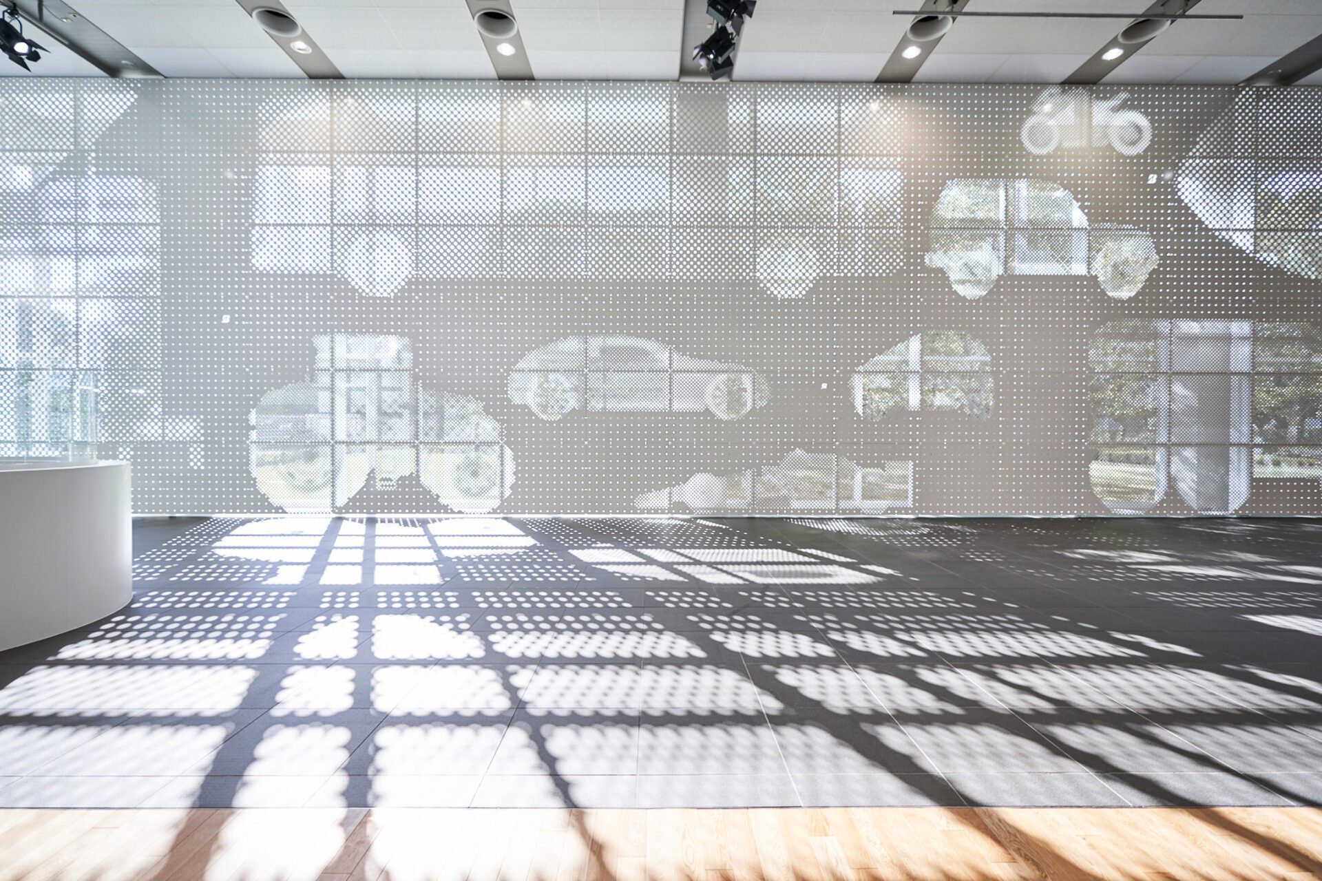 Bridgestone Innovation Gallery was designed to be a place that seamlessly connects people and things, the past and the future, the real and the digital, under the theme of ROUNDABOUT, an intersection without traffic lights. Visitors can learn about Bridgestone's history, its fascinating products, the mobility society, and the latest technology through experiences in four zones, each with its own unique characteristics. In the "WHO WE ARE" zone, a single red line runs through the space, connecting history and the future; in the "WHAT WE OFFER" zone, a tire park with a variety of vehicle tires is the center of the exhibit, evoking the future of mobility; and in the "HOW WE CREATE" zone, a permeable membrane divides the space, expressing solutions for seeing the future. In the "HOW WE CREATE" zone, the space is partitioned with permeable membranes, expressing solutions that see into the future. In the "WHERE WE GO" zone, visitors can experience Bridgestone's innovation through images that wrap around the body. Visitors can learn about Bridgestone's history, fascinating products, mobility society, and the latest technology through the experiences of four zones, each with its own unique characteristics. In the "WHO WE ARE" zone, visitors can learn about Bridgestone's history by following the red line that runs through the space. In the "WHAT WE OFFER" zone, visitors can learn about Bridgestone's past products and future solutions, mainly in the "Tire Park" where a variety of vehicle tires are displayed. In the "HOW WE CREATE" zone, a permeable membrane divides the space, creating a laboratory-like atmosphere to promote new products. In the "WHERE WE GO" zone, visitors can experience Bridgestone's innovation through images that wrap around the body. The dynamic dot art at the entrance is designed to represent Bridgestone's CSR system of "Mobility," "People," and "Environment" in a single piece of art, with layers of visitors, full-size cars and airplanes, and trees in the background. Eleven different types of vehicles are laid out in full scale, allowing visitors to experience the size of an actual tire. The dot art is 35 meters in length and 7 meters in height. About 30,000 dots of various sizes are placed by hand, and the logo is hidden in several places for children to find treasure. We imagine that children will feel close to Bridgestone and talk about their experiences with a sparkle to their fathers and mothers.