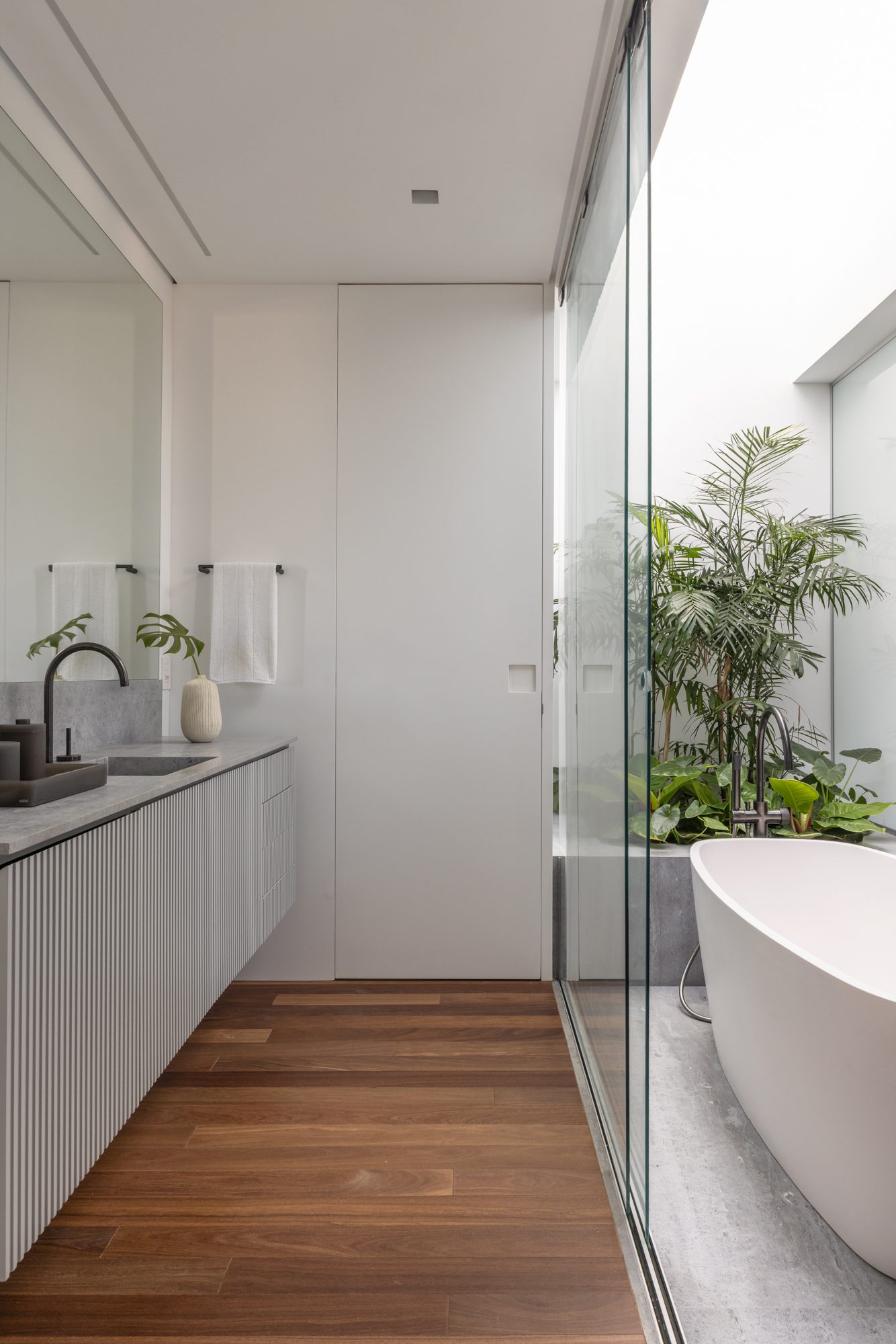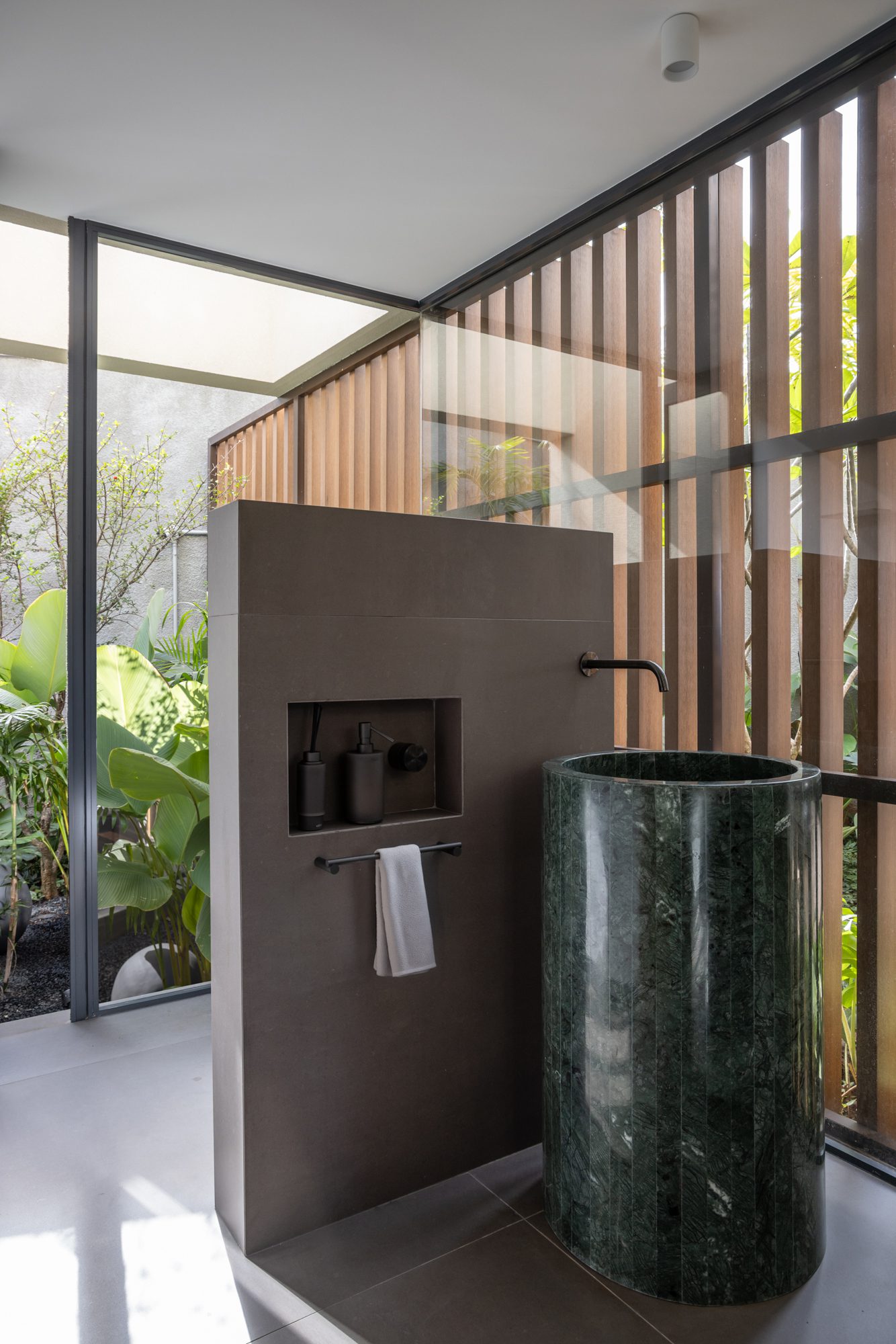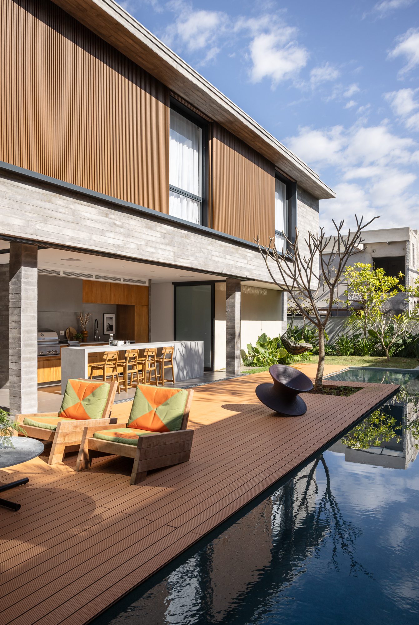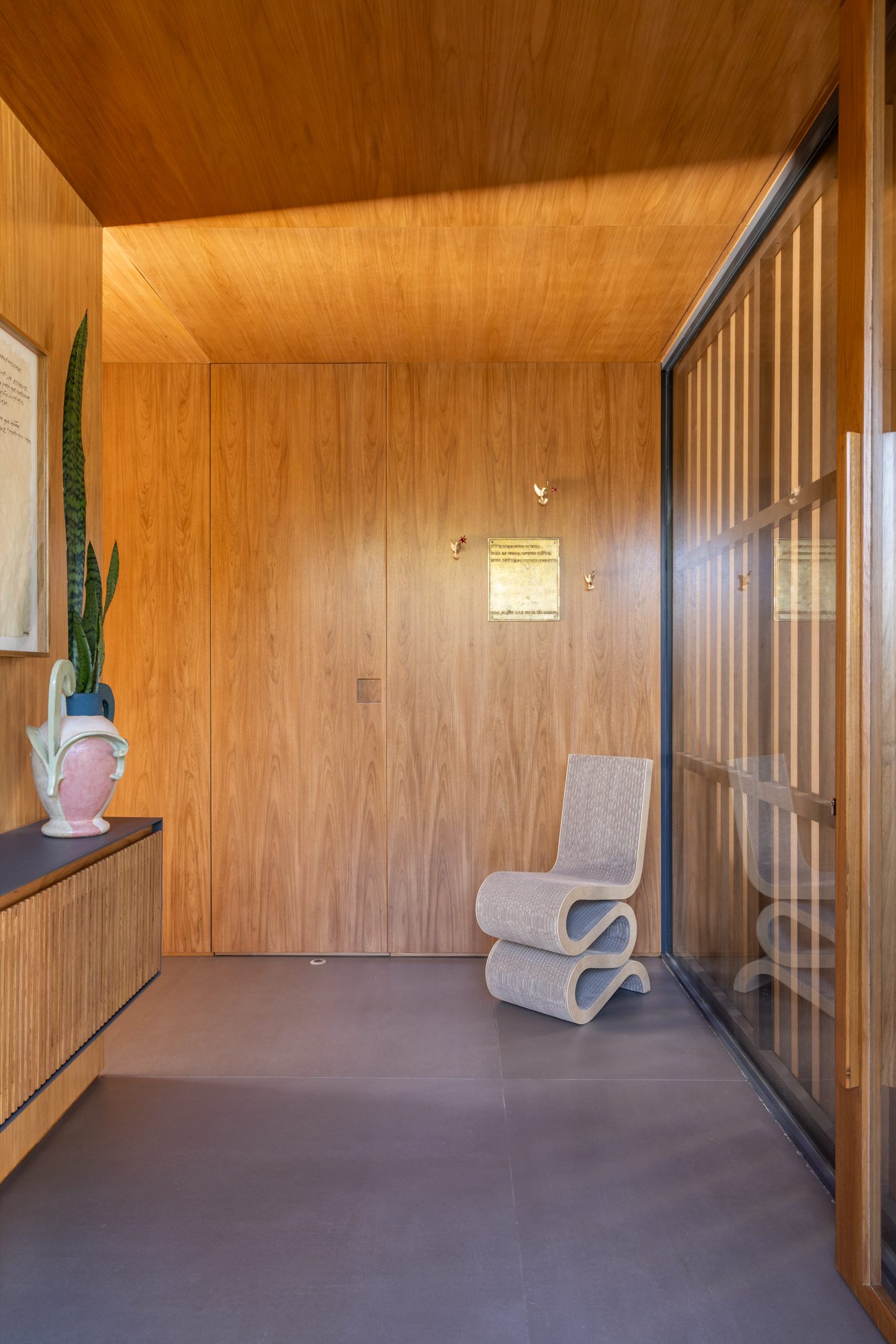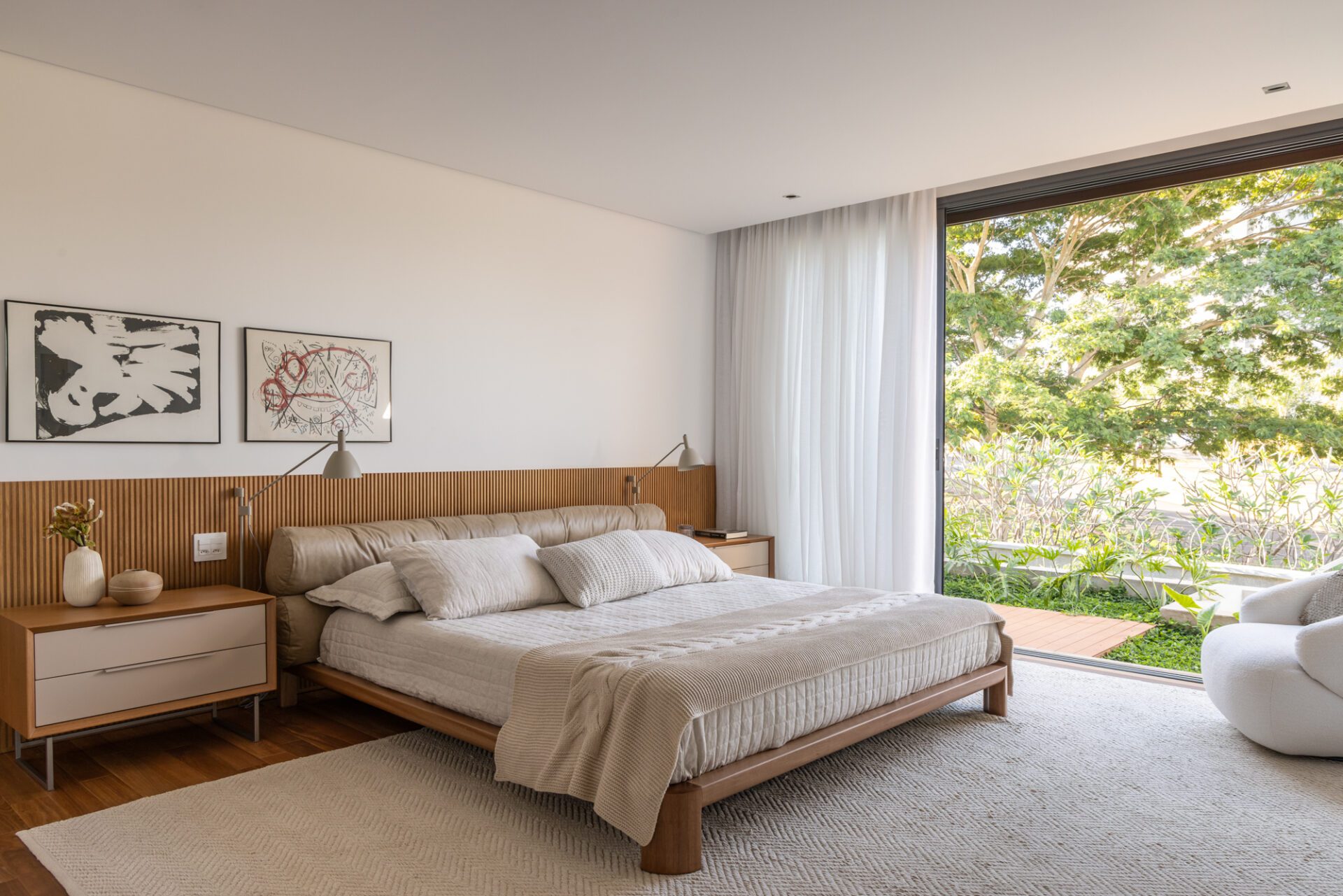 On the upper level, three east-facing suites are protected by wooden sliding screens that regulate light and airflow. The same logic found in the social areas continues here: built-in furniture, neutral tones, and a clear connection to the outdoors. Cumaru wood covers the floors and wall panels, giving the spaces warmth and a sense of material unity. The bedrooms are not designed for spectacle. They are made for rest, for stillness, for slow time.
