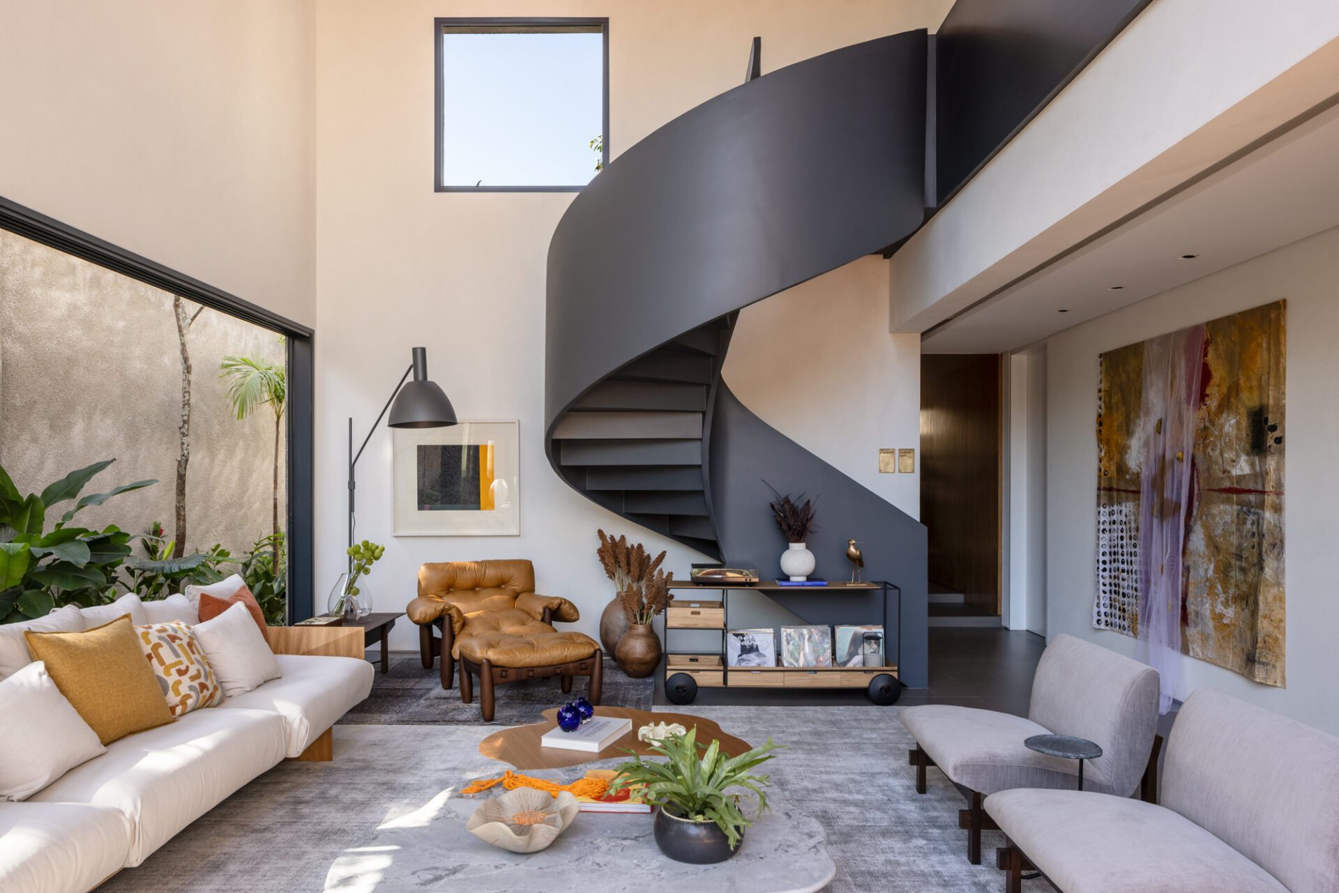 A spiral staircase made of metal marks the center of the house. Light and sculptural, it connects the two floors and functions as a turning point in the internal flow. Beside it, a custom piece by Brazilian designer Jader Almeida houses the family’s turntable and vinyl collection. This corner holds personal meaning. João often sits next to it in a classic “Poltrona Mole” to play his guitar. The soundtrack of the home includes Gilberto Gil, Gal Costa, Chico Buarque, David Bowie, and The Beatles. Music is a quiet presence that fills the interiors with emotion and rhythm.