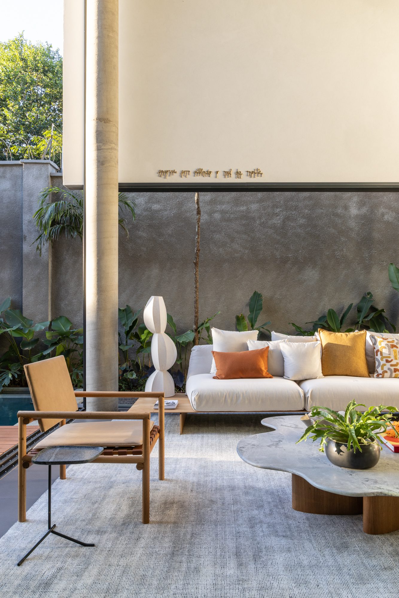 The selection of furniture celebrates Brazilian design in its many forms. Works by Jorge Zalszupin, Sergio Rodrigues, and contemporary creators are arranged with clarity and intention. Natural linen upholstery, stone surfaces, and solid wood pieces create a tactile landscape that is both grounded and timeless. Each item belongs to the space in which it sits. There is no excess, only purpose.