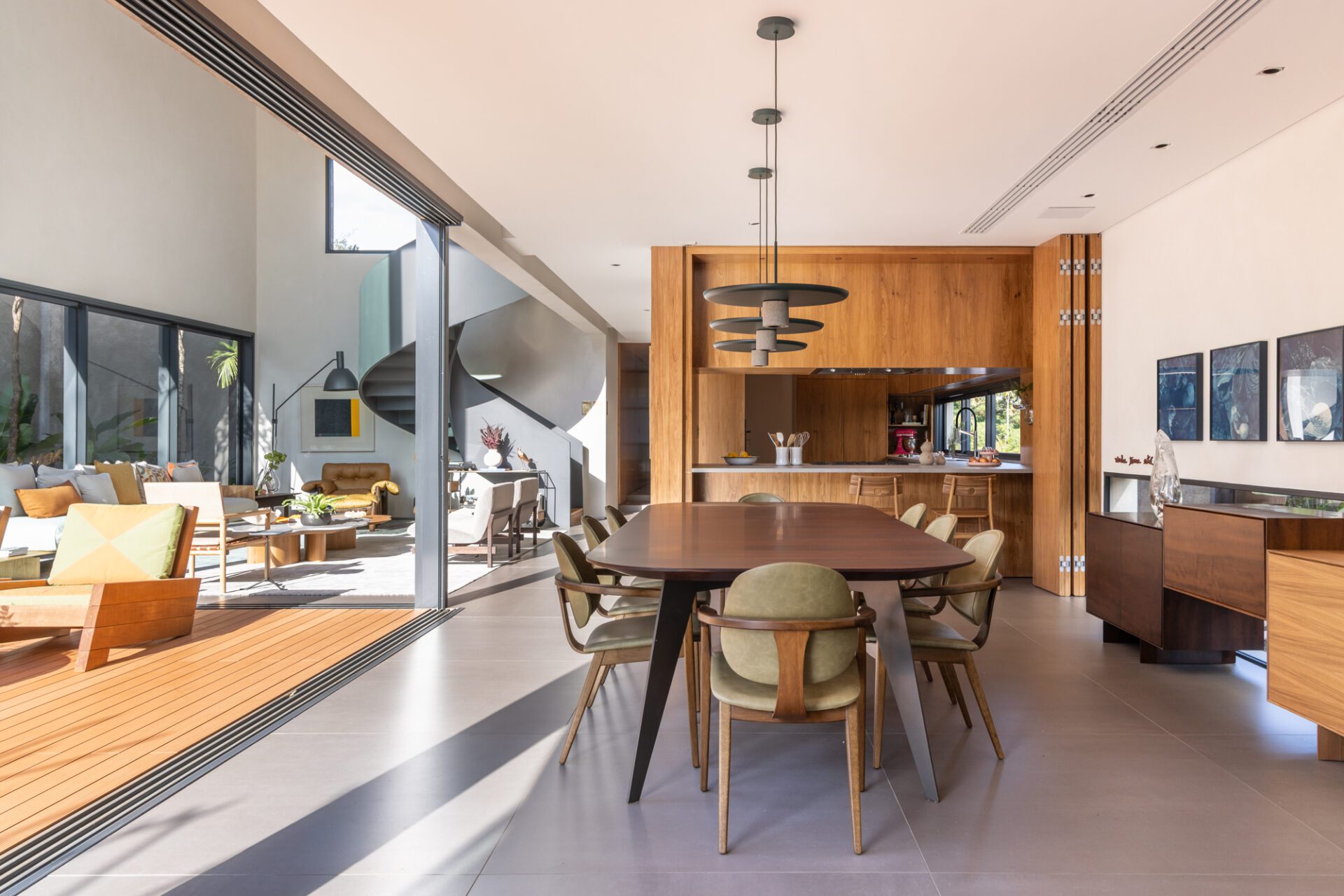 On the ground floor, the social areas ( living room, dining room, kitchen, and gourmet space) are laid out as a connected volume with varied degrees of openness. Between the kitchen and dining room, folding wood panels allow the space to be separated or fully opened depending on use.