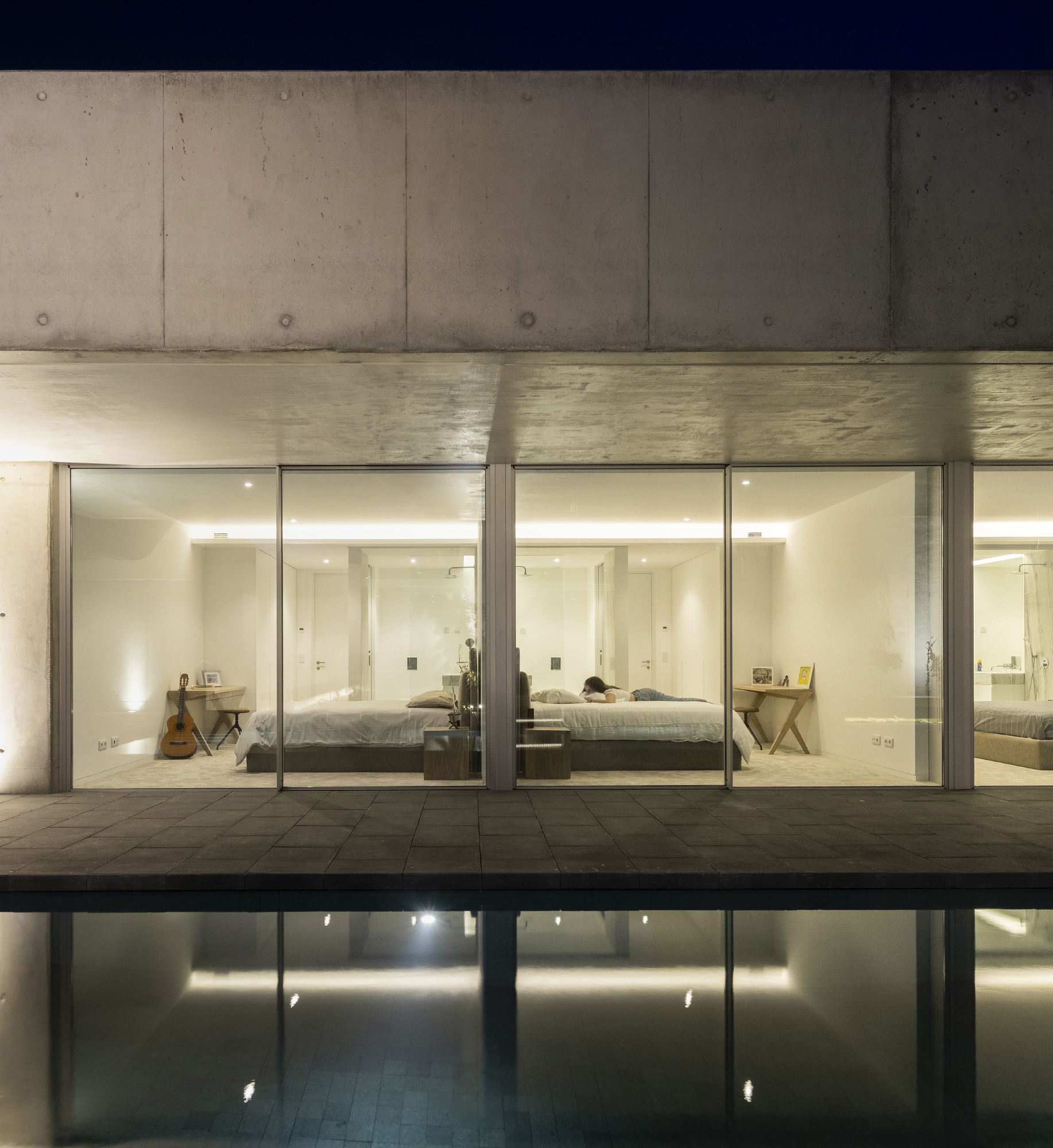 In a more reserved area, there are 4 bedrooms that open onto the garden. A central patio is a pivotal point for the entrances, a source of natural light and mainly a privileged zone for socializing outdoors. The way that was found to show the wall’s character was through the contrasting lightness of the house, which hides and seeks shelter through the force of the wall. Therefore, large glass walls provide a tenuous frontier between the inside of the house and the garden patio, because all of this is the house.