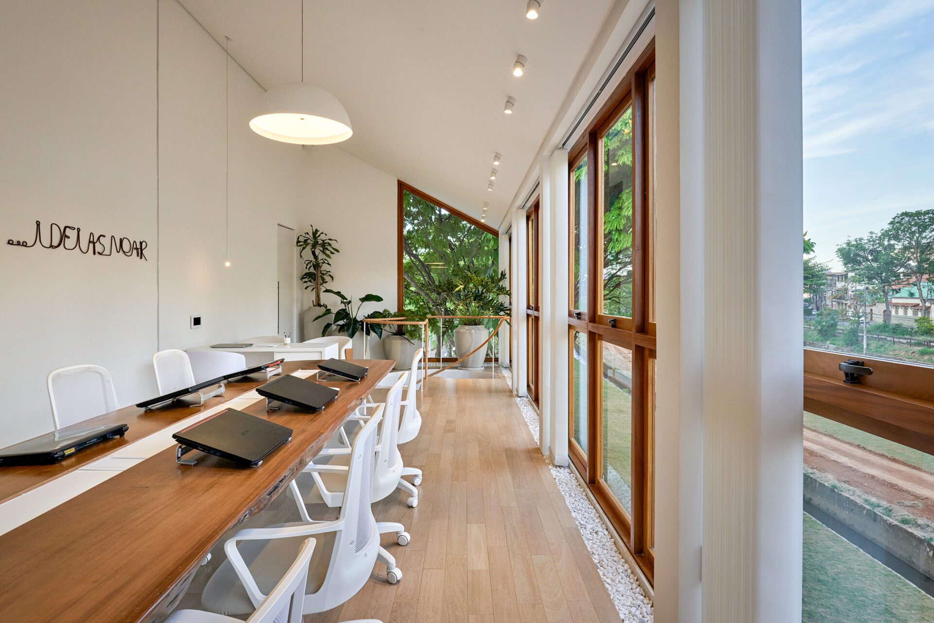 The conception of the building is marked by a playful design that evokes the affectionate image of a house, with gabled roofs and large windows. The “floating” volume follows the concept of a structure in the air, as Casa Noar aimed to complement the pre-existing construction without influencing its functioning. The addition of the new floor, completed in just seven months using Steel Frame technology, minimized impacts on the surroundings and maintained a commitment to sustainability through innovative solutions in thermal and acoustic comfort, as well as incorporating native vegetation and local labor.