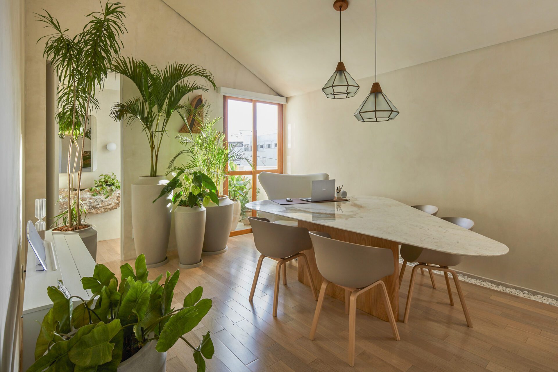 The Casa Noar internal distribution is organized around a central axis: the main room, which integrates the work of the entire team, opens to the kitchen and the model area. Away from the intense rhythm, the administrative and meeting sectors are located. This spatial freedom allows the office to also be used for gatherings and workshops. Together with Cafexó, which hosts events related to health, fashion, gastronomy, and architecture, the architectural complex and the square foster the appropriations responsible for the transformation that the project aimed for from its early sketches.