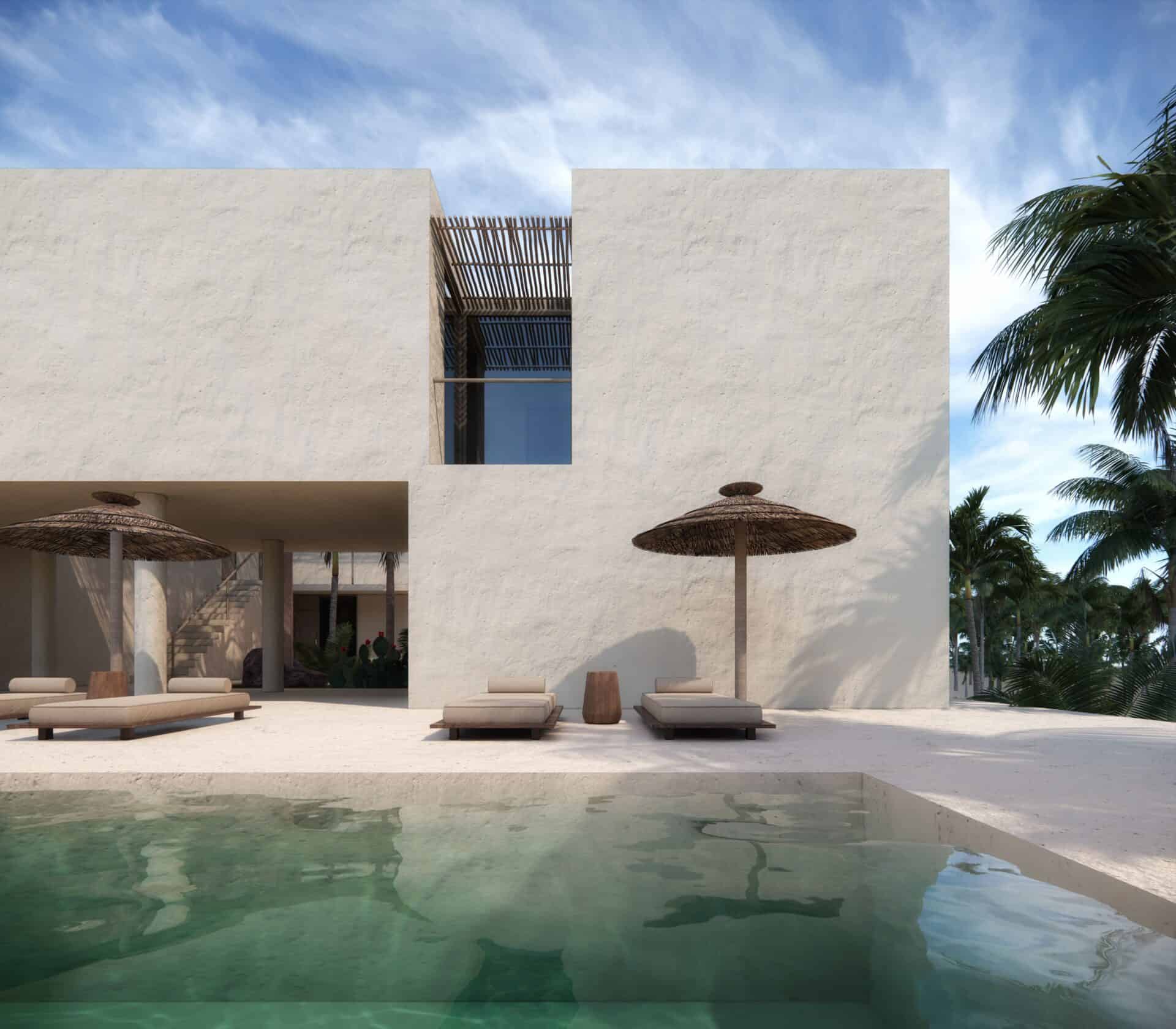 The architecture features a grid layout, balancing filled and open spaces for environmental comfort and structural efficiency. The robust structure is carved with three large openings: the entrance, which welcomes guests with a kitesurfing atmosphere; the living area integrated with a pool, offering a musical universe; and an opening to the sky. The design resembles a shelter sculpted by wind erosion on sedimentary rock.