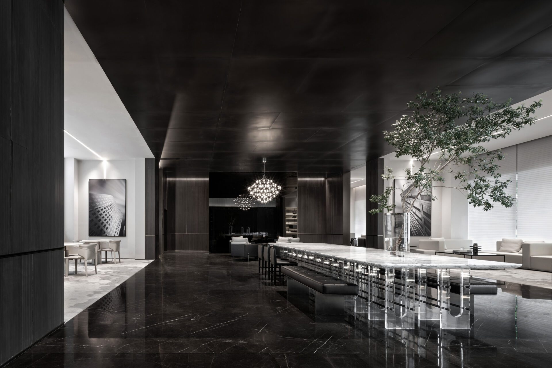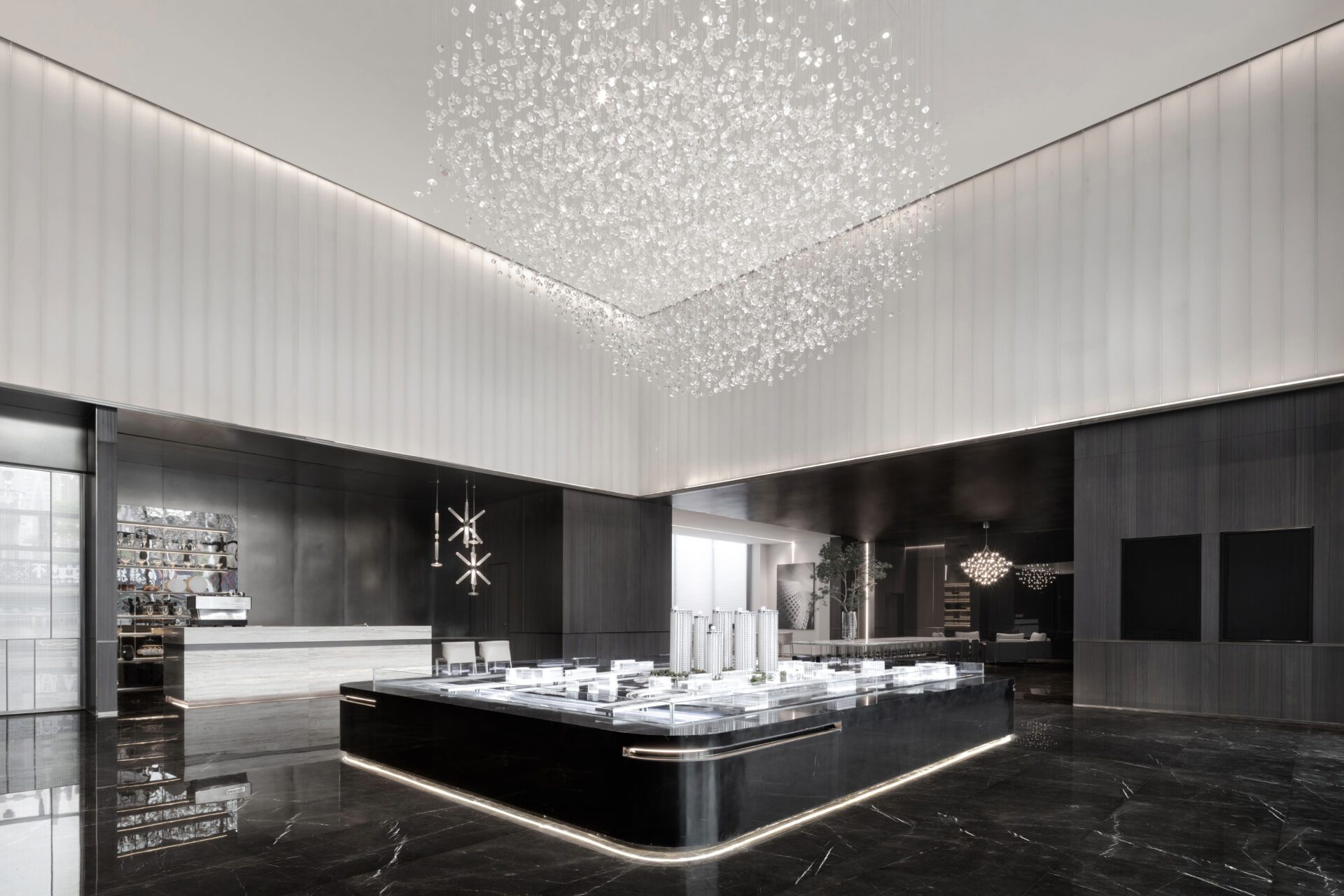The overall design of the sales center is based on black and white tones, and conceives a contemporary context to present the local mountain and water landscape. Black, white and grey hues dialogue with material textures, and the large area of geometric imagery and touching details create distinctive aesthetic scenes in different functional areas.
