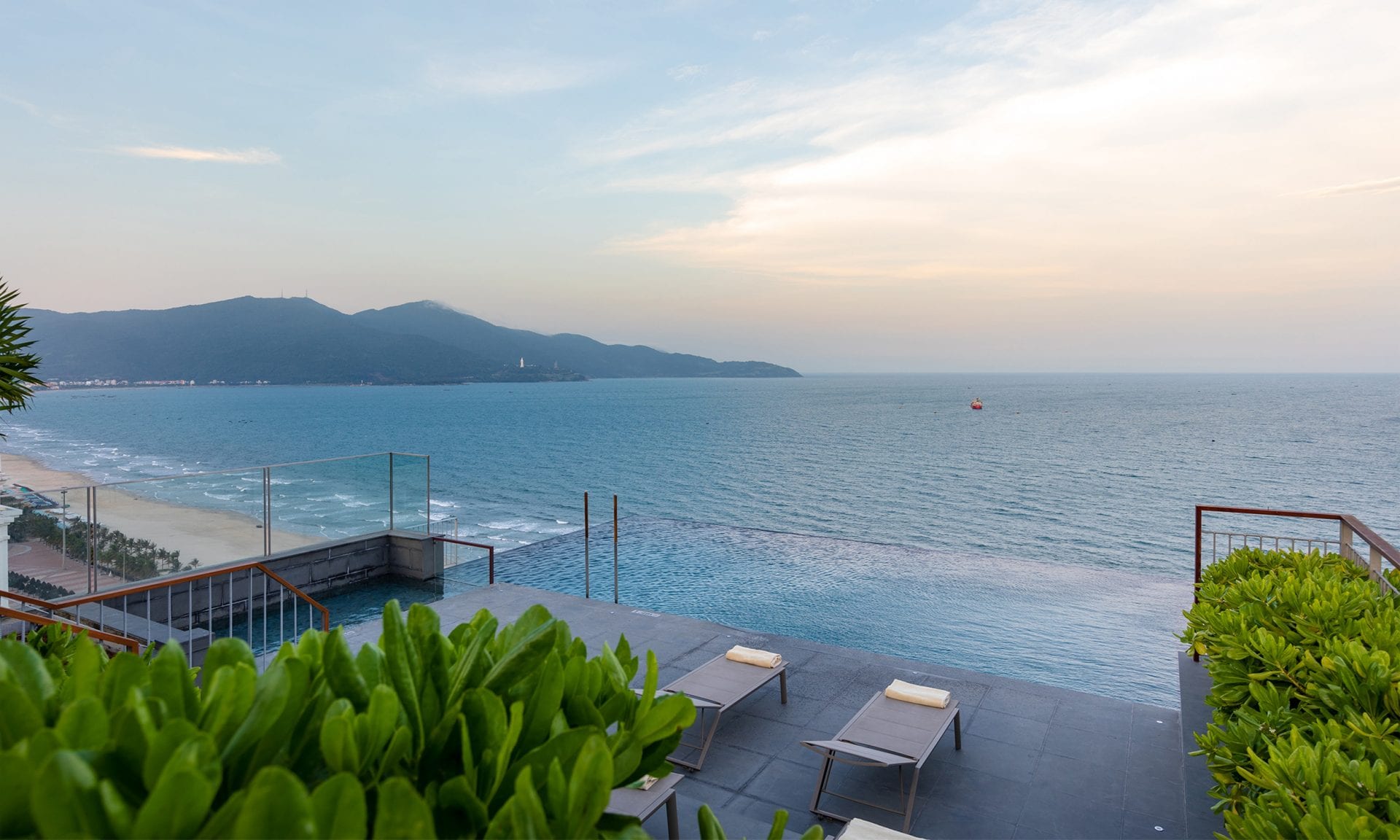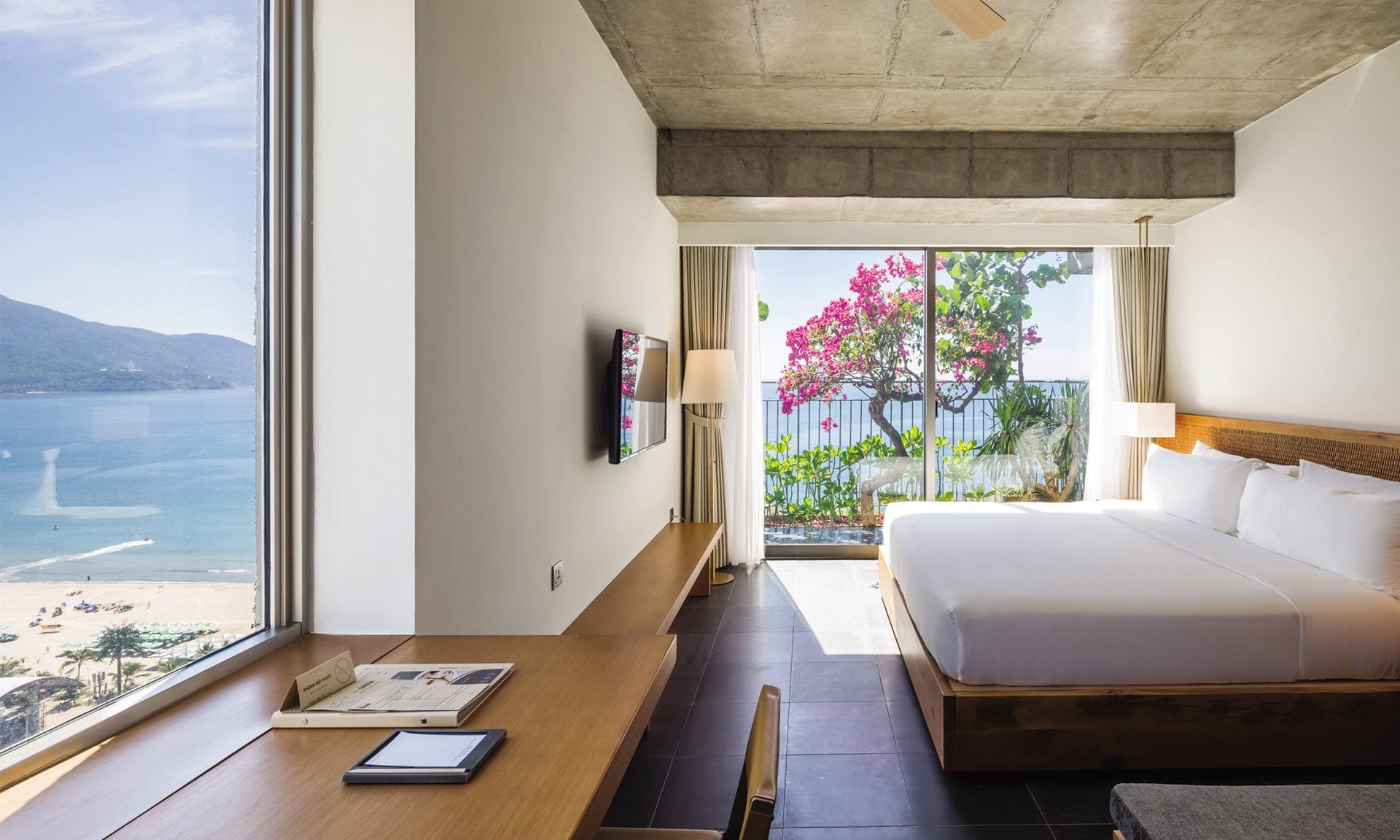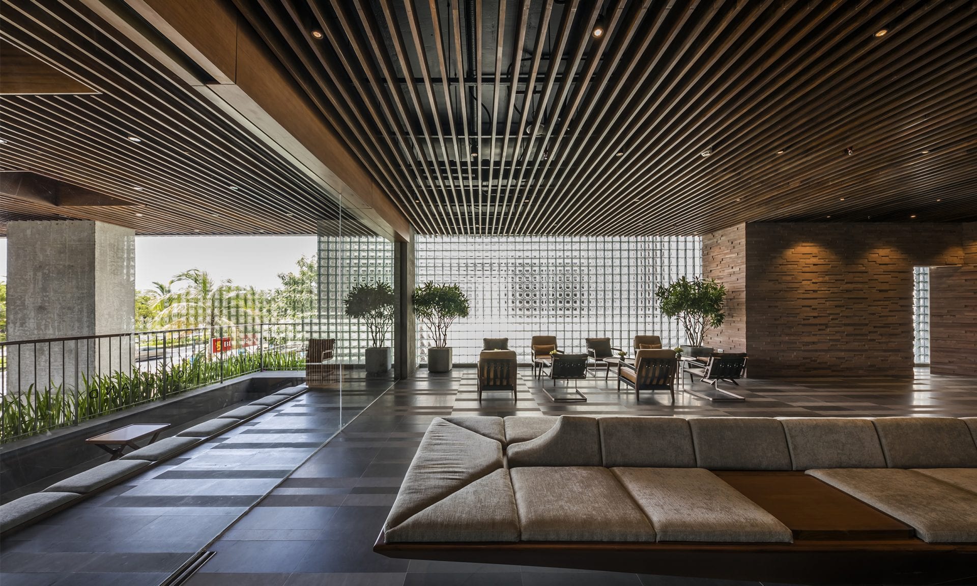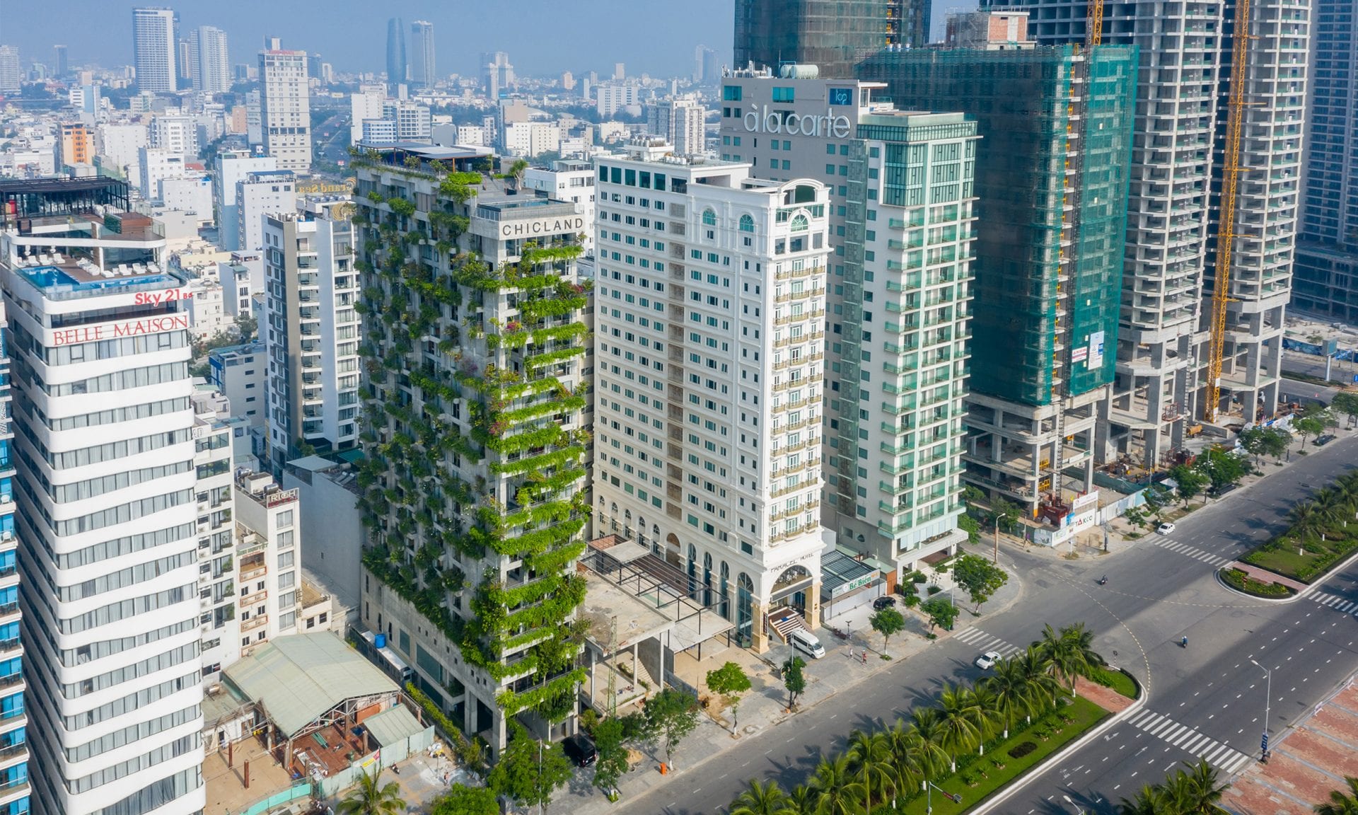 Chicland Hotel is a resort built to accommodate guests to feel the light from the sun and the wind and the fresh air of the Da Nang Sea. Located in the beautiful coastal city of Da Nang in the center of Vietnam, the hotel has 153 rooms on 21 floors covered by three vertical green facades forming a small forest. A green hotel really stands out and is different from the surrounding buildings and friendly to nature. - Da Nang's tropical climate means it experiences both a strong amount of sunlight and heavy rainfalls throughout the year. Therefore, creating vertical green façade systems on high-rise buildings and front of a beach was not easy. Chicland features a vertical facade design with concrete planters stacked on each floor to become sky gardens and green balconies for every room. Each balcony position had to be carefully studied by selecting plants at different levels, appropriate to the characteristics of the soil, water and local trees that are resistant to sea breezes. - The green facade also became the inspiration for the interior design. Furniture and interior materials are made from local or natural material: wood, stone, bamboo, rattan. All space uses maximum glass door systems to provide nature light, view and benefit from greenery facade.
